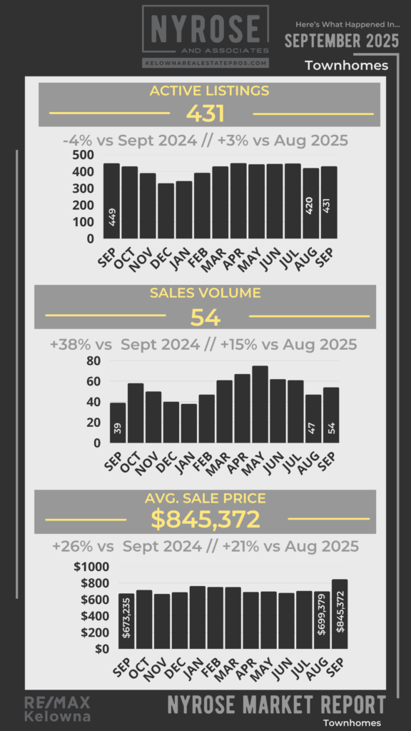 Kelowna’s townhome market is beginning to stir after a slower year. Traditionally the “meat and potatoes” of the market, activity was held back as many downsizers needed to sell a single-family home first, and upsizers needed to sell a condo before moving up. With sales improving in both those categories, townhomes are now showing signs of life. Year-over-year, numbers are up double digits, and if the housing ladder keeps moving, townhomes could be well-positioned for a stronger 2026.
