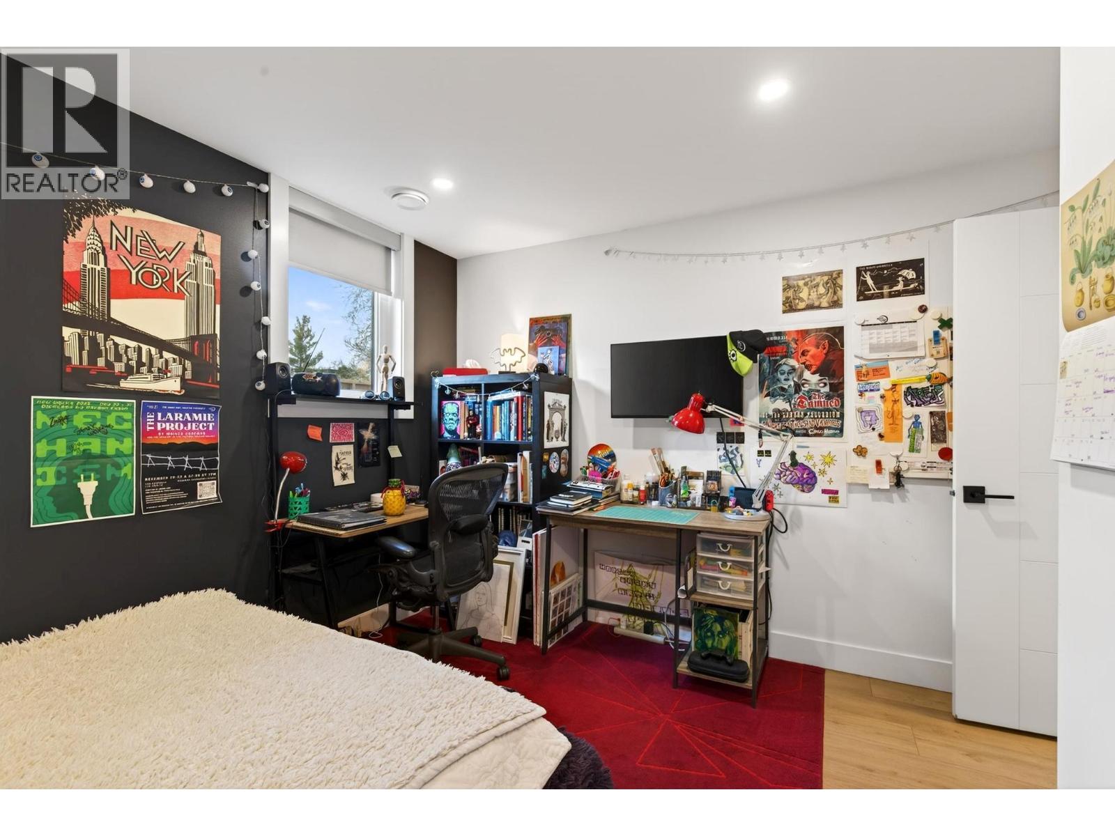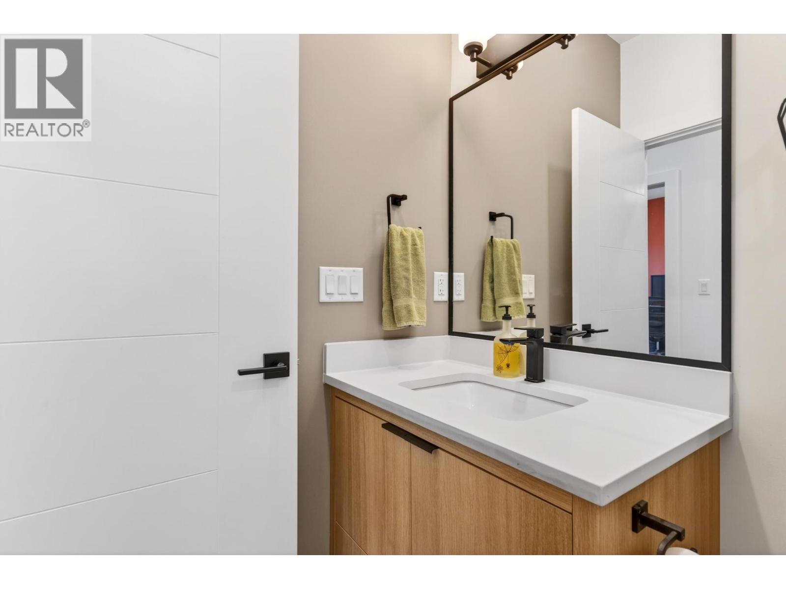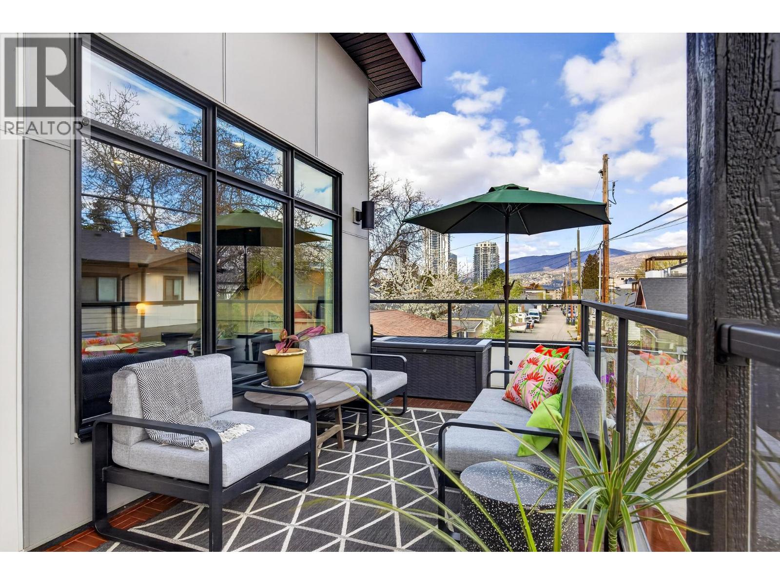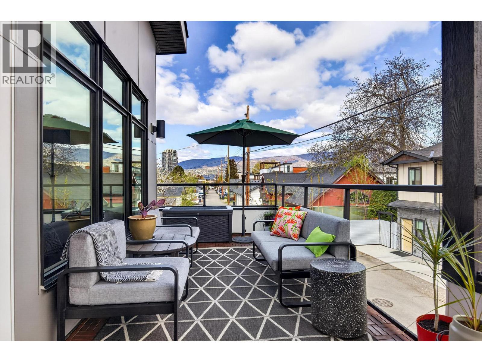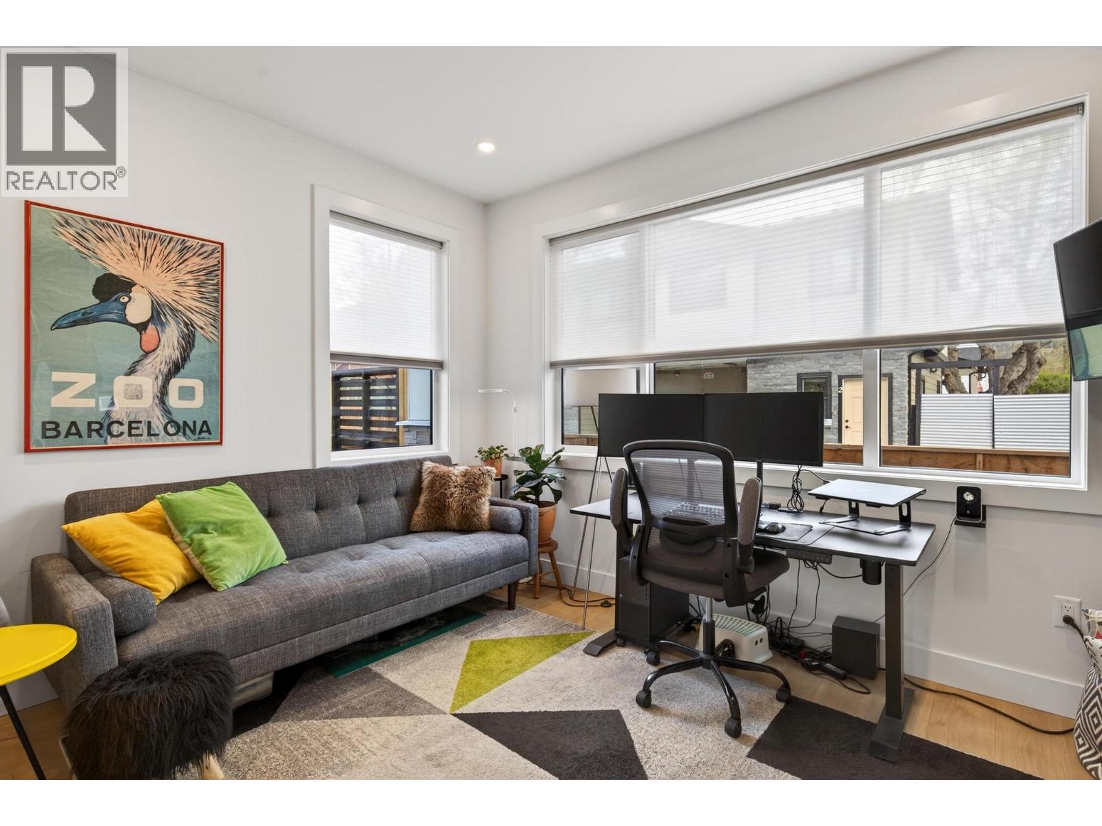 Rare 1,800 sq ft, 4-bed, 3-bath townhome in Downtown Kelowna — and this one comes completely turnkey! The sellers have added post-possession upgrades so you skip the landscaping, fencing, blinds, paint, and finish work that most new builds leave for year one. Upgrades include a custom fenced courtyard with gate and low-maintenance rock-scaping; automated blinds throughout; a designer paint package with accent walls and a full-height staircase feature wall; a custom mural wallpaper and black ceiling in the powder room; Ecobee thermostat; ceiling fan in the primary; added shelving in the foyer closet and kitchen; and a built-out garage with bike hangars. The entry level offers three bedrooms, a full bath, laundry, interior access to the private attached garage, and EV charger ready. Upstairs features 9-foot ceilings, oversized energy-efficient windows, a 10-foot quartz waterfall island, Fisher & Paykel panel-ready appliances, custom cabinetry, and a built-in bar with wine cooler. Living and dining open onto a covered patio with natural gas and built-in speakers. The primary suite is upstairs with a walk-through closet and 5-piece ensuite. Pet-friendly. Mountain and city views. Walking distance to everything downtown. (id:21321)