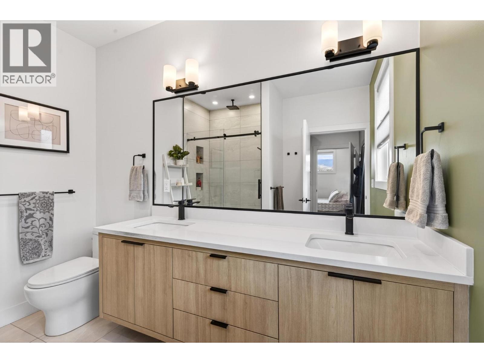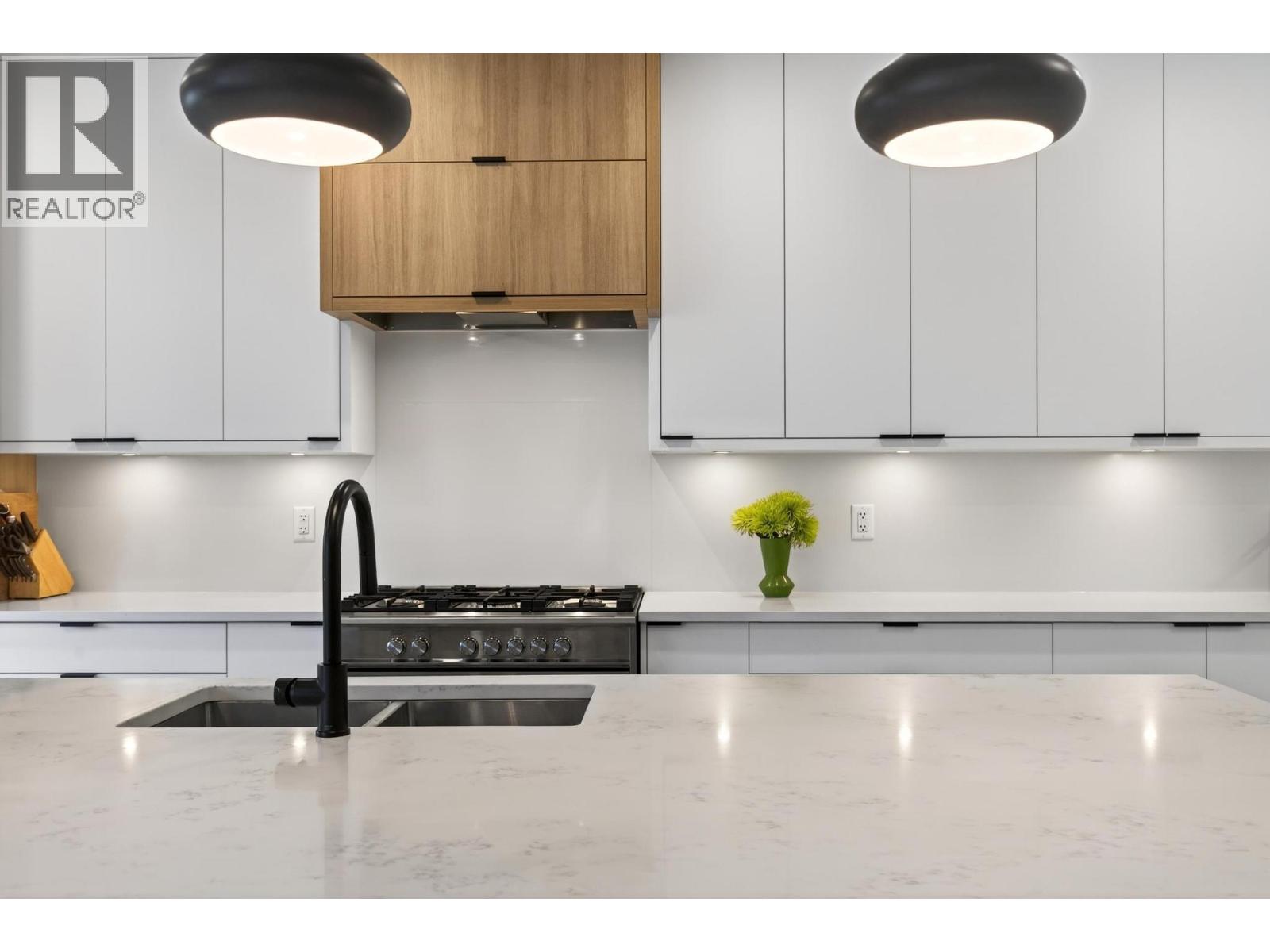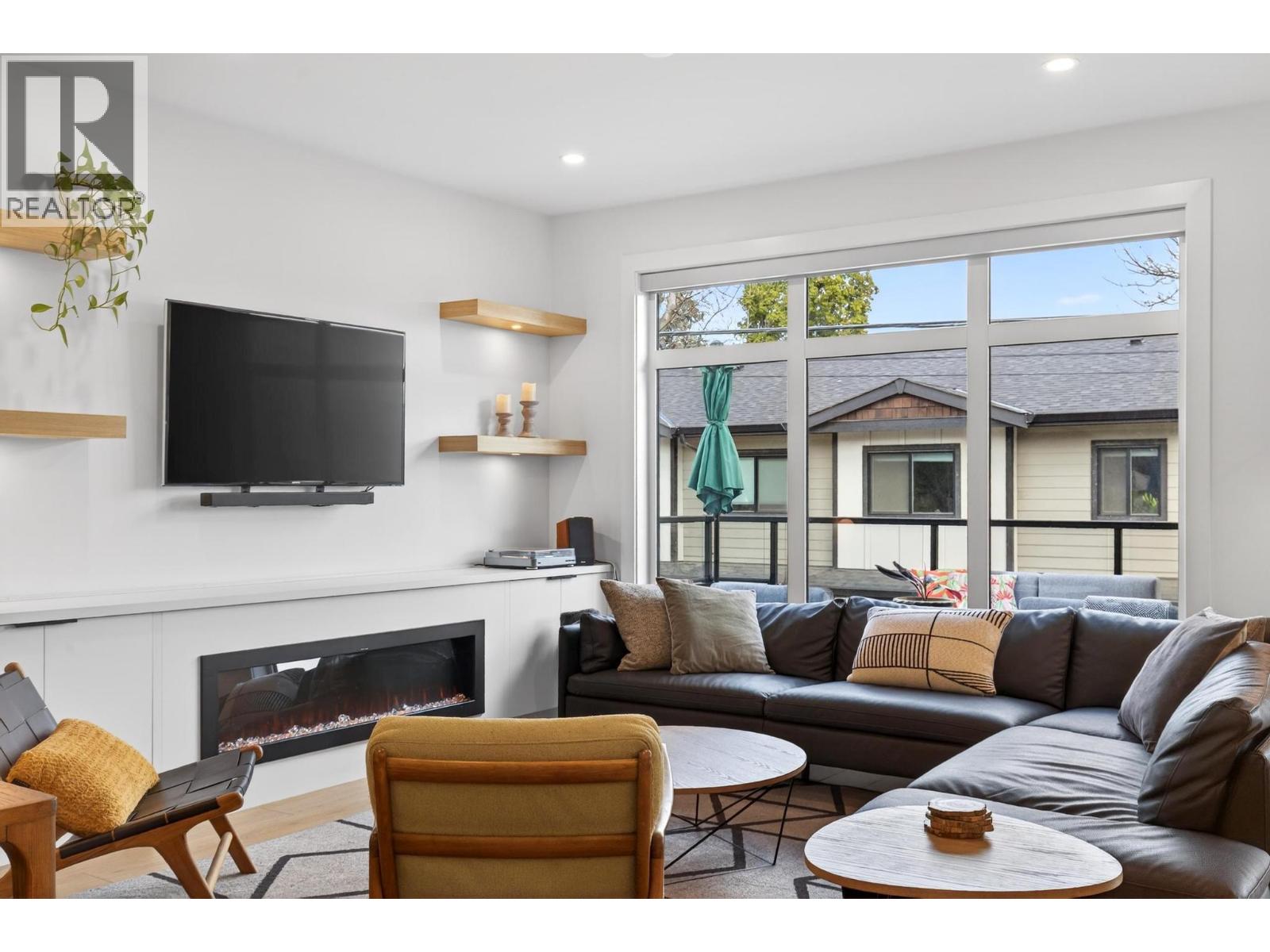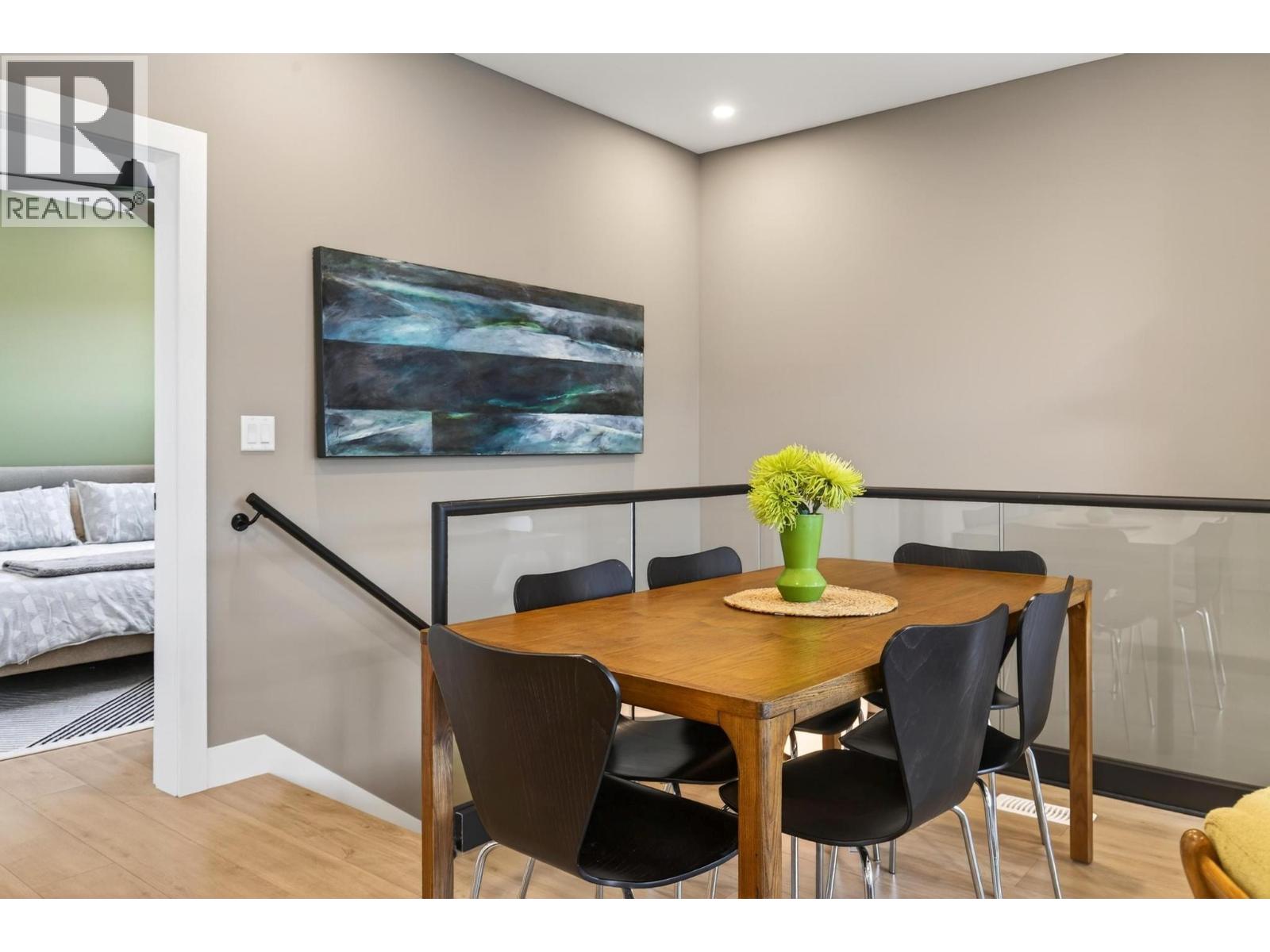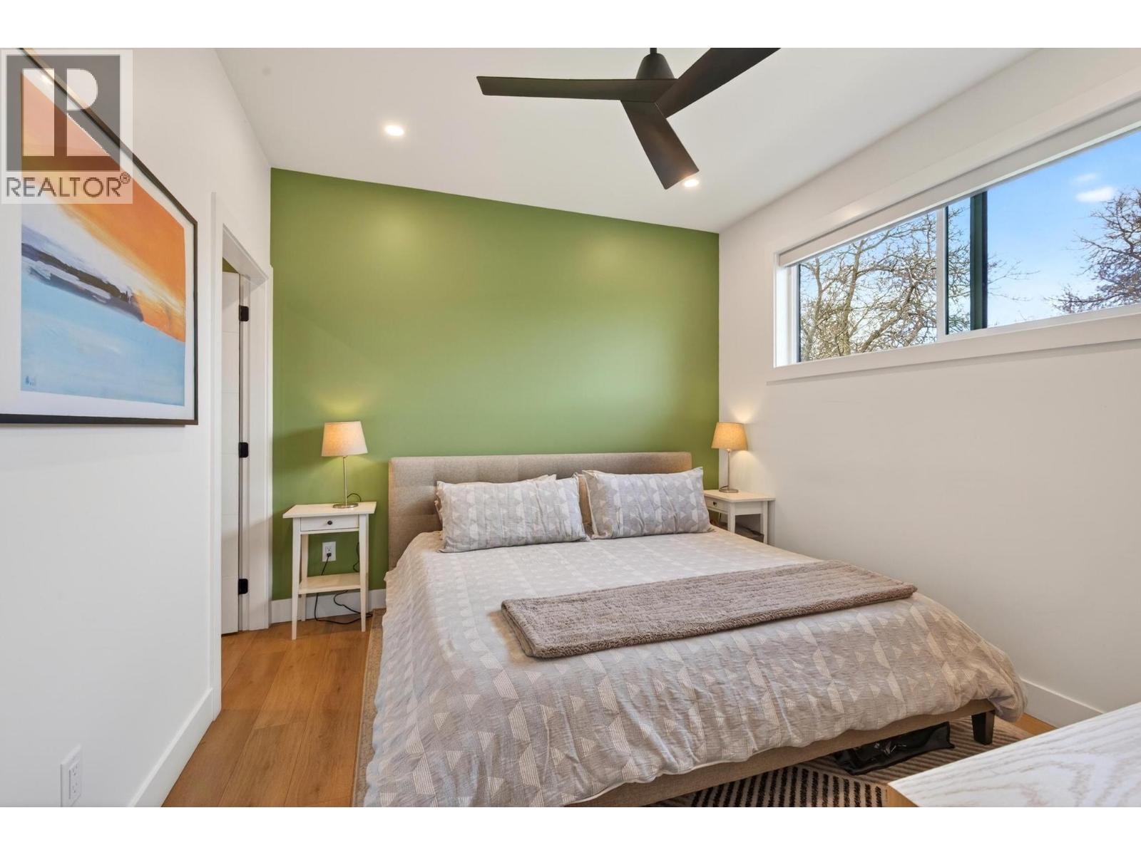 Rare 1,800 sq ft, 4-bed, 3-bath townhome in Downtown Kelowna — and this one comes completely turnkey! The sellers have added post-possession upgrades so you skip the landscaping, fencing, blinds, paint, and finish work that most new builds leave for year one. Upgrades include a custom fenced courtyard with gate and low-maintenance rock-scaping; automated blinds throughout; a designer paint package with accent walls and a full-height staircase feature wall; a custom mural wallpaper and black ceiling in the powder room; Ecobee thermostat; ceiling fan in the primary; added shelving in the foyer closet and kitchen; and a built-out garage with bike hangars. The entry level offers three bedrooms, a full bath, laundry, interior access to the private attached garage, and EV charger ready. Upstairs features 9-foot ceilings, oversized energy-efficient windows, a 10-foot quartz waterfall island, Fisher & Paykel panel-ready appliances, custom cabinetry, and a built-in bar with wine cooler. Living and dining open onto a covered patio with natural gas and built-in speakers. The primary suite is upstairs with a walk-through closet and 5-piece ensuite. Pet-friendly. Mountain and city views. Walking distance to everything downtown. (id:21321)