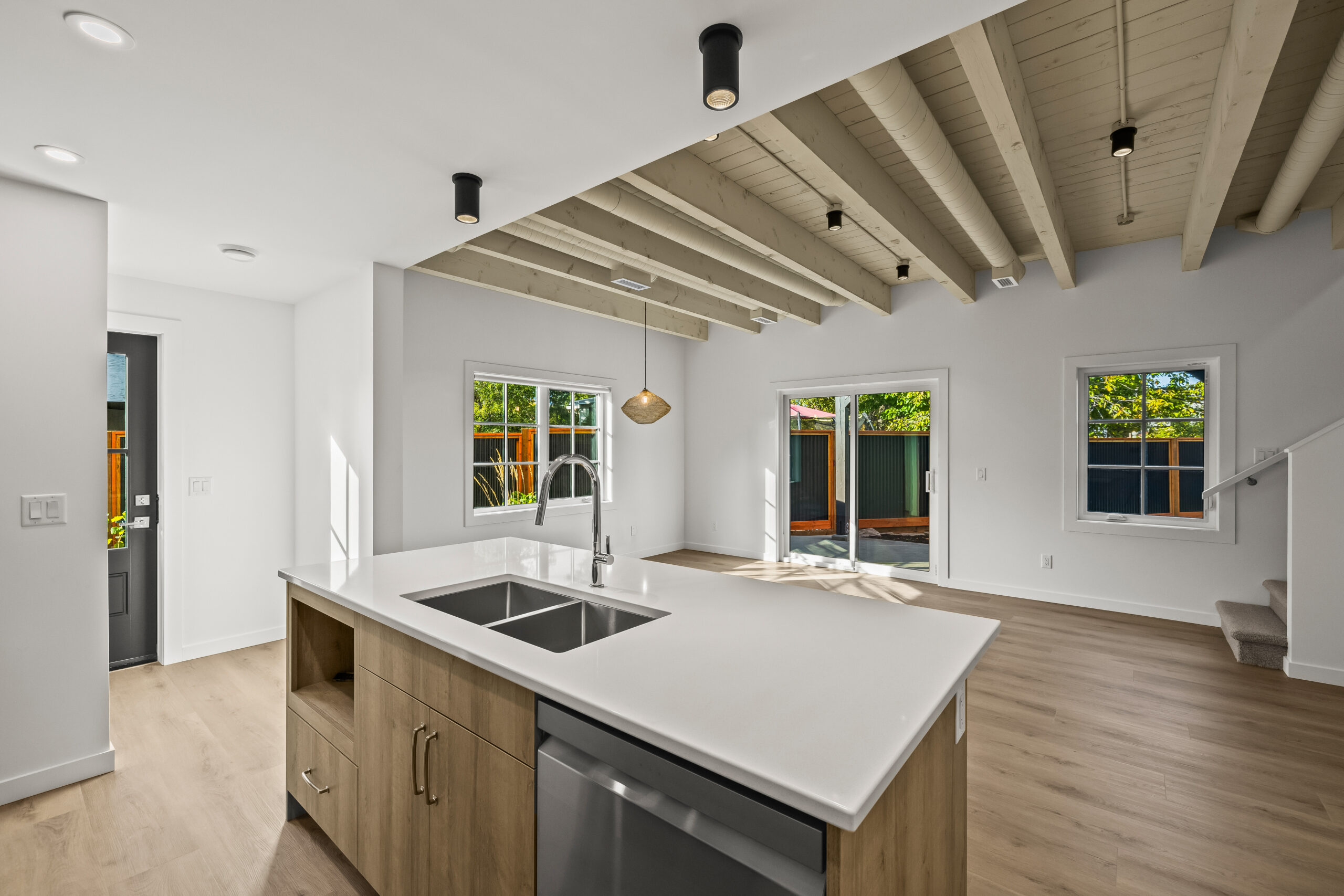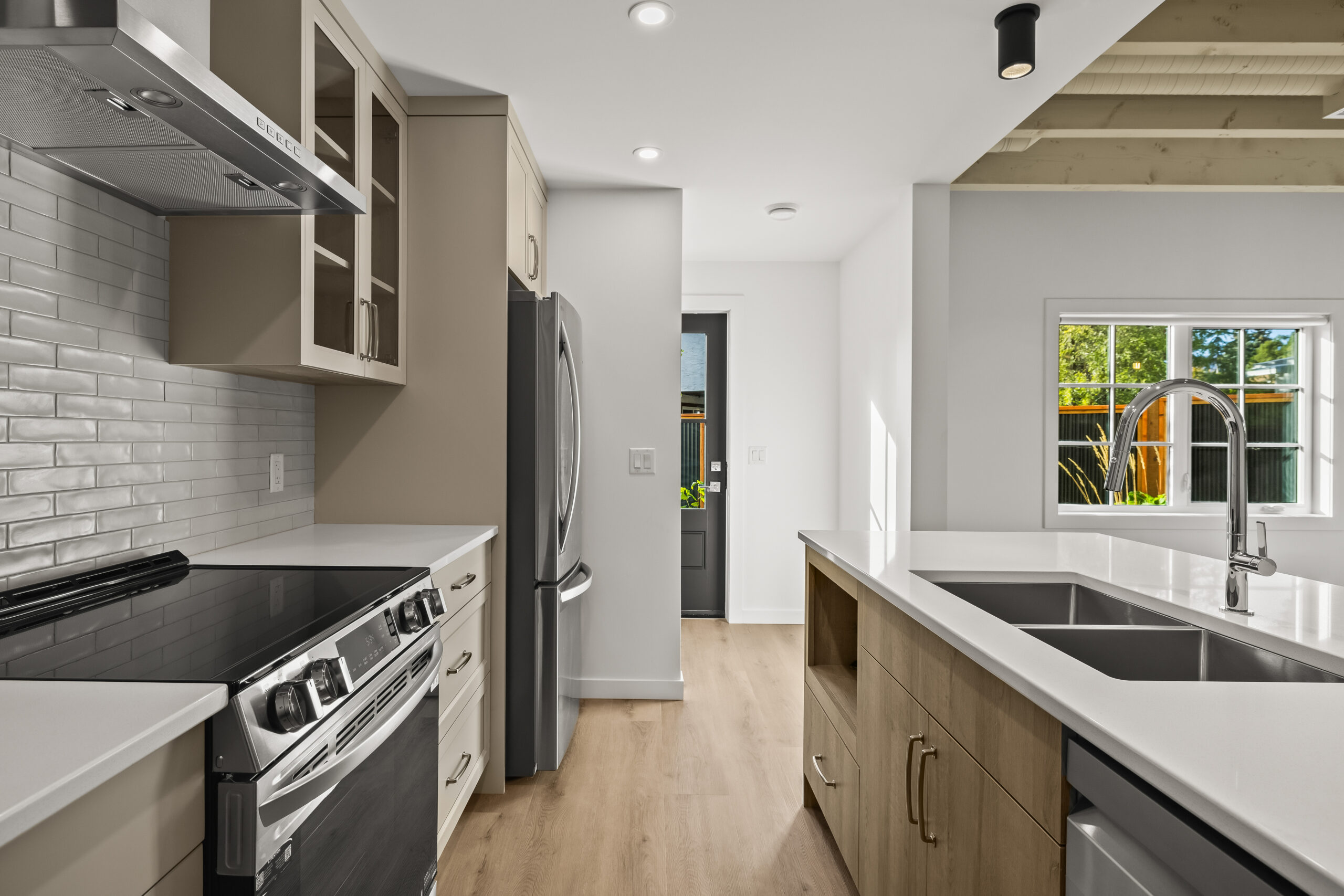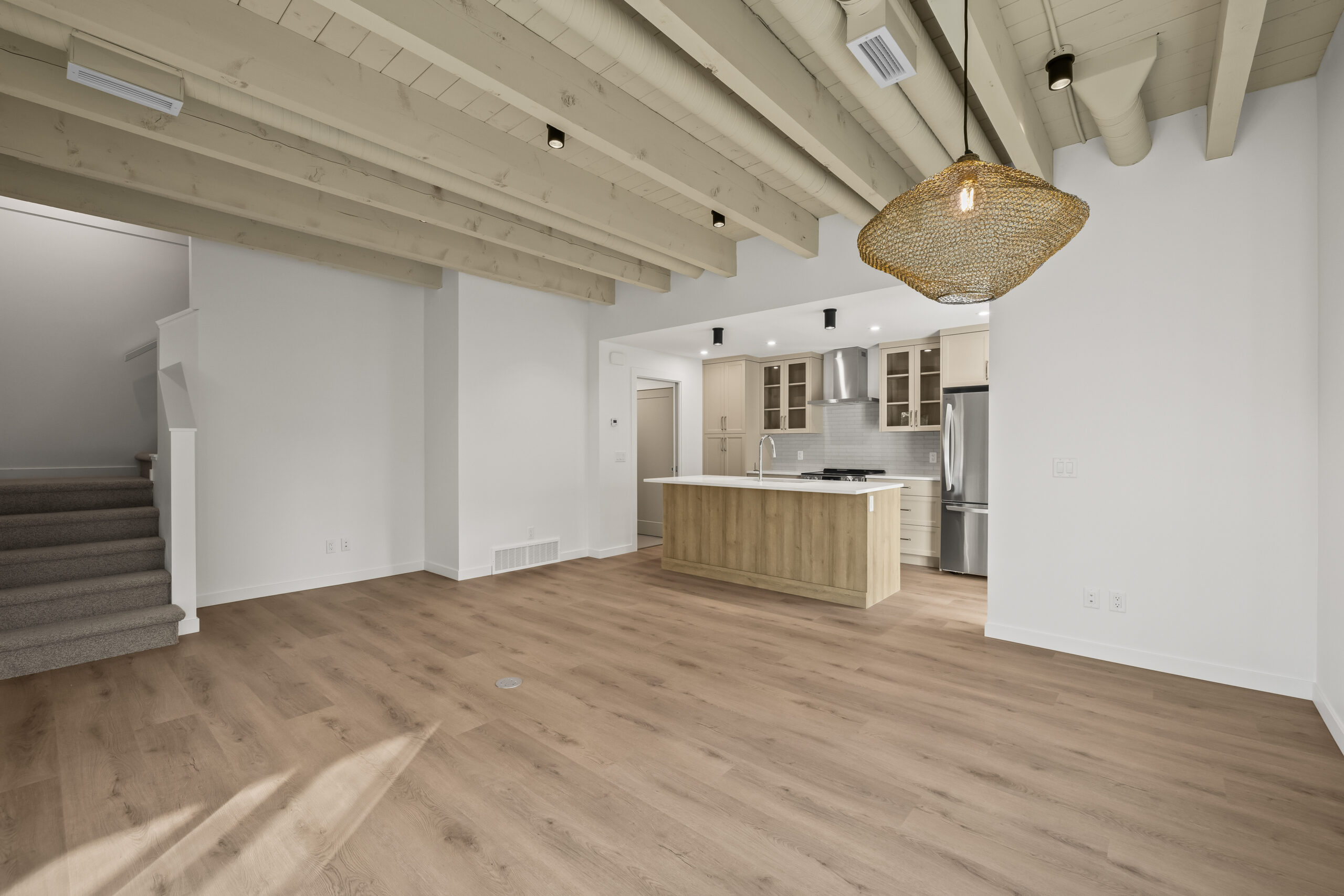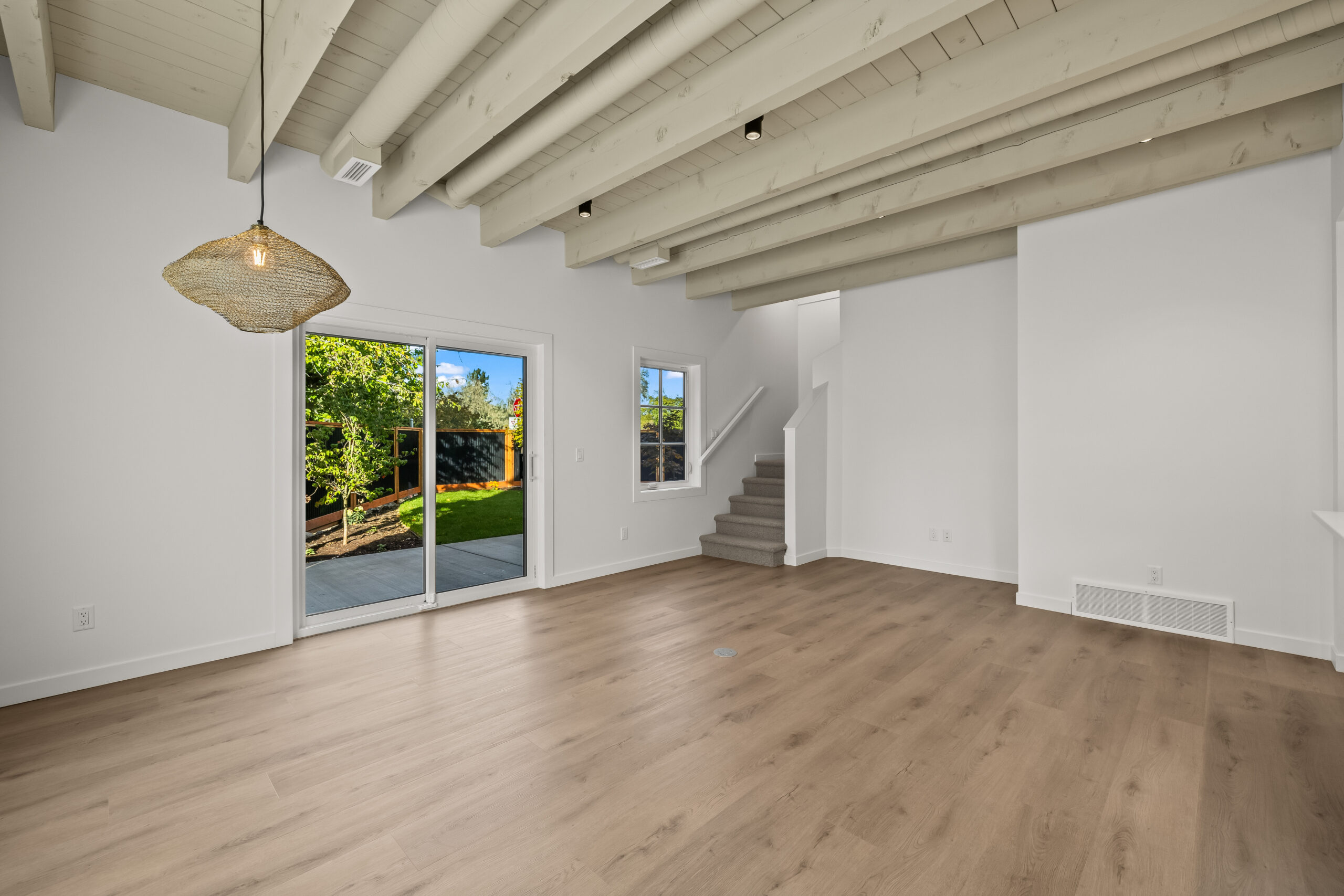 Part of an exclusive five-home collection by Worman Homes, this brand-new 4-bedroom residence offers the space, style, and comfort of a single-family home in a premium duplex setting. Its spacious private back yard makes it one of the most sought-after homes in the community — perfect for relaxing, entertaining, or enjoying sunny Kelowna days. Inside, you’ll find exposed timber ceilings, custom shaker cabinetry, quartz counters, LG appliances, and main floor laundry with a stacking Whirlpool washer/dryer, plus a powder room for guests. Upstairs, the primary suite features a dual-sink ensuite, with three additional bedrooms, a full bath, and a spacious bonus room perfect for a home office, playroom, or media room. With a double side-by-side garage, quiet cul-de-sac location, and proximity to Okanagan College, KLO Middle School, shops, dining, and the lake, this Worman-built home checks every box.