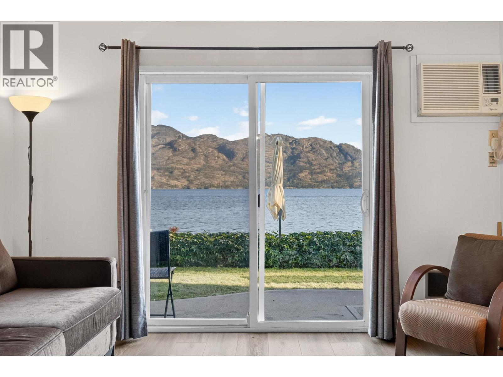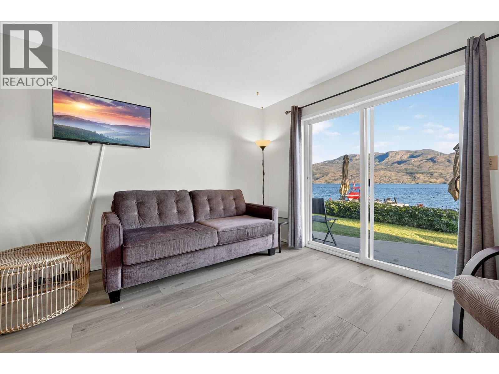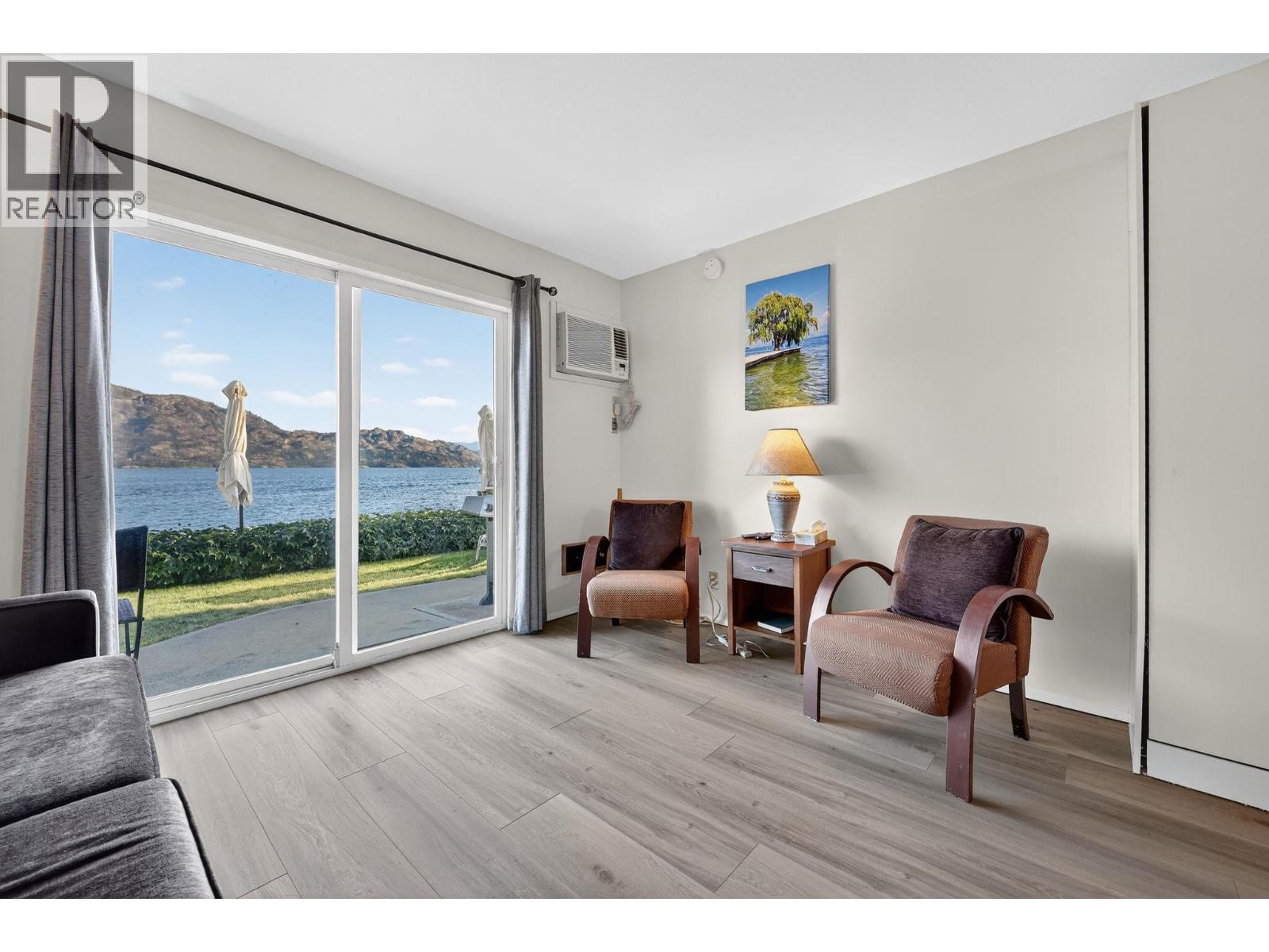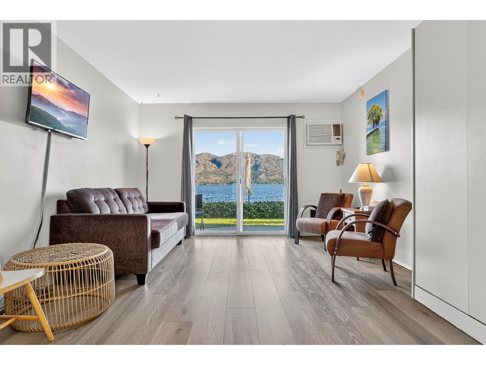 Own your own piece of Okanagan lake front! Best kept secret in the area. This open concept, air conditioned condo in a secure gated community has everything you need to spend your summers on the lake. Sleeps 4, fully furnished, with a new hide a bed, a murphy bed with a new mattress, newer smart TV, tables, chairs and even pots, pans, dishware, glasses, cutlery and a BBQ. New laminate flooring this past year. Wake upright beside the lake and enjoy the lakefront breeze while having a morning cup of coffee on your patio beside the water. Extra storage and 1 assigned parking spot. The resort life comes with many amenities such as boat moorage in the private marina, a clubhouse, private shared dock, boat launch, boat trailer parking, fire pits, coin laundry and ice machine. Telus fibre optic WIFI is available and for extra security the marina and guest parking is monitored by cameras. Great for rental income when you aren't using it yourself. Come see for yourself what lake life can be like. Don't miss out on this great opportunity. These units don't come up for sale very often. (id:21321)
