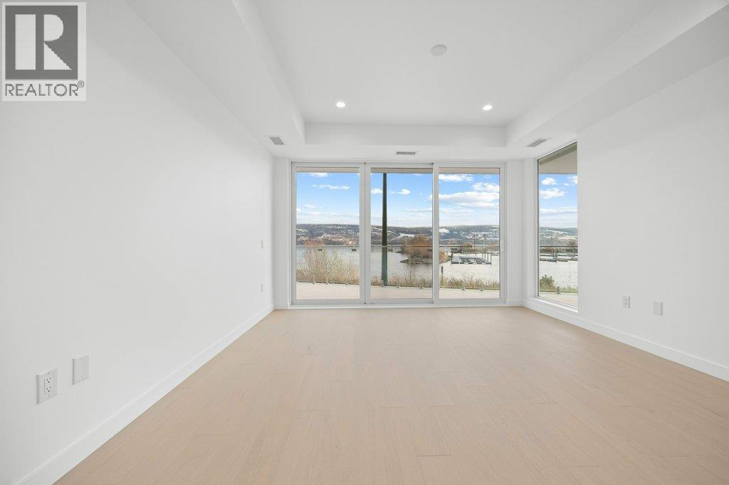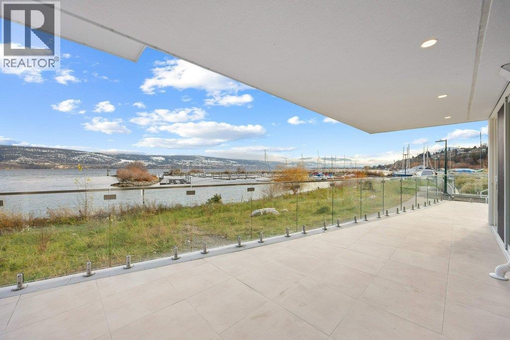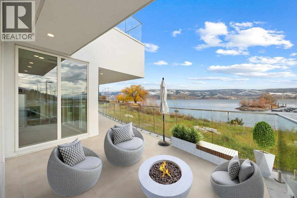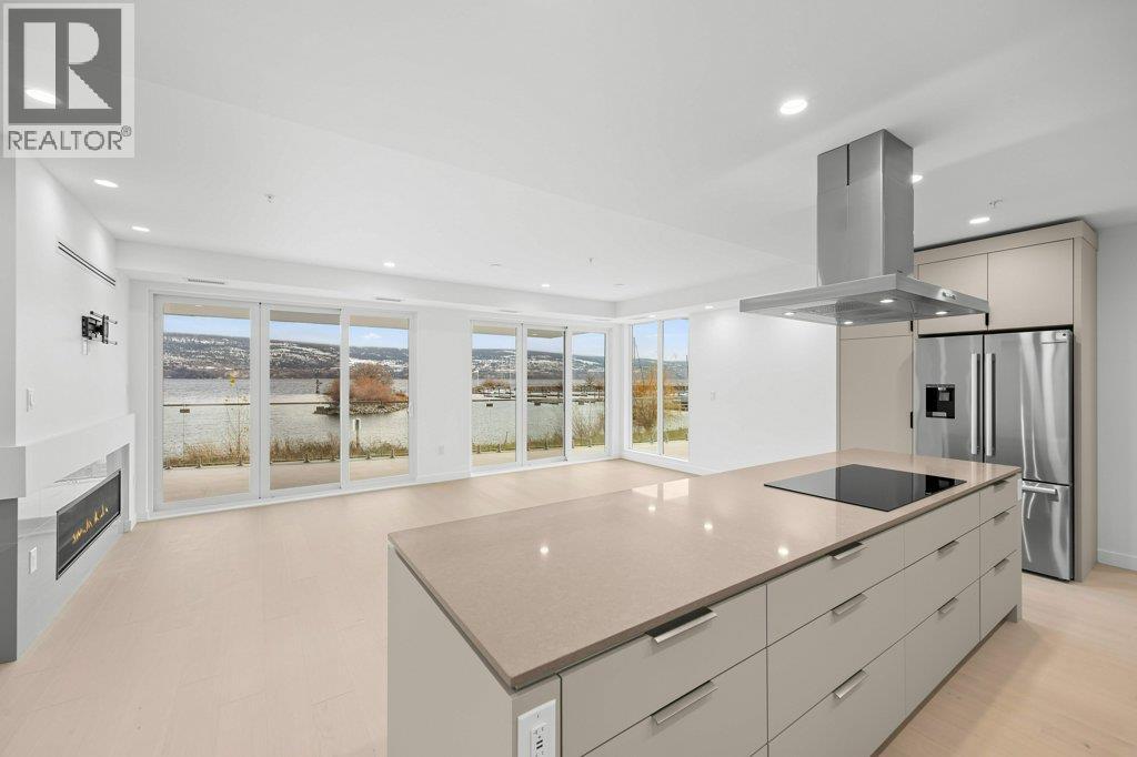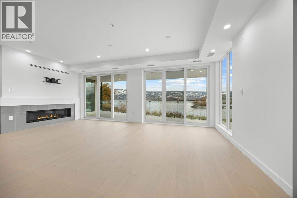 This gorgeous, luxurious, brand-new ground level lake front home awaits you, with expansive views that dreams are made of. Lavish 2 Bedroom & Den, 1829 sq ft, high ceilings, open floor plan, lovely gas fireplace for cozy winter nights, upgraded hardwood & tile throughout, quartz countertops: This Riviera living style blends coastal chic with Mediterranean elegance. Experience joyful meal prep & entertaining with the Bosch appliance package, oversized island, ample cabinetry & lake views galore. Enjoy spectacular Okanagan outdoor living on the 731 sq ft porcelain paver deck with NG BBQ outlet. The laundry room is spacious - includes countertop, sink, cabinetry, & large adjoining pantry. The mechanical room has a NG forced air furnace & there is central air, for hot summer nights. The upgraded electrical package accommodates ceiling fans if desired, & rear wall speakers to enjoy true surround sound. Construction of this complex is steel & concrete – only the best will do! 2 secure parking stalls are included in the heated garage, the breezeway from parkade to front door is tiled with luxury porcelain pavers, and there is a 260 sq ft, private & secure, heated storage unit included. The Oasis is just steps away from several beaches, water park, dog park, extensive waterfront walking paths, & upscale Shaughnessy’s Cove, for dining out with family and friends. Dreams can come true – your Oasis awaits you! Please contact your favourite Realtor to view. Measurements by iGuide. (id:21321)