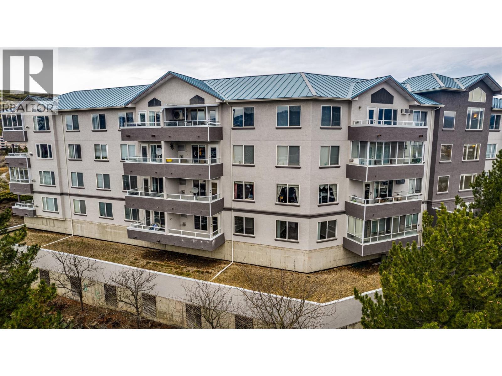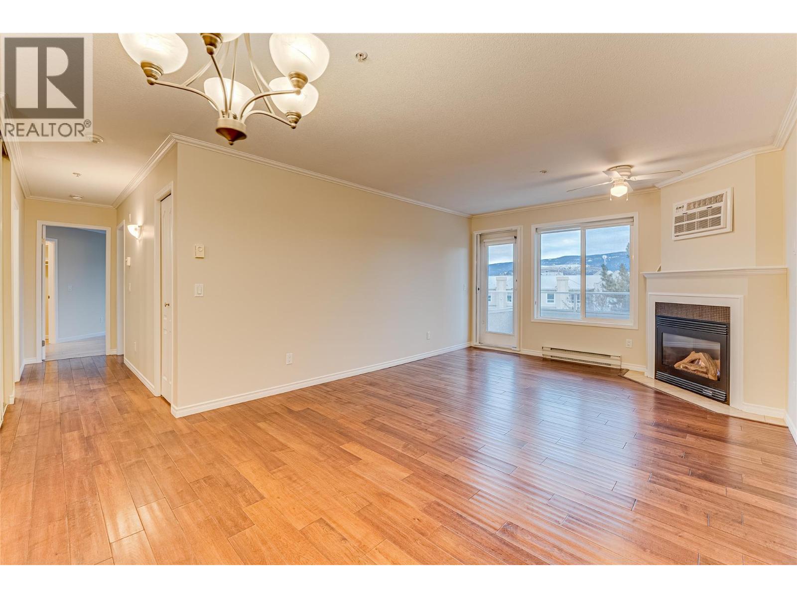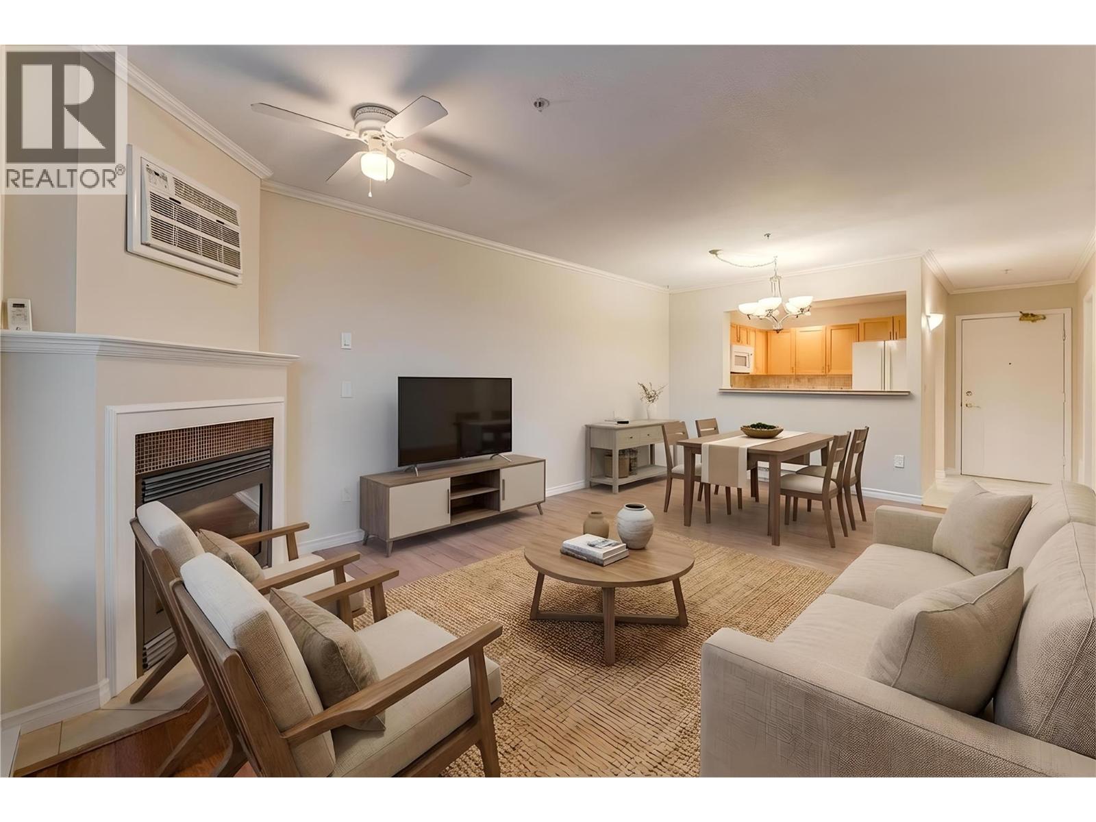 Welcome to Unit #102 at Imperial Ridge. With a fresh coat of paint, recently updated flooring, and a lovely kitchen, this 2-bedroom, 2-bathroom condo is truly move-in ready. The home is located in a well-maintained, all-ages building that has undergone extensive upgrades since 2022, including parkade improvements, building envelope work (windows, decks, stucco), a new elevator, and refreshed hallways with modern carpeting, lighting, and paint. Ideally located just steps from downtown Vernon’s shops, cafes, medical offices, and services, this quiet, south-facing home is filled with natural light and enjoys beautiful city views, with glimpses of Okanagan Lake. The spacious layout offers a modern kitchen with plenty of storage, opening into the dining area and comfortable living room. Enjoy the cozy gas fireplace on cooler days (natural gas included in the strata fee), and in summer relax on your private deck or stay cool with the newer wall-mounted A/C unit. The primary bedroom features a walk-in closet and full ensuite, while the second bedroom and full main bathroom provide flexibility for guests, a home office, or family. In-suite laundry with newer washer and dryer adds everyday convenience. Additional features include one secure underground parking stall, a storage locker, bike storage, and a common room. Strata fees include hot water, water, sewer, garbage, natural gas. Book your showing today! (id:21321)