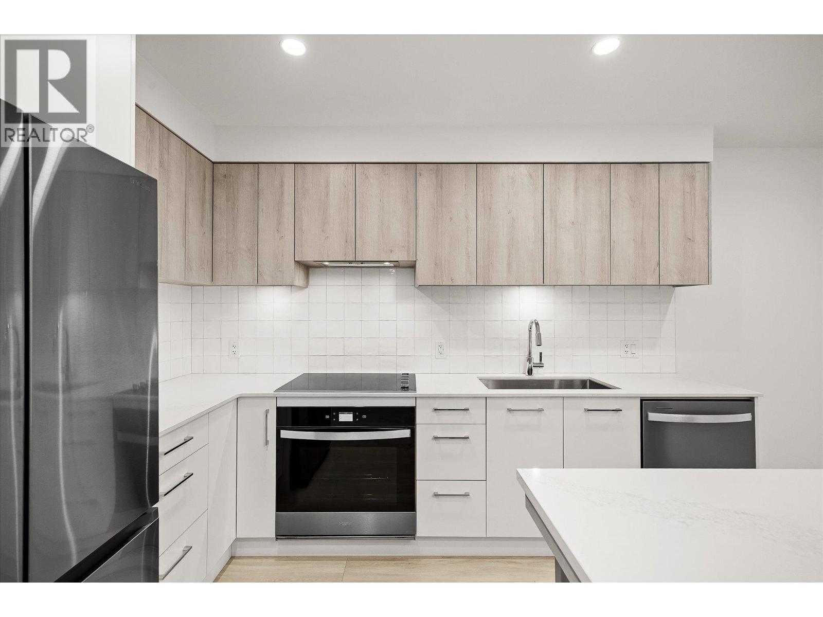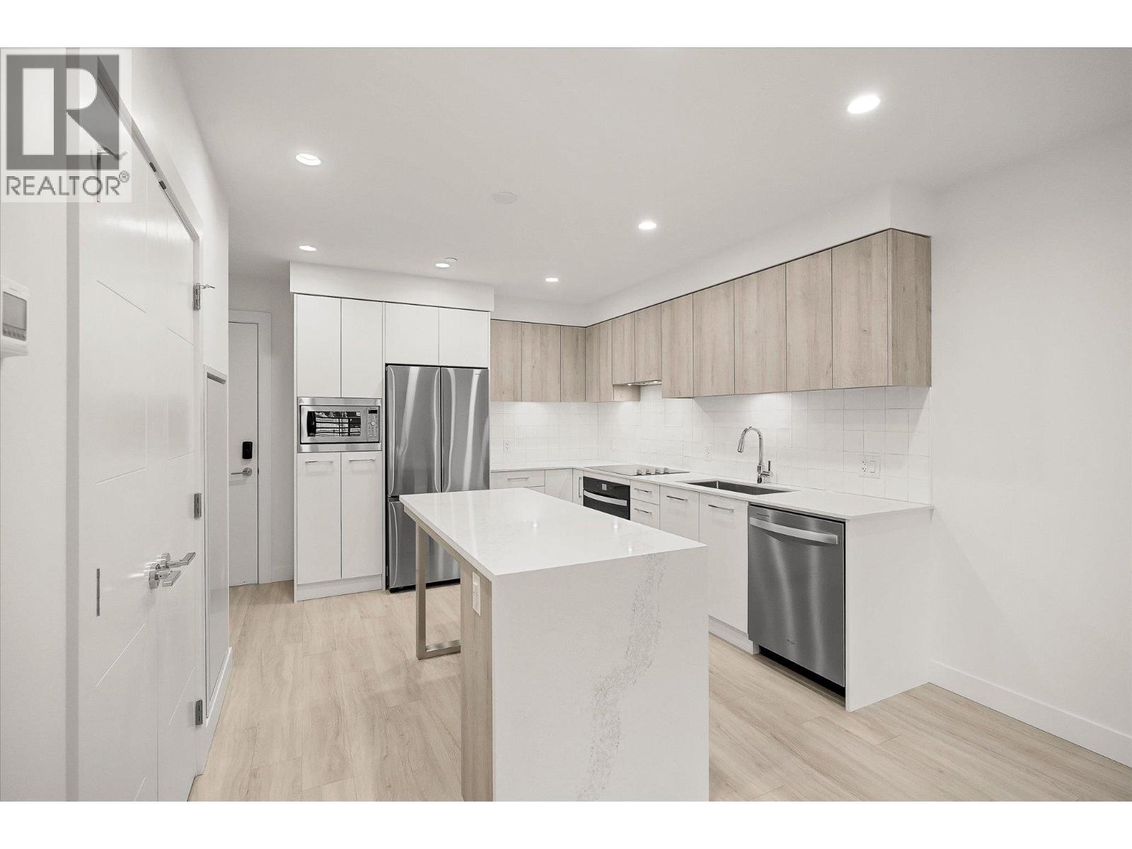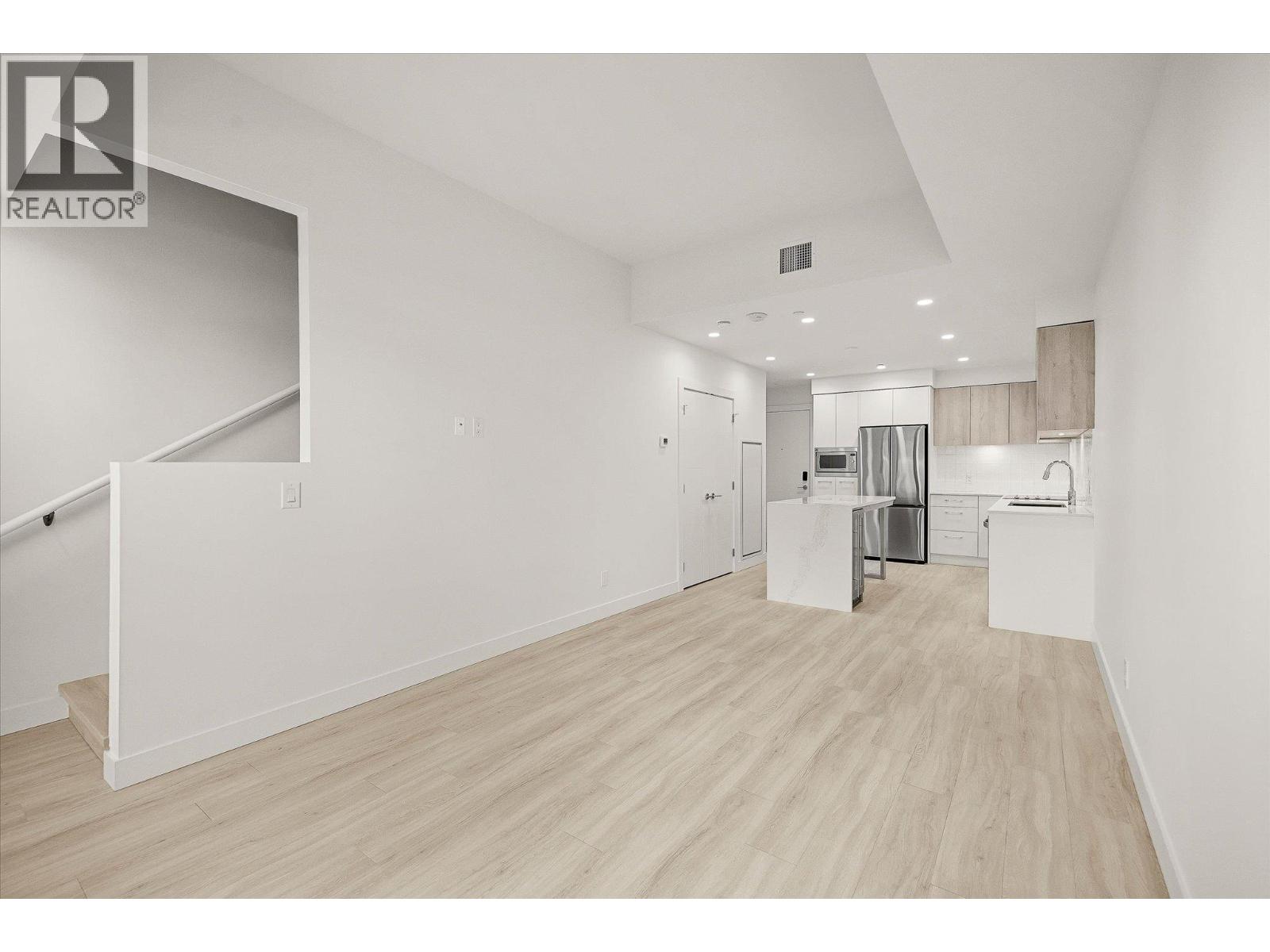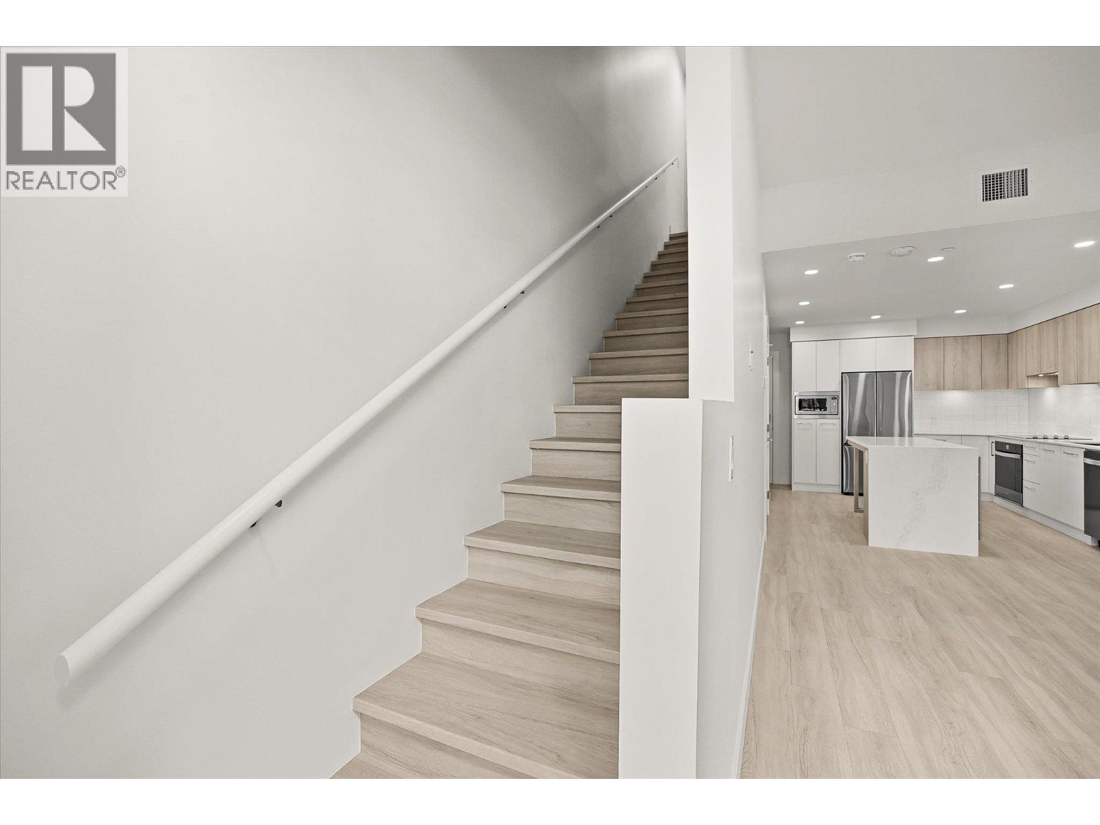 Welcome to Aqua Waterfront Village, Kelowna’s premier lakefront community in Lower Mission. This 2-storey, 2 bed, 2 bath townhome offers approx. 1,015 sqft of interior living, 155 sqft of exterior space, and includes a private, tandem 2-car garage in the building's parkade. The main floor features a bright, open-concept layout with oversized windows providing ample natural light. Luxury wide-plank vinyl flooring extends throughout the kitchen, living, dining, and bedroom areas. The kitchen showcases modern two-toned cabinetry, polished quartz countertops, dining island, integrated LED lighting, and a premium stainless steel appliance package that includes a wine fridge. Upstairs, you’ll find 2 generous bedrooms and 2 contemporary bathrooms featuring quartz vanities, porcelain tile and stylish finishes. Additional touches include blackout roller shades in the primary bedroom, custom closet organizers in both bedrooms and an energy-efficient central heating/cooling system. 1 storage locker, 1 bike locker included. Amenities include: an outdoor pool and hot tub, gas fire pits and BBQ’s, a fireside lounge and co-working area, 2-level fitness centre, pet wash and bike wash and maintenance area. Vacant and ready for quick possession. Only a 5% deposit required. Buyer to verify all details and measurements if deemed important. All offers must be written on the Developer’s CPS. (id:21321)