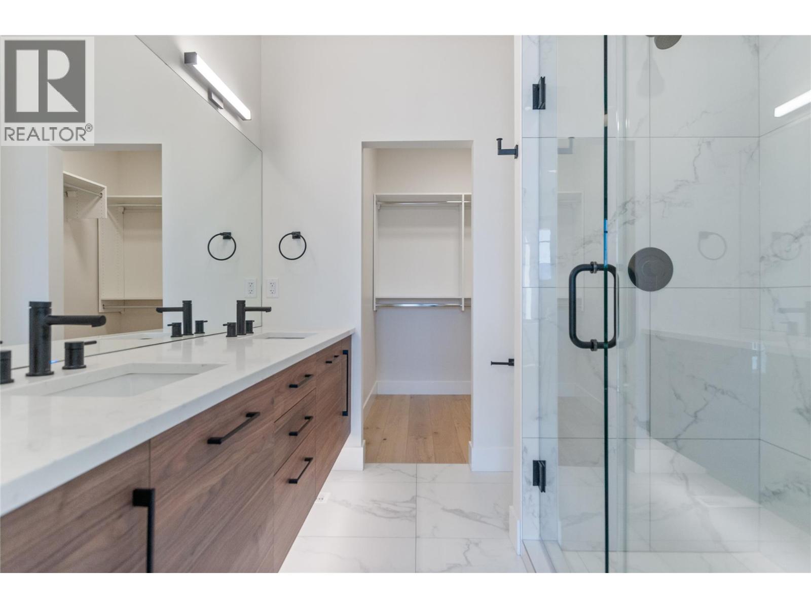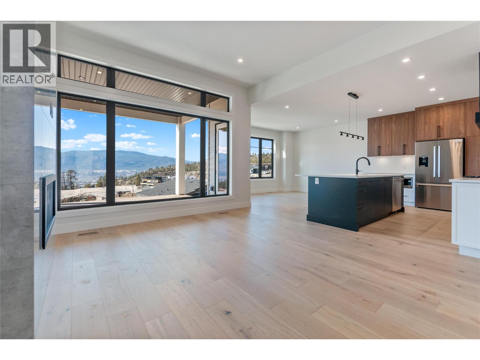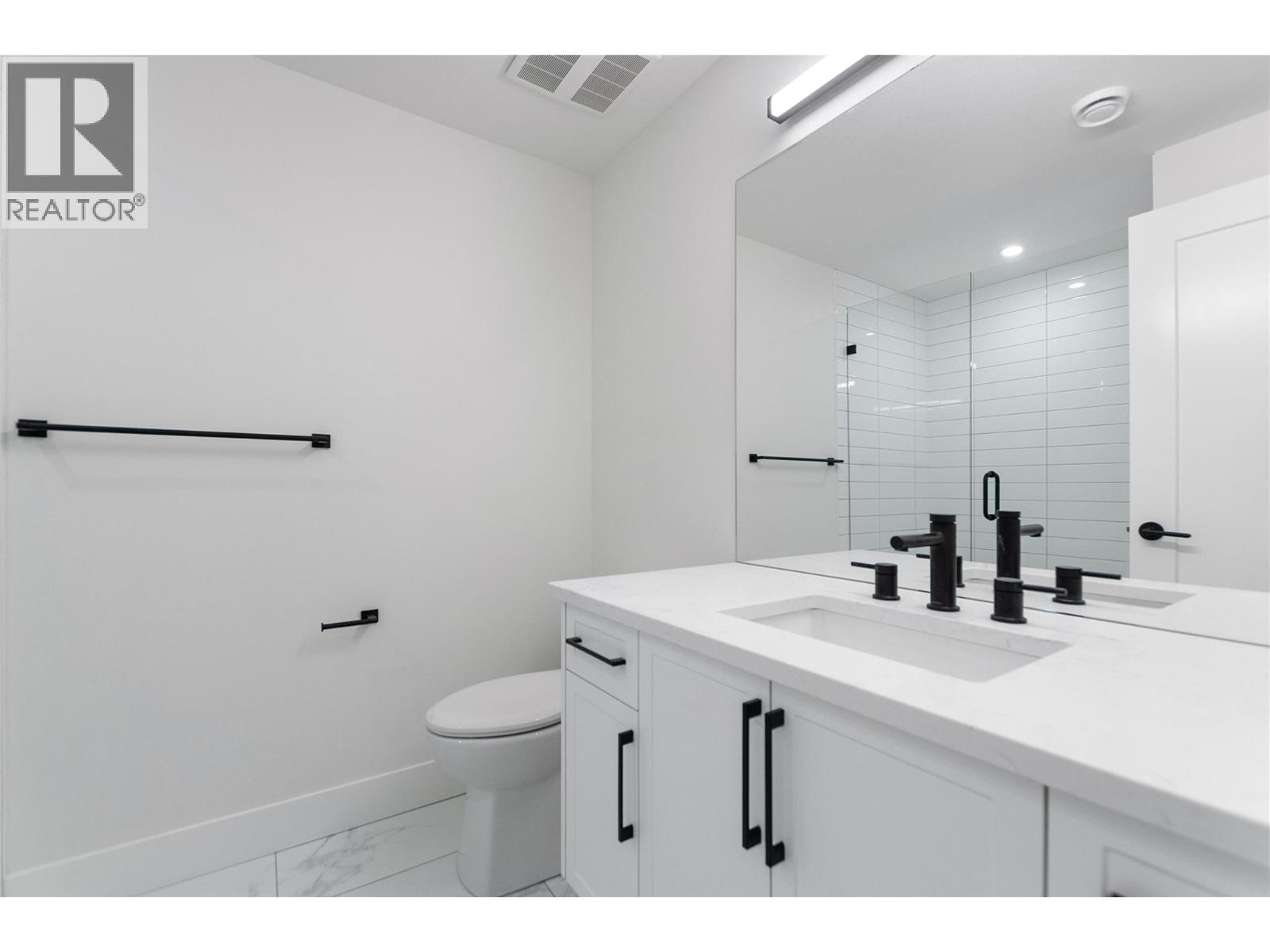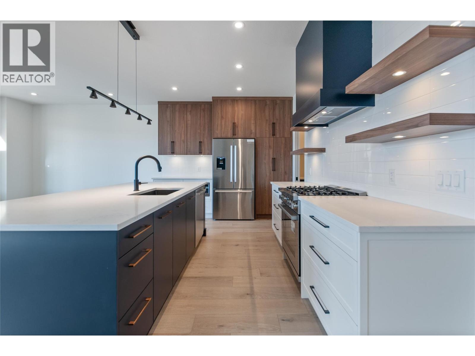 Welcome to this beautifully designed modern home in the sought-after Ridge Penticton development—where style meets functionality in every corner. The main residence features three spacious bedrooms and three bathrooms, crafted with comfort and design in mind. You'll find engineered white oak hardwood flooring throughout the main floor, while the luxurious ensuite bath is finished with matte porcelain tile. The chef-inspired kitchen boasts quartz countertops, custom cabinetry, and a premium Bosch appliance package, including a gas range, fridge, and dishwasher. Downstairs, a legal two-bedroom, one-bath suite offers privacy and potential rental income. It features quartz countertops, durable laminate flooring, matte porcelain tile in the bathroom, and a separate entrance with stair access from the street. The suite also includes its own Samsung appliance package—fridge, dishwasher, electric oven, washer, and dryer—and a generous 200+ square foot covered patio, ideal for outdoor living. The staircase to the lower level is fully carpeted and continues into the hallway and lower bedroom, providing a warm, cozy transition between levels. The two-car garage offers direct access into the home through a multi-functional space that combines a mudroom, laundry area, and pantry. Whether you're looking for a multi-generational home or an income-generating opportunity, this property delivers flexibility and sophistication in one of Penticton’s premier neighborhoods. (id:21321)