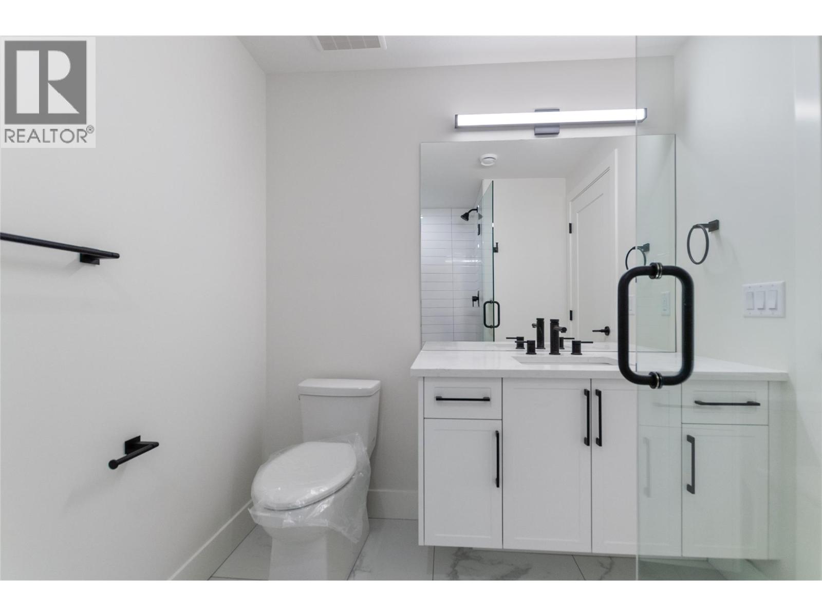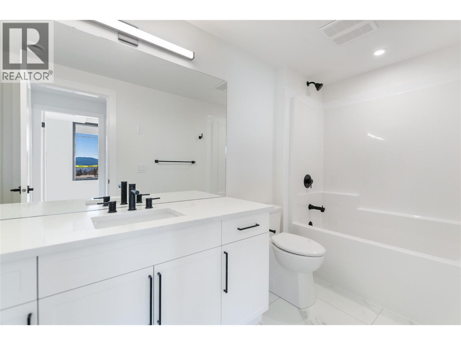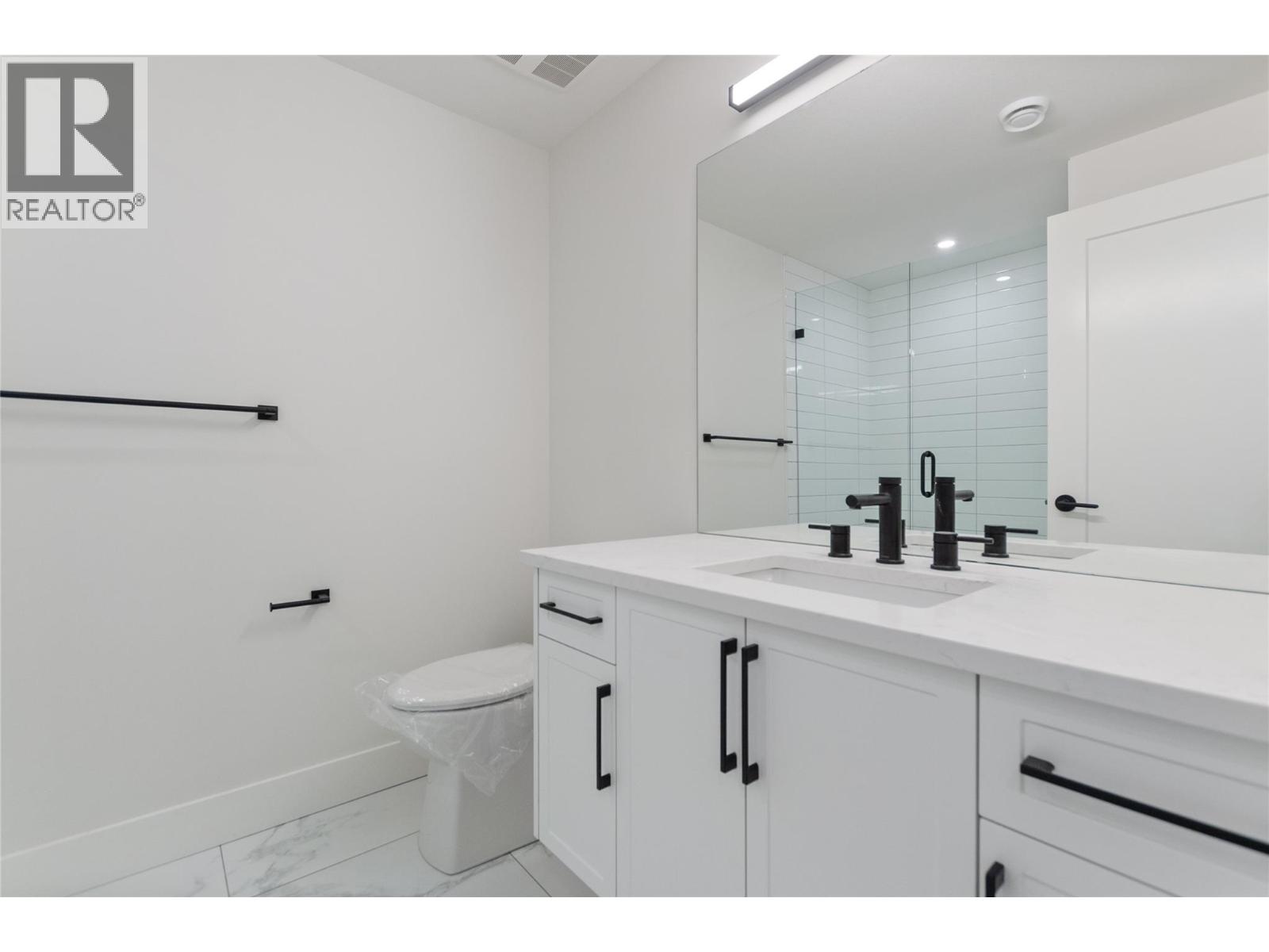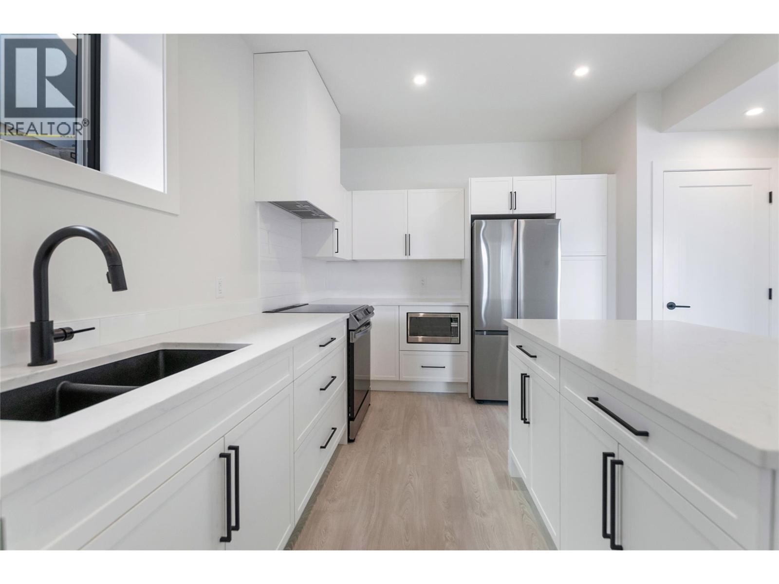 Welcome to this beautifully designed modern home in the sought-after Ridge Penticton development—where style meets functionality in every corner. The main residence features three spacious bedrooms and three bathrooms, crafted with comfort and design in mind. You'll find engineered white oak hardwood flooring throughout the main floor, while the luxurious ensuite bath is finished with matte porcelain tile. The chef-inspired kitchen boasts quartz countertops, custom cabinetry, and a premium Bosch appliance package, including a gas range, fridge, and dishwasher. Downstairs, a legal two-bedroom, one-bath suite offers privacy and potential rental income. It features quartz countertops, durable laminate flooring, matte porcelain tile in the bathroom, and a separate entrance with stair access from the street. The suite also includes its own Samsung appliance package—fridge, dishwasher, electric oven, washer, and dryer—and a generous 200+ square foot covered patio, ideal for outdoor living. The staircase to the lower level is fully carpeted and continues into the hallway and lower bedroom, providing a warm, cozy transition between levels. The two-car garage offers direct access into the home through a multi-functional space that combines a mudroom, laundry area, and pantry. Whether you're looking for a multi-generational home or an income-generating opportunity, this property delivers flexibility and sophistication in one of Penticton’s premier neighborhoods. (id:21321)