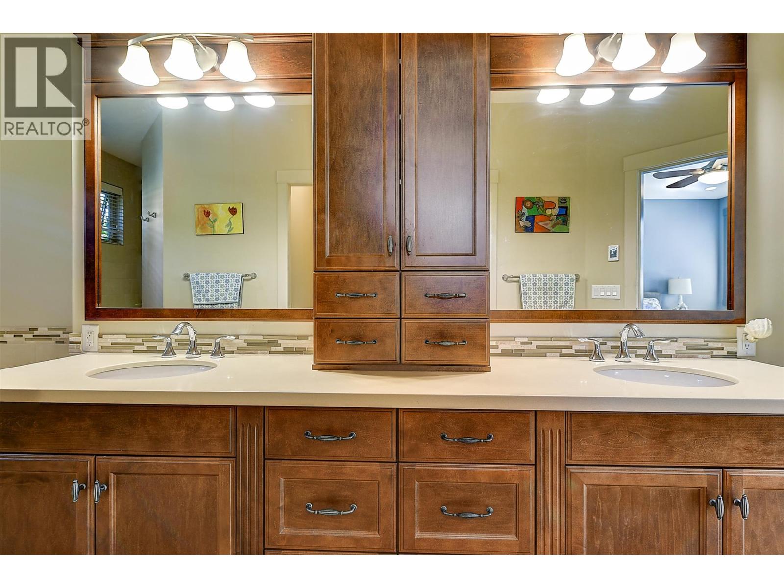 This award-winning home is designed for those who value both elegance and lifestyle, with the backyard as its crown jewel. Just minutes from downtown Kelowna, this property showcases a private resort-style oasis where every day feels like a getaway. The sparkling in-ground saltwater pool is surrounded by expansive stamped concrete patios, vibrant landscaping, and multiple lounge areas that flow seamlessly from sun-soaked relaxation to shaded retreats - creating the perfect setting for lively gatherings, quiet evenings under the stars, or weekend pool parties with friends and family. Inside, soaring ceilings and timeless hardwood anchor an open-concept design centered on a Westwood custom kitchen with granite counters, oversized island, and professional-grade appliances. The dining and Living areas, complete with a feature gas fireplace, connect effortlessly to the outdoor lounge, extending the Living space. The king-sized primary suite offers a lavish walk-in closet, heated floors, double vanities, a custom shower, and a soaker tub, while a second bedroom with a wall bed/desk and private entrance makes the perfect guest suite or office. A second bath and laundry complete the main level, while the finished lower level impresses with a massive recreation space, full wet bar, office, media/games room, bedroom, and bath. Additional highlights include a triple tandem garage, owned geothermal system, and a pet-friendly community with landscaped pathways and ponds. (id:21321)