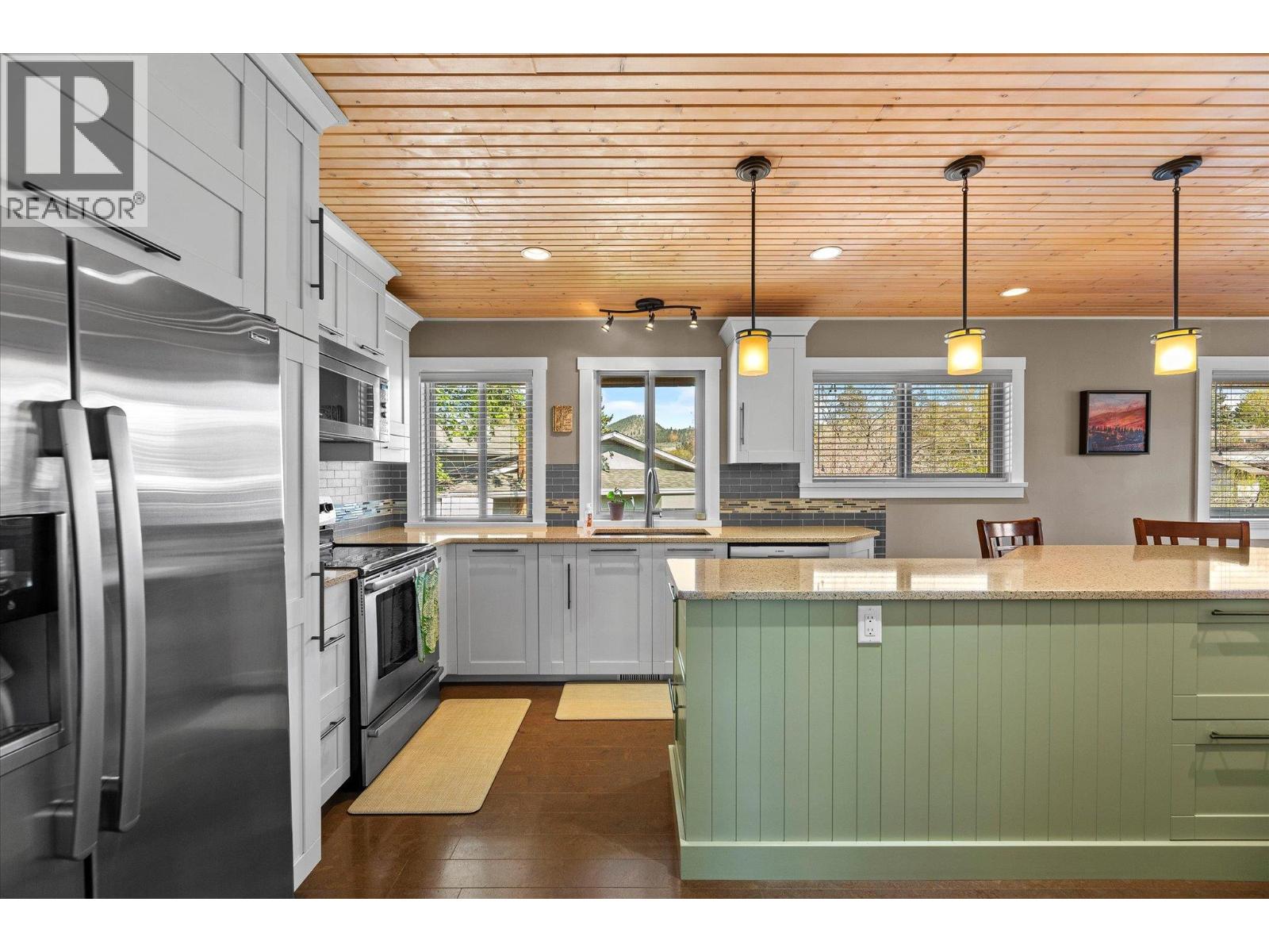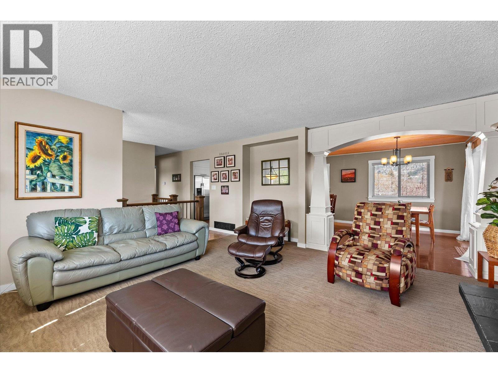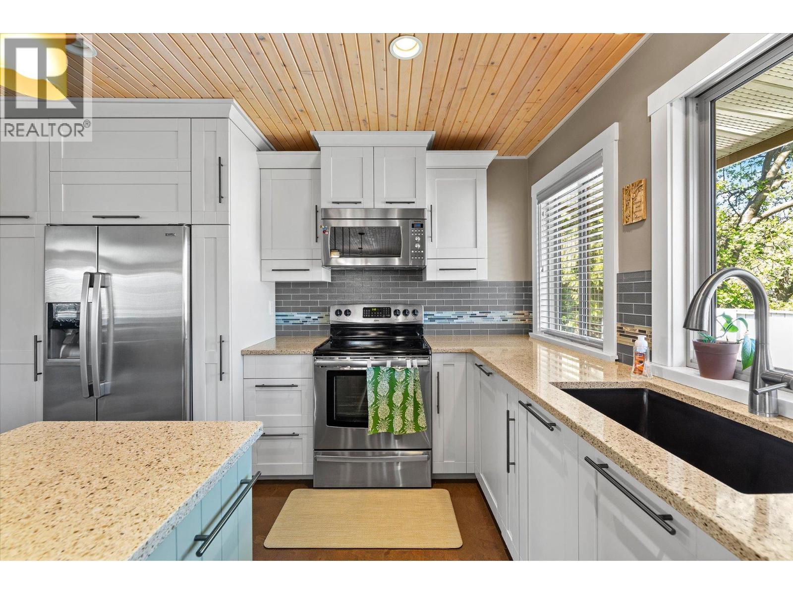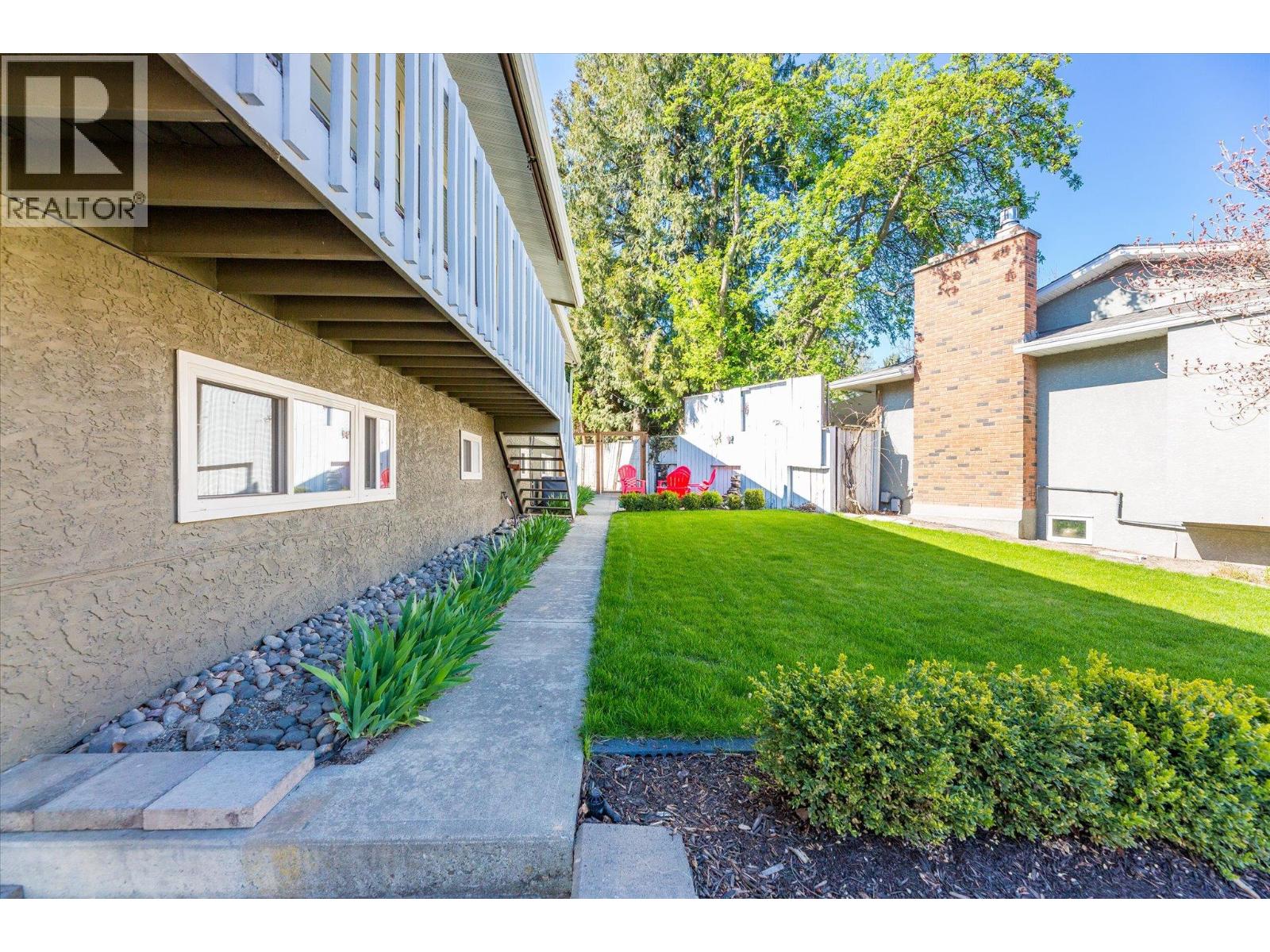 lenmore Family home loaded with value. Located with great access to schools, parks, Rail Trail, downtown access to the water front boardwalk and more. This 5 bedroom, 3 bath home includes a private 2 bedroom in-law suite/ summer kitchen complete with full kitchen, 3 piece bath and shared laundry. The main level has 3 spacious bedrooms, a 4 piece main bath and 3 piece en-suite with tile and glass shower. Entertain friends and family around the quartz counter top island in the remodeled kitchen with access to the Dining area, Living room with Gas Fireplace and double French doors to the covered patio. The lower level has a generous sized family room with wood burning fireplace, entry to the 2 bed suite, laundry room, and storage space. The low maintenance yard is completed with underground irrigation to flower and garden beds and your own private putting green to practice your ""short game"". There is also a great outdoor patio area which makes a perfect oasis space to read a book or entertain with friends. Lots of parking on the half moon driveway with a covered carport. This home has been maintained and cared for over the years. Glenmore listing at its best. (id:21321)