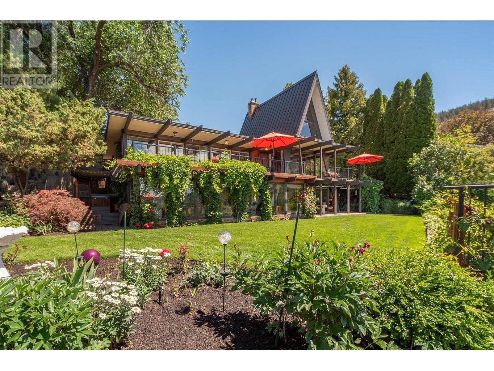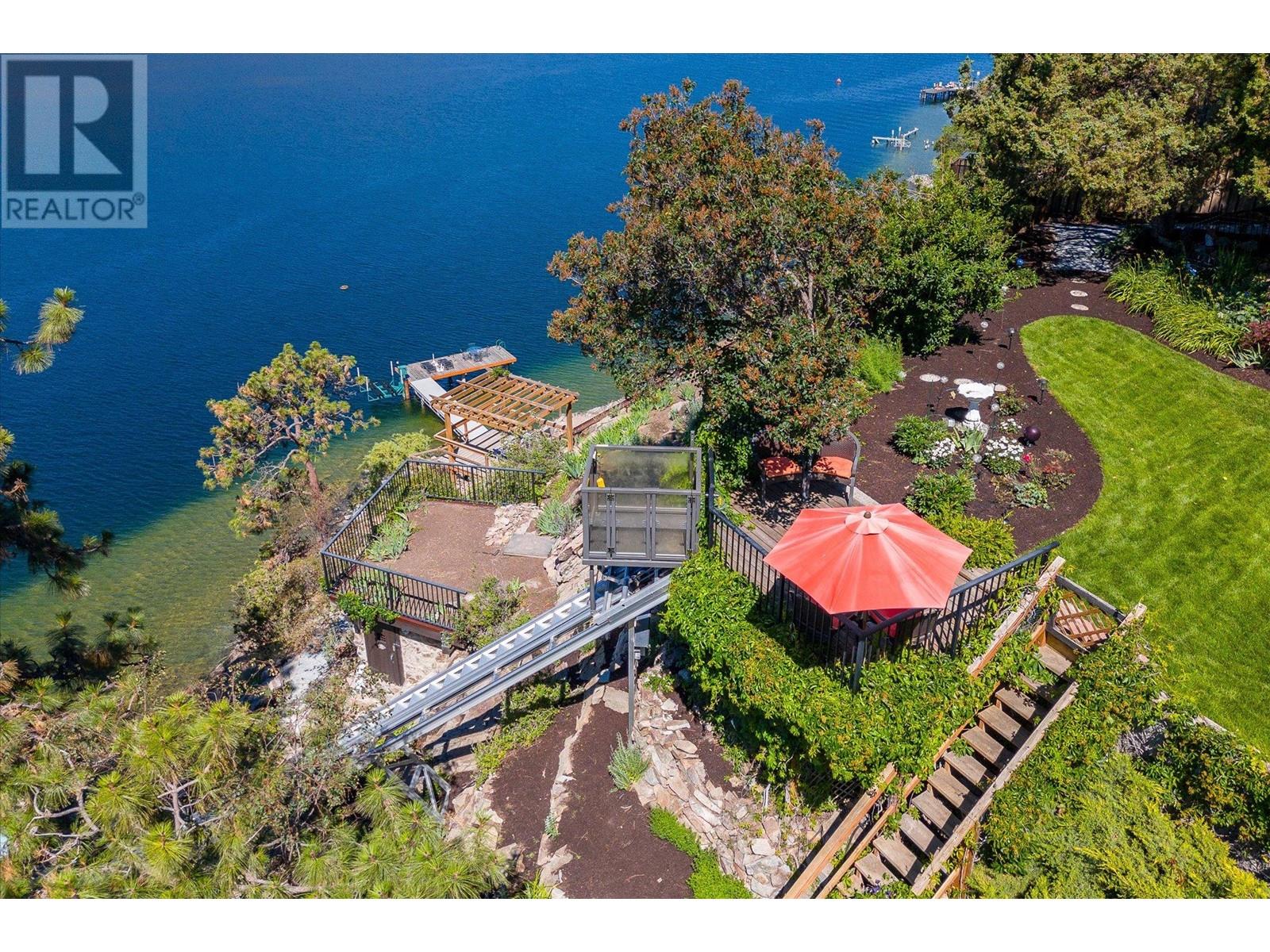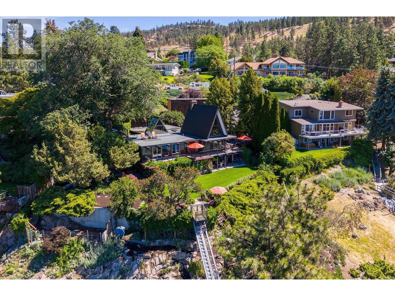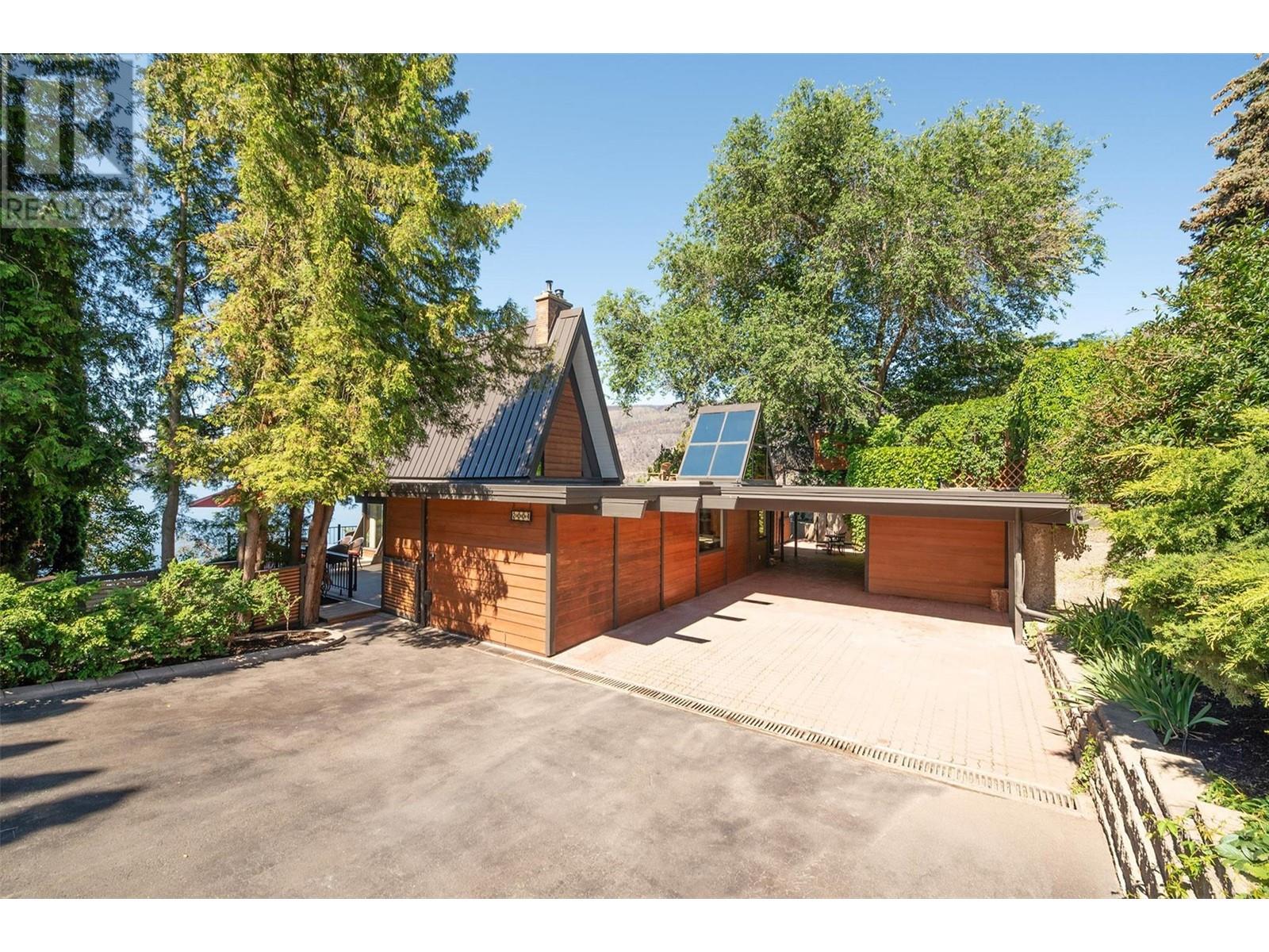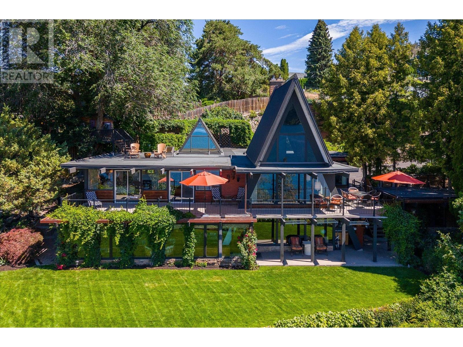 Nestled above the shores of Okanagan Lake, this timeless 4-bedroom A-frame retreat exudes vintage charm and offers one of the best vantage points on Okanagan Lake. With southern exposure, the iconic A-frame architecture features expansive windows that flood the home with unbelievable lake & mountain views. This 2-level abode provides easy main-floor living, featuring a lake-view primary bedroom, ample space in the kitchen/dining area for entertaining, a lake-view patio, & a cozy living room with a charming stone fireplace, allowing you to relax below the soaring ceilings & bask in the endless vistas. The walkout lower level houses 2 guest bedrooms, a family room, & a sunroom, all opening to the beautiful outdoor living spaces. Outside, discover manicured gardens, water feature, a hot tub, & multiple deck platforms. For effortless trips to the water, a tram takes you down to the beach to the private dock with dual lifts. Enjoy a convenient lakeside storage outbuilding & a BBQ/lounge area. Sprinkled around the property are adorable outbuildings, each with its own unique character: a craft cabana, a nostalgic treehouse, & a hillside den carved into the landscape...it truly feels like a fairytale! The property also offers lots of parking & a massive 23' x 40'9 ft detached garage with over height 12 ft doors – park your RV or boat inside for the off-season! Whether you are seeking a year-round residence or a seasonal getaway, this property promises peace, joy & endless adventures. (id:21321)