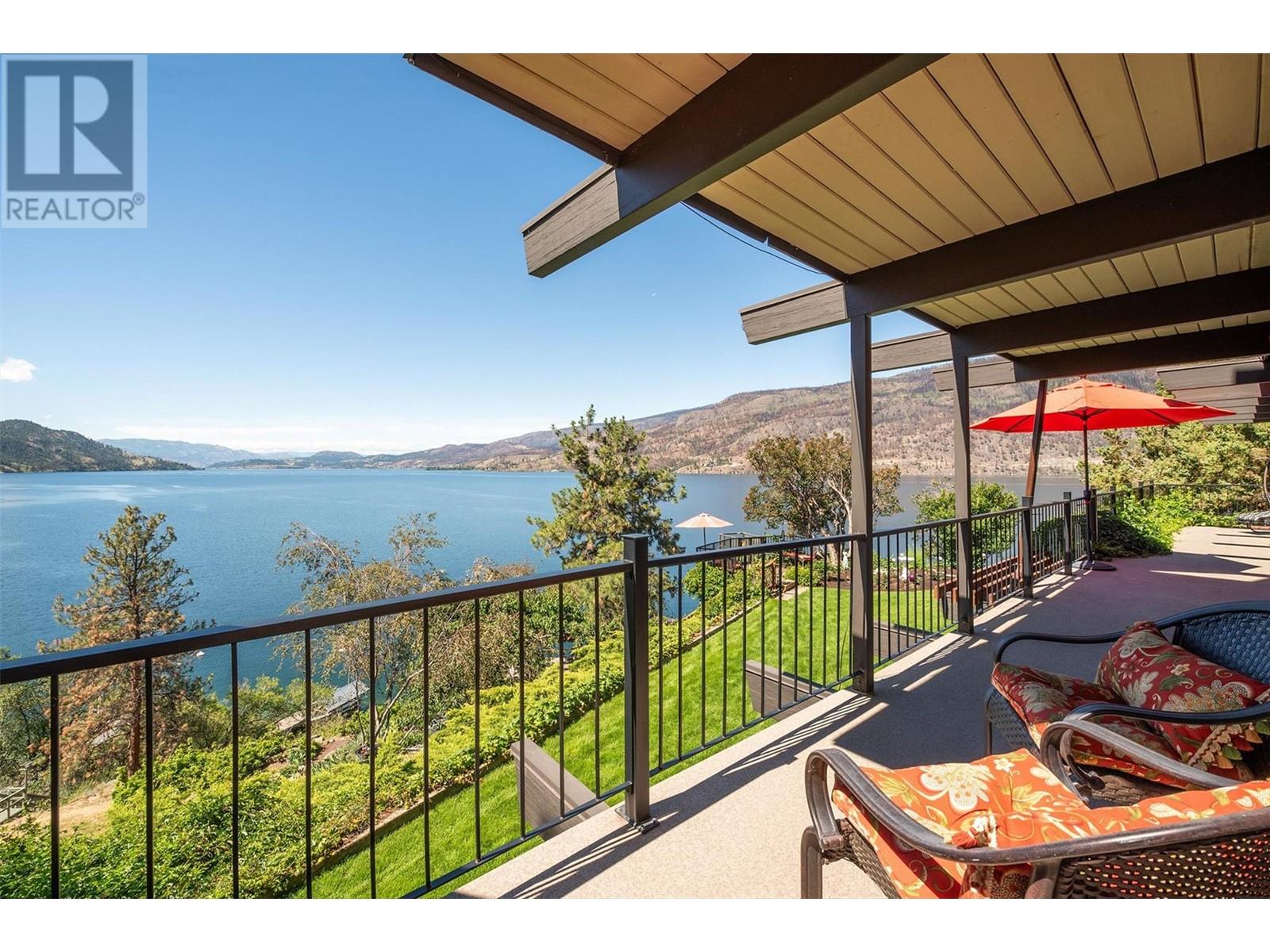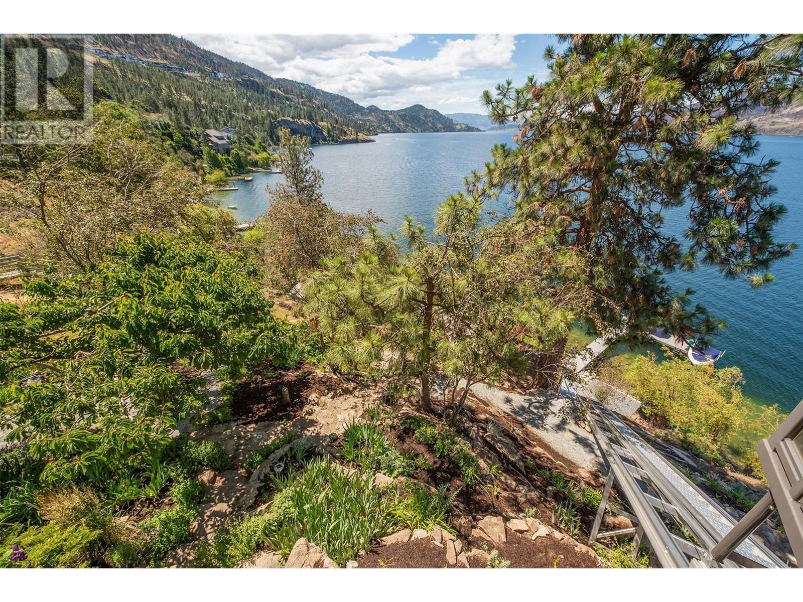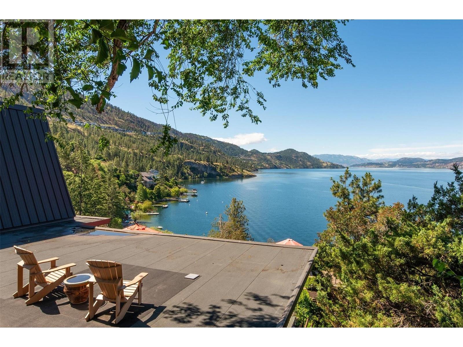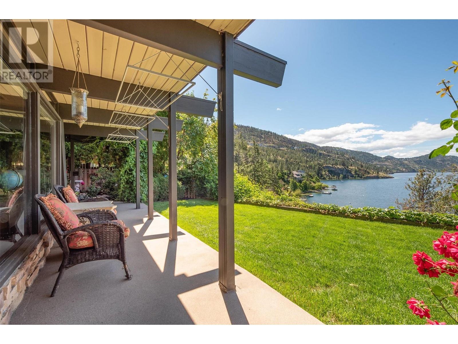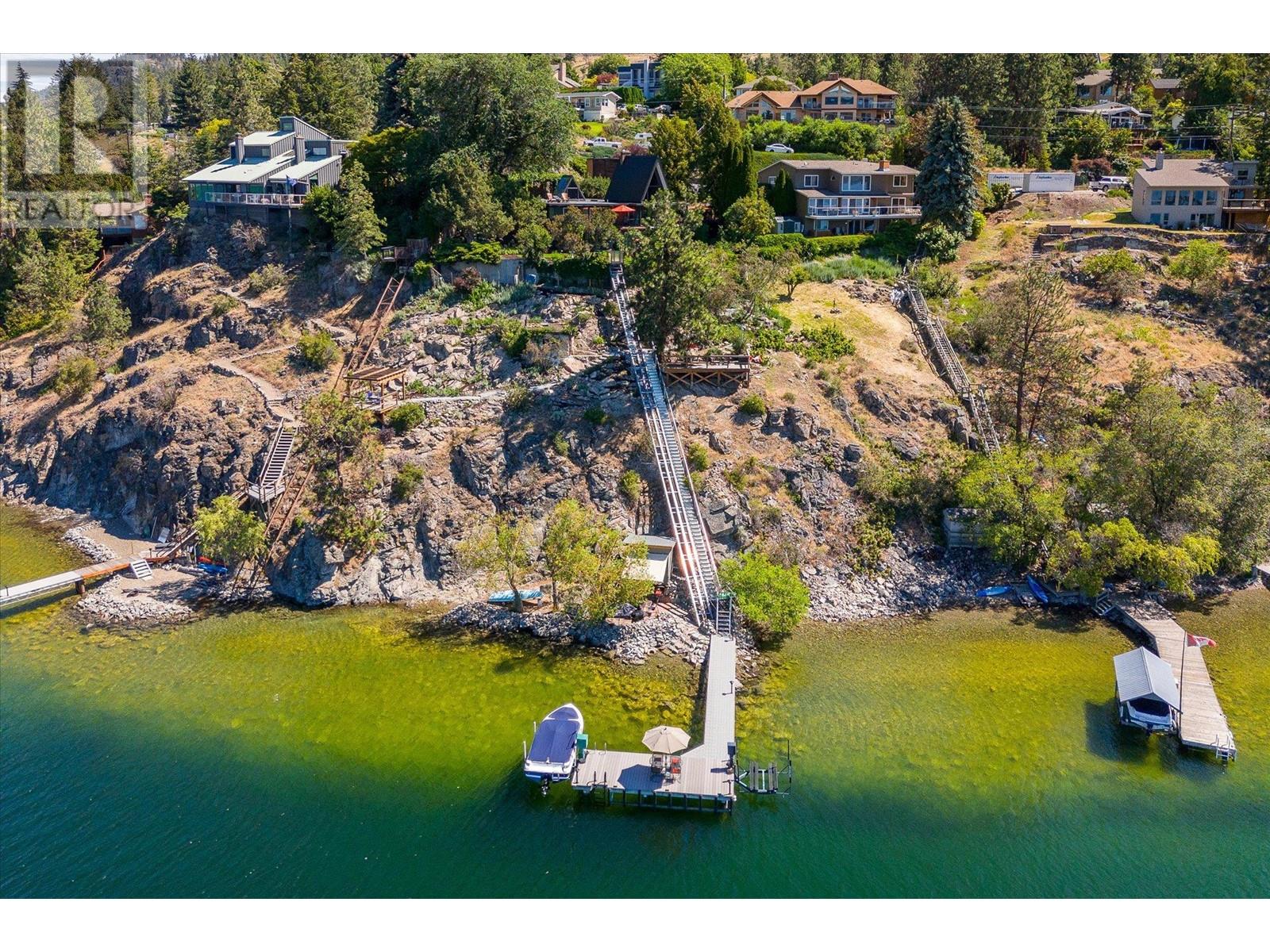 Nestled above the shores of Okanagan Lake, this timeless 4-bedroom A-frame retreat exudes vintage charm and offers one of the best vantage points on Okanagan Lake. With southern exposure, the iconic A-frame architecture features expansive windows that flood the home with unbelievable lake & mountain views. This 2-level abode provides easy main-floor living, featuring a lake-view primary bedroom, ample space in the kitchen/dining area for entertaining, a lake-view patio, & a cozy living room with a charming stone fireplace, allowing you to relax below the soaring ceilings & bask in the endless vistas. The walkout lower level houses 2 guest bedrooms, a family room, & a sunroom, all opening to the beautiful outdoor living spaces. Outside, discover manicured gardens, water feature, a hot tub, & multiple deck platforms. For effortless trips to the water, a tram takes you down to the beach to the private dock with dual lifts. Enjoy a convenient lakeside storage outbuilding & a BBQ/lounge area. Sprinkled around the property are adorable outbuildings, each with its own unique character: a craft cabana, a nostalgic treehouse, & a hillside den carved into the landscape...it truly feels like a fairytale! The property also offers lots of parking & a massive 23' x 40'9 ft detached garage with over height 12 ft doors – park your RV or boat inside for the off-season! Whether you are seeking a year-round residence or a seasonal getaway, this property promises peace, joy & endless adventures. (id:21321)