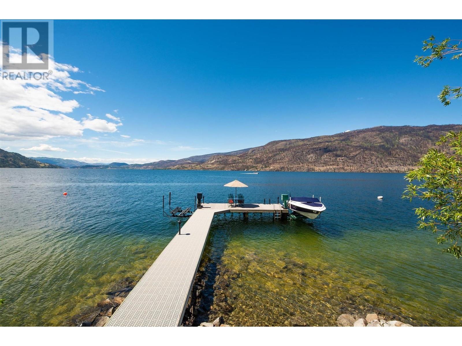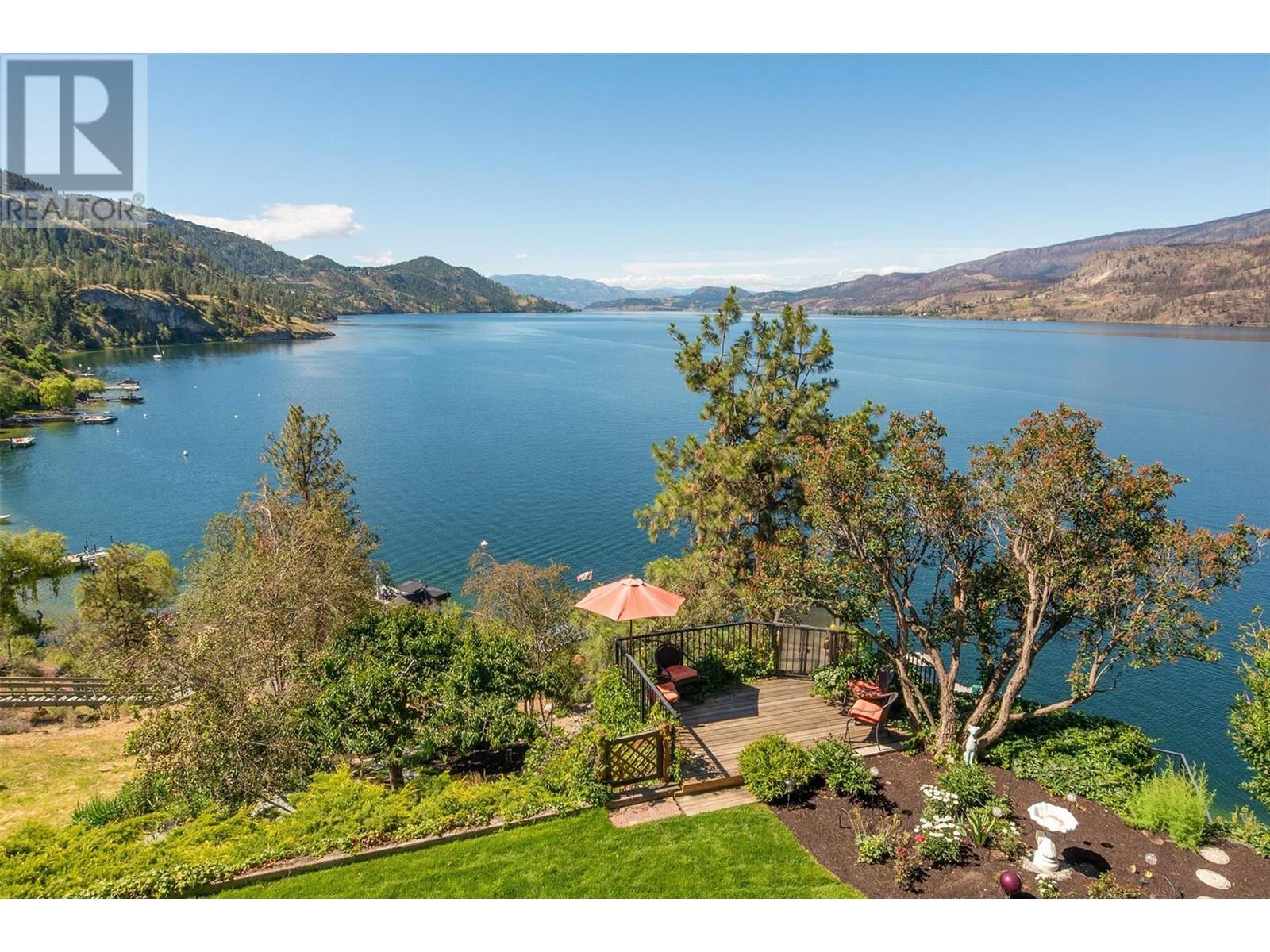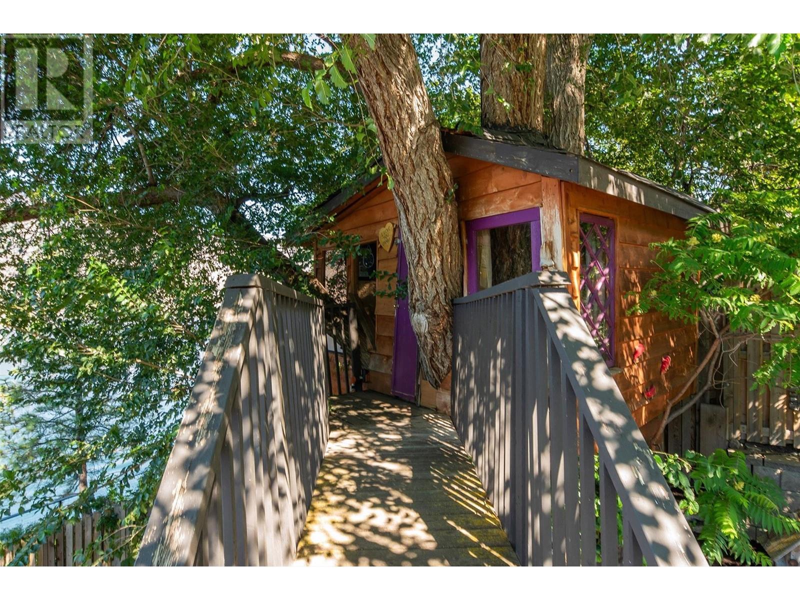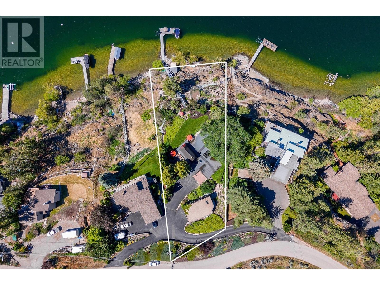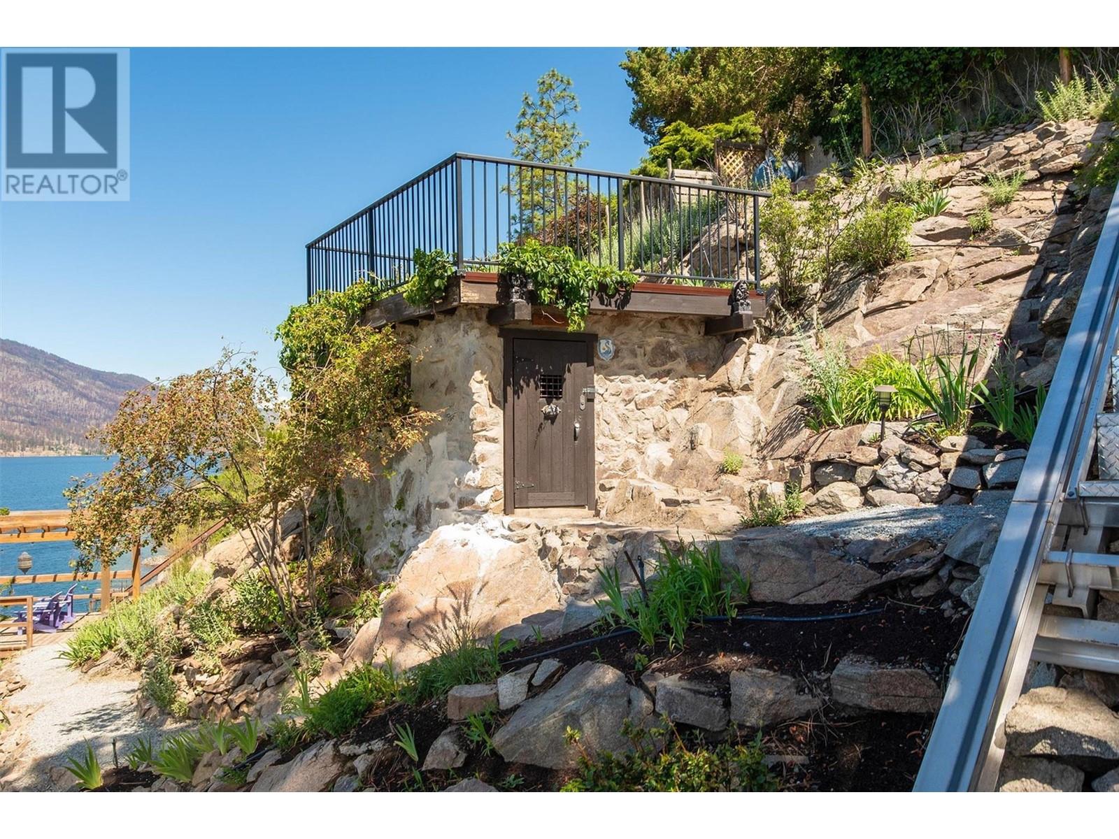 Nestled above the shores of Okanagan Lake, this timeless 4-bedroom A-frame retreat exudes vintage charm and offers one of the best vantage points on Okanagan Lake. With southern exposure, the iconic A-frame architecture features expansive windows that flood the home with unbelievable lake & mountain views. This 2-level abode provides easy main-floor living, featuring a lake-view primary bedroom, ample space in the kitchen/dining area for entertaining, a lake-view patio, & a cozy living room with a charming stone fireplace, allowing you to relax below the soaring ceilings & bask in the endless vistas. The walkout lower level houses 2 guest bedrooms, a family room, & a sunroom, all opening to the beautiful outdoor living spaces. Outside, discover manicured gardens, water feature, a hot tub, & multiple deck platforms. For effortless trips to the water, a tram takes you down to the beach to the private dock with dual lifts. Enjoy a convenient lakeside storage outbuilding & a BBQ/lounge area. Sprinkled around the property are adorable outbuildings, each with its own unique character: a craft cabana, a nostalgic treehouse, & a hillside den carved into the landscape...it truly feels like a fairytale! The property also offers lots of parking & a massive 23' x 40'9 ft detached garage with over height 12 ft doors – park your RV or boat inside for the off-season! Whether you are seeking a year-round residence or a seasonal getaway, this property promises peace, joy & endless adventures. (id:21321)