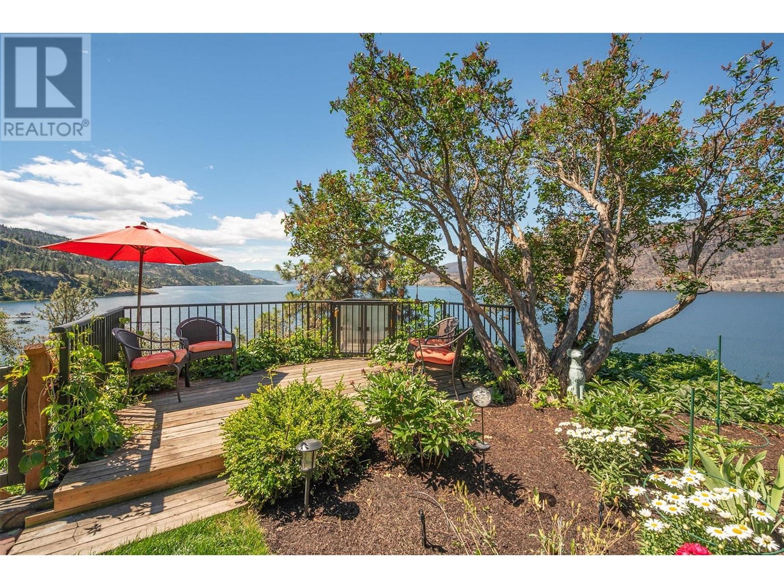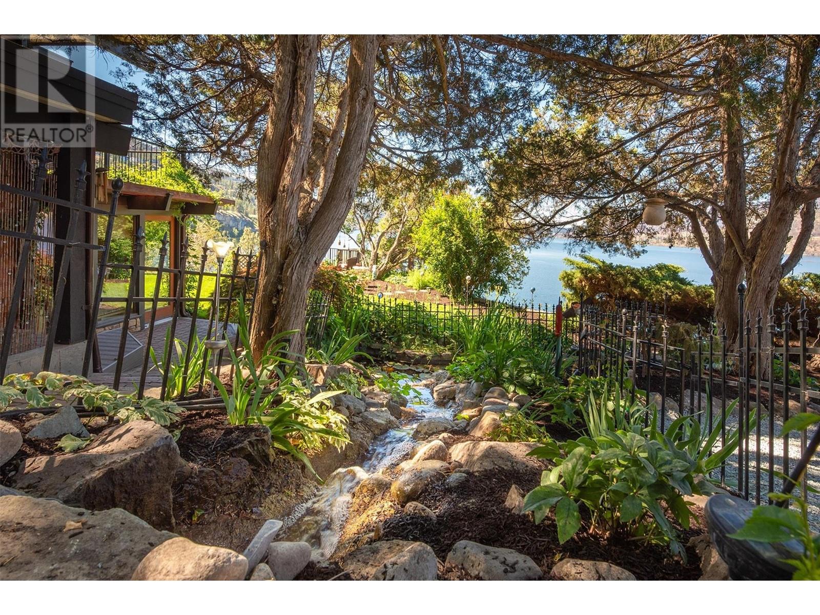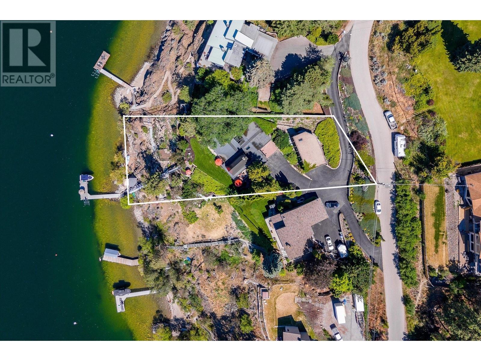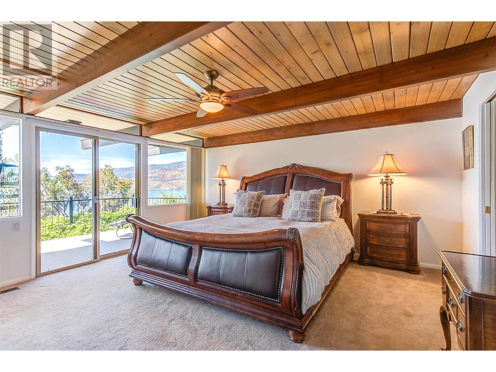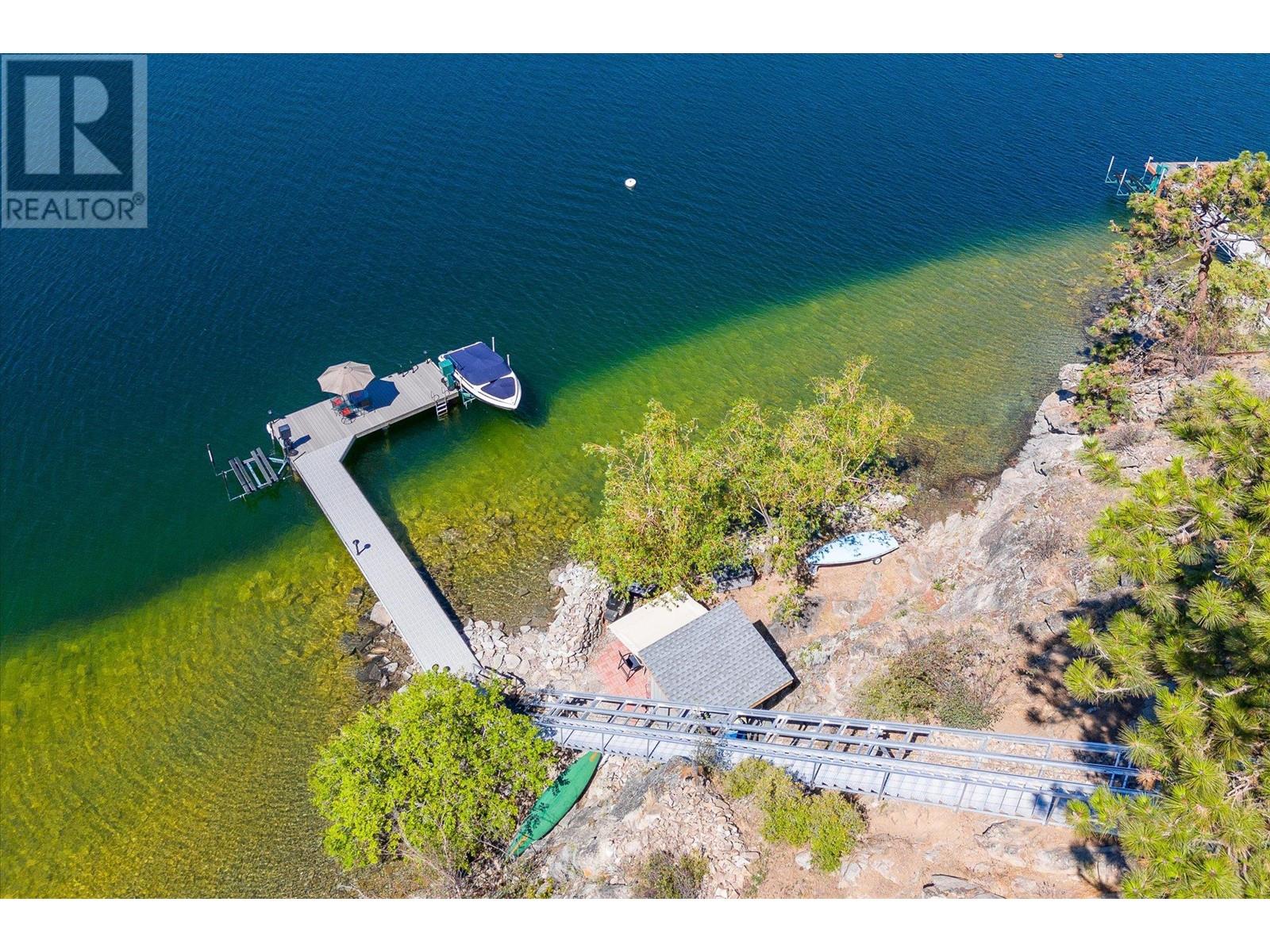 Nestled above the shores of Okanagan Lake, this timeless 4-bedroom A-frame retreat exudes vintage charm and offers one of the best vantage points on Okanagan Lake. With southern exposure, the iconic A-frame architecture features expansive windows that flood the home with unbelievable lake & mountain views. This 2-level abode provides easy main-floor living, featuring a lake-view primary bedroom, ample space in the kitchen/dining area for entertaining, a lake-view patio, & a cozy living room with a charming stone fireplace, allowing you to relax below the soaring ceilings & bask in the endless vistas. The walkout lower level houses 2 guest bedrooms, a family room, & a sunroom, all opening to the beautiful outdoor living spaces. Outside, discover manicured gardens, water feature, a hot tub, & multiple deck platforms. For effortless trips to the water, a tram takes you down to the beach to the private dock with dual lifts. Enjoy a convenient lakeside storage outbuilding & a BBQ/lounge area. Sprinkled around the property are adorable outbuildings, each with its own unique character: a craft cabana, a nostalgic treehouse, & a hillside den carved into the landscape...it truly feels like a fairytale! The property also offers lots of parking & a massive 23' x 40'9 ft detached garage with over height 12 ft doors – park your RV or boat inside for the off-season! Whether you are seeking a year-round residence or a seasonal getaway, this property promises peace, joy & endless adventures. (id:21321)