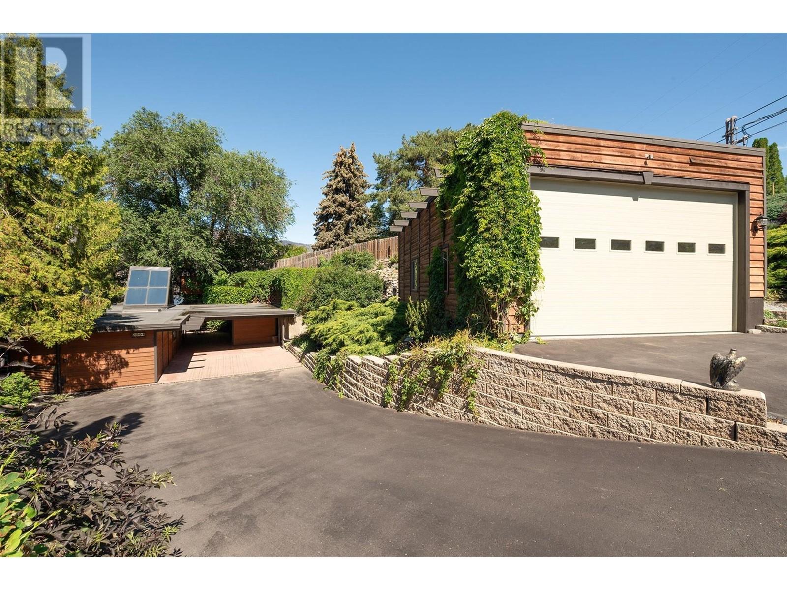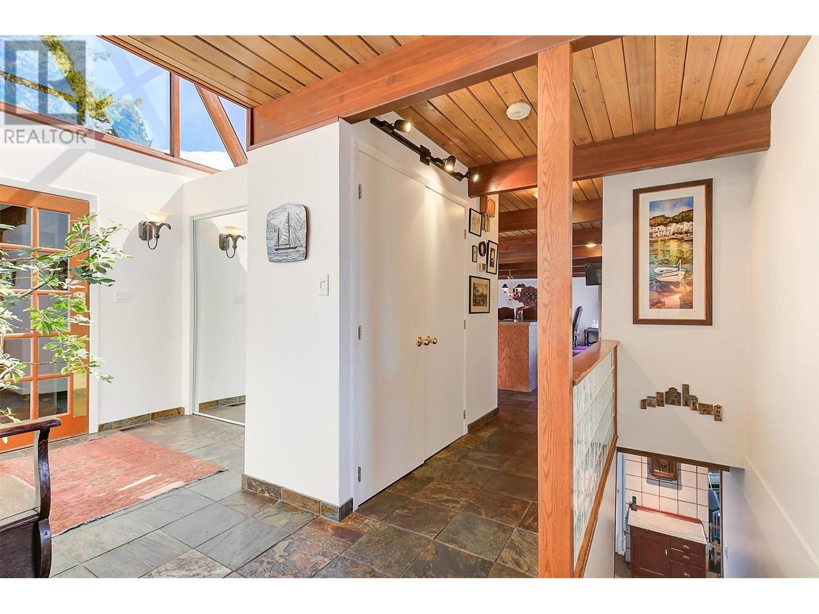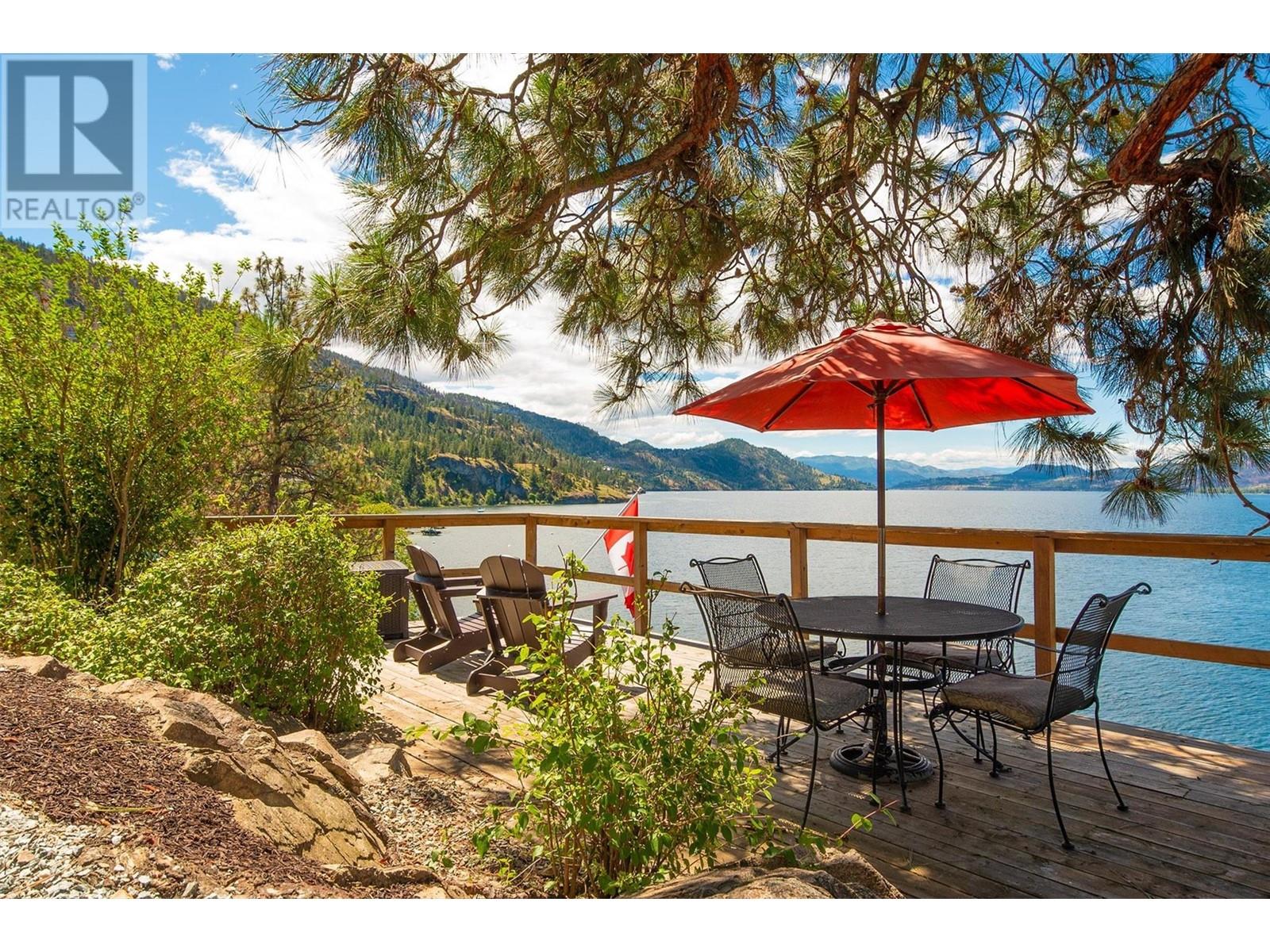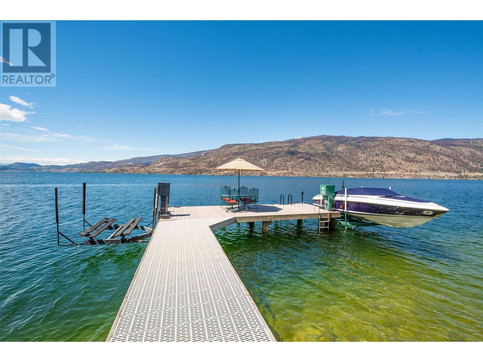 Nestled above the shores of Okanagan Lake, this timeless 4-bedroom A-frame retreat exudes vintage charm and offers one of the best vantage points on Okanagan Lake. With southern exposure, the iconic A-frame architecture features expansive windows that flood the home with unbelievable lake & mountain views. This 2-level abode provides easy main-floor living, featuring a lake-view primary bedroom, ample space in the kitchen/dining area for entertaining, a lake-view patio, & a cozy living room with a charming stone fireplace, allowing you to relax below the soaring ceilings & bask in the endless vistas. The walkout lower level houses 2 guest bedrooms, a family room, & a sunroom, all opening to the beautiful outdoor living spaces. Outside, discover manicured gardens, water feature, a hot tub, & multiple deck platforms. For effortless trips to the water, a tram takes you down to the beach to the private dock with dual lifts. Enjoy a convenient lakeside storage outbuilding & a BBQ/lounge area. Sprinkled around the property are adorable outbuildings, each with its own unique character: a craft cabana, a nostalgic treehouse, & a hillside den carved into the landscape...it truly feels like a fairytale! The property also offers lots of parking & a massive 23' x 40'9 ft detached garage with over height 12 ft doors – park your RV or boat inside for the off-season! Whether you are seeking a year-round residence or a seasonal getaway, this property promises peace, joy & endless adventures. (id:21321)