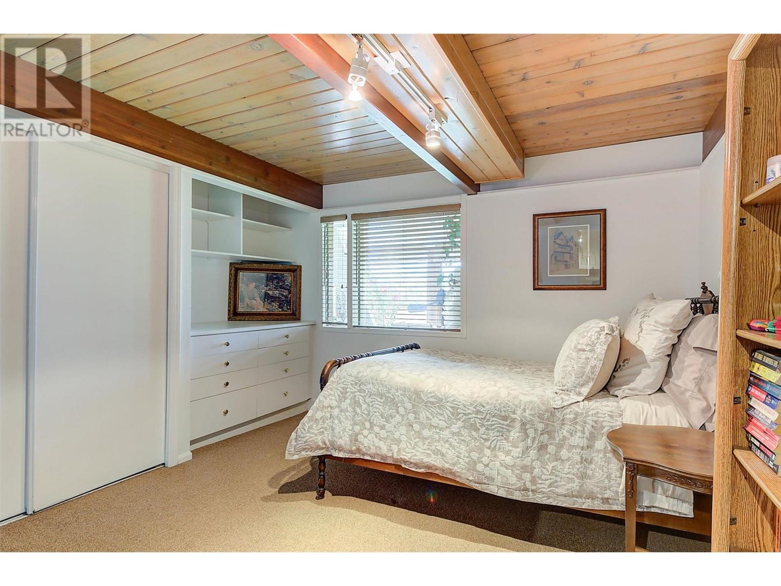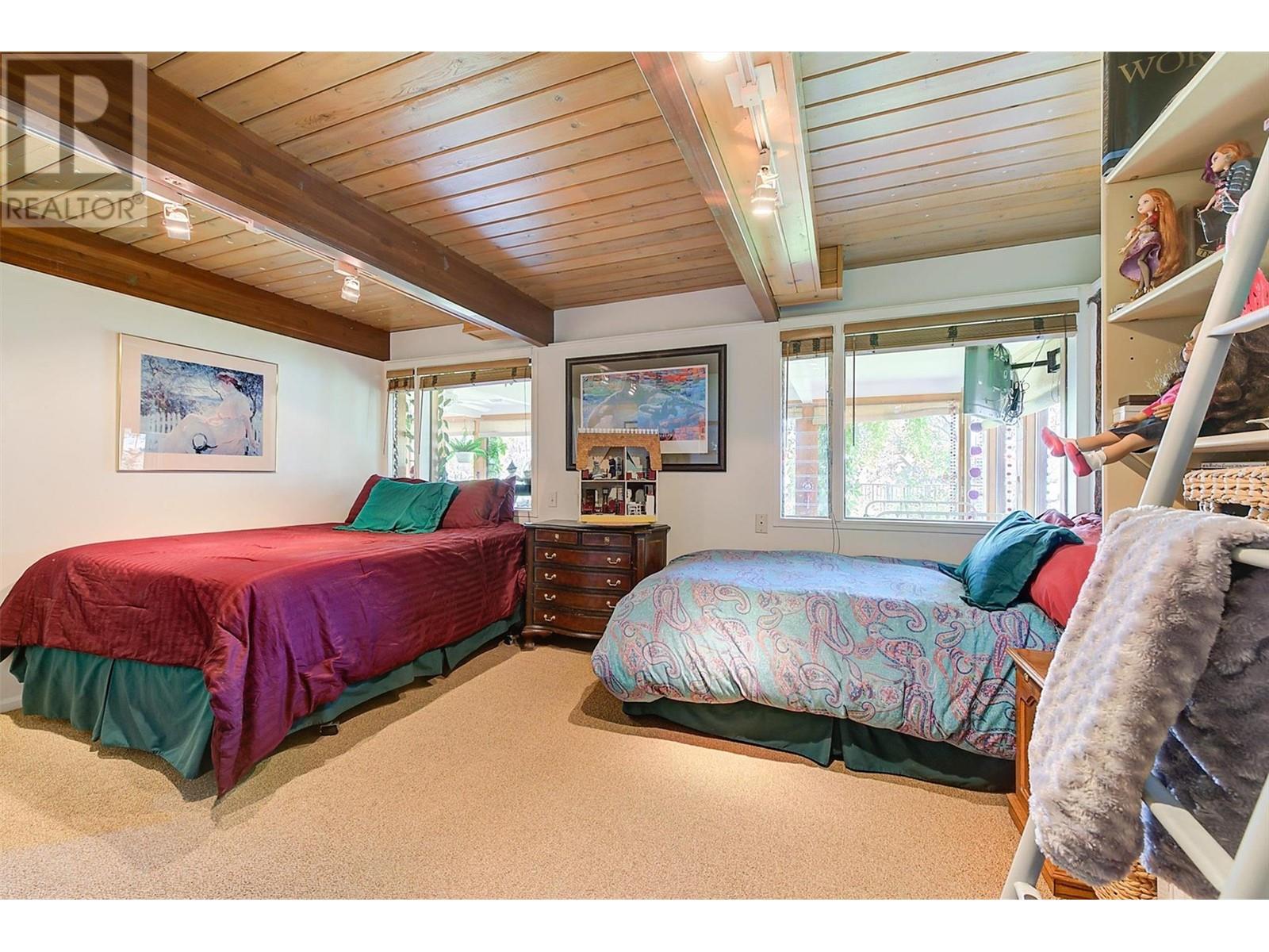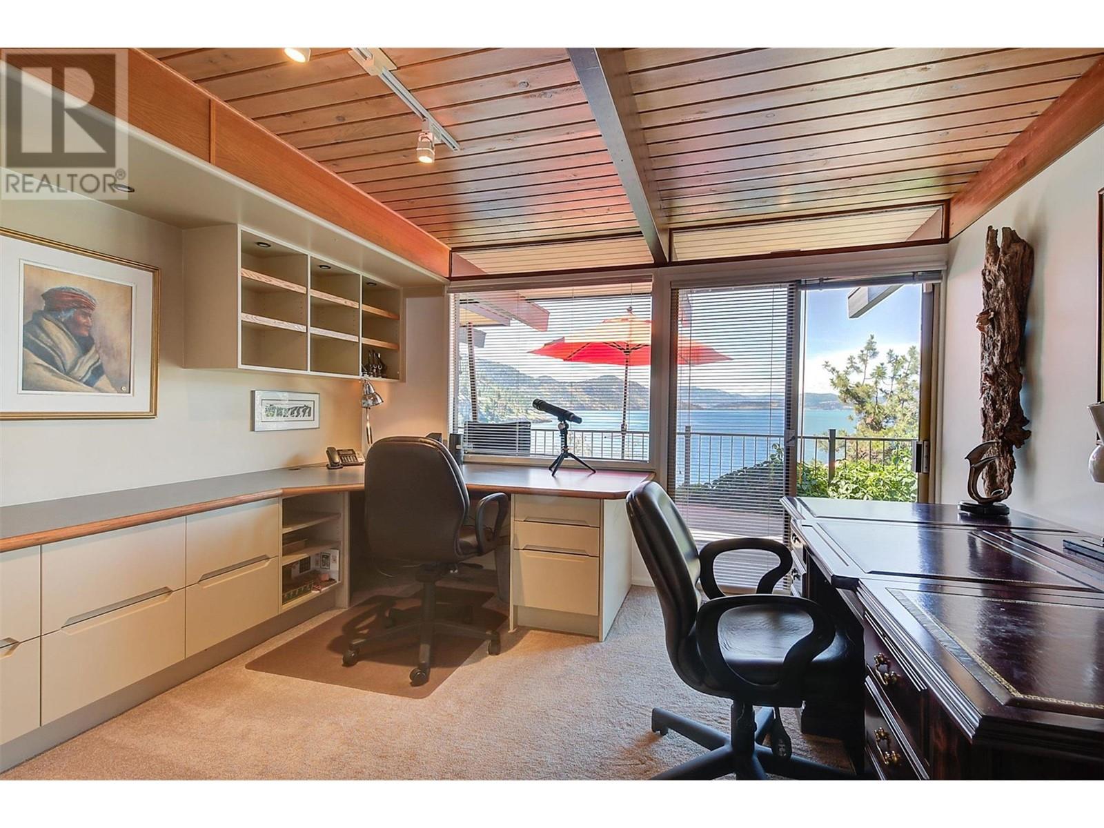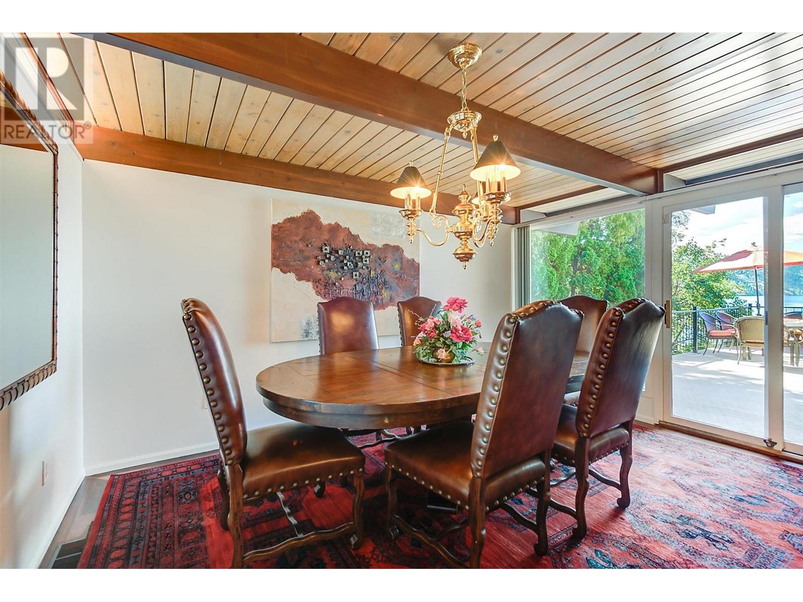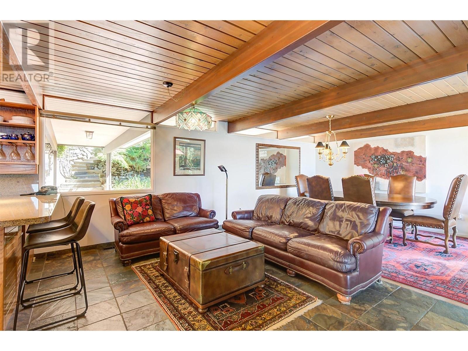 Nestled above the shores of Okanagan Lake, this timeless 4-bedroom A-frame retreat exudes vintage charm and offers one of the best vantage points on Okanagan Lake. With southern exposure, the iconic A-frame architecture features expansive windows that flood the home with unbelievable lake & mountain views. This 2-level abode provides easy main-floor living, featuring a lake-view primary bedroom, ample space in the kitchen/dining area for entertaining, a lake-view patio, & a cozy living room with a charming stone fireplace, allowing you to relax below the soaring ceilings & bask in the endless vistas. The walkout lower level houses 2 guest bedrooms, a family room, & a sunroom, all opening to the beautiful outdoor living spaces. Outside, discover manicured gardens, water feature, a hot tub, & multiple deck platforms. For effortless trips to the water, a tram takes you down to the beach to the private dock with dual lifts. Enjoy a convenient lakeside storage outbuilding & a BBQ/lounge area. Sprinkled around the property are adorable outbuildings, each with its own unique character: a craft cabana, a nostalgic treehouse, & a hillside den carved into the landscape...it truly feels like a fairytale! The property also offers lots of parking & a massive 23' x 40'9 ft detached garage with over height 12 ft doors – park your RV or boat inside for the off-season! Whether you are seeking a year-round residence or a seasonal getaway, this property promises peace, joy & endless adventures. (id:21321)