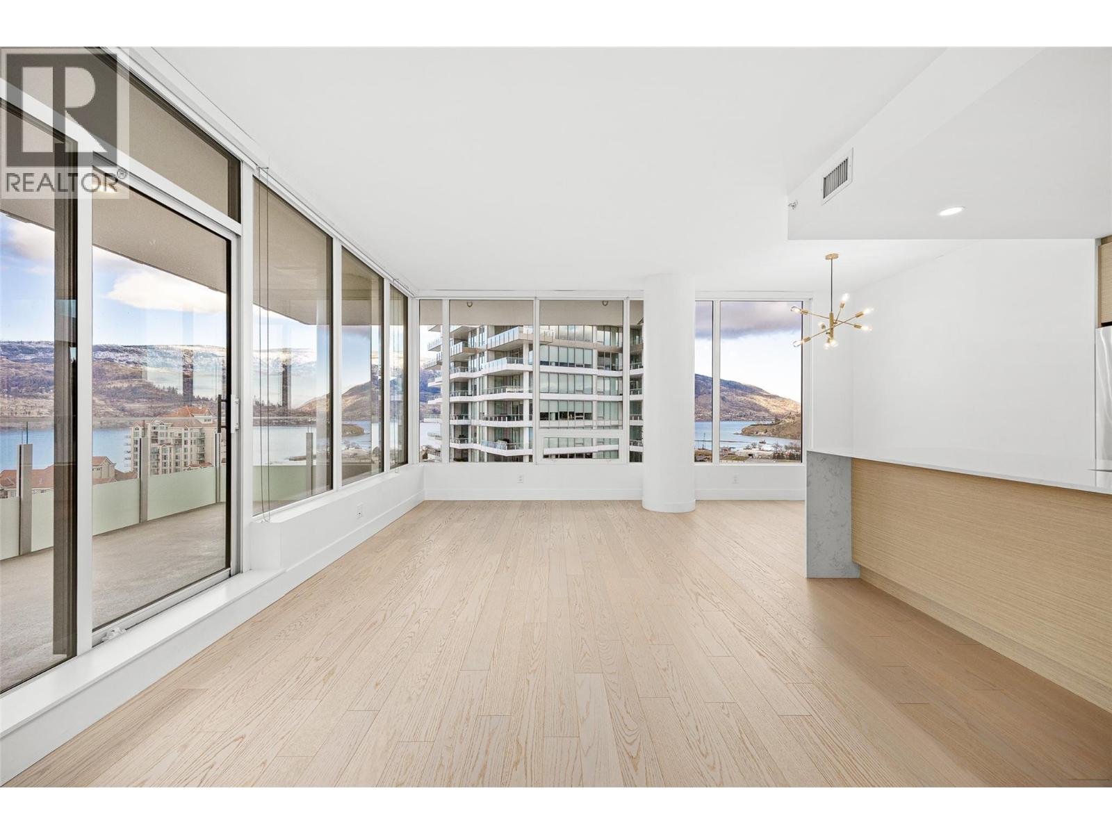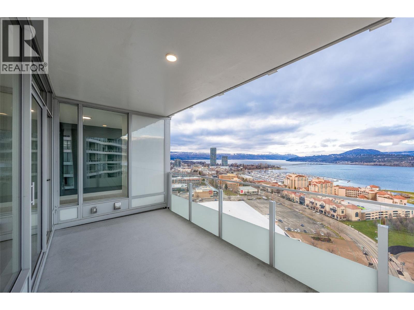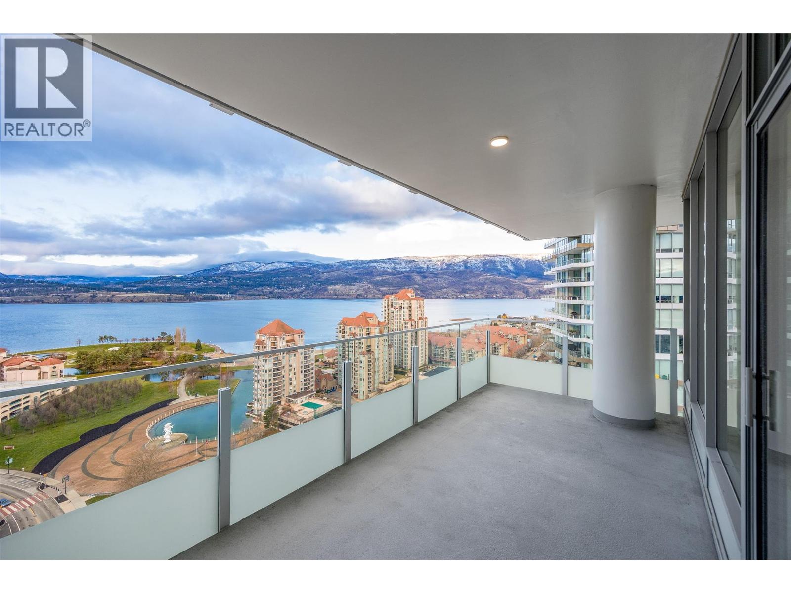 PANORAMIC LAKE VIEWS. Perched high above the city, unit 2205 at One Water Street delivers a true condo-in-the-sky experience with a sweeping west-facing vistas, capturing lake, city mountain & sunset views from every angle! This 2 bed, 2 bath corner unit features an open floor plan where the kitchen, dining and living spaces flow seamlessly to a massive covered sundeck overlooking Kelowna’s waterfront park & Okanagan Lake. The best spot in town to watch boats pass and a front row seat to take in the fireworks! The kitchen blends warm beach tones inspired by Knox Mountain with stainless steel appliances, gas range, island seating, upgraded lighting & near floor to ceiling windows. Custom upgrades include Westwood cabinetry in the primary bedroom and a built-in laundry closet with stacked washer & dryer. The primary bedroom offers a walk-in closet & 3-pc ensuite, while the 2nd bedroom captures jaw-dropping lake views. Ideal as a guest room, office, or flex space! This condo also has a second 4-pc bath with rain shower. Enjoy resort-style amenities: 2 pools, hot tub, fitness centre, yoga studio, steam room, pickleball court, BBQ stations, fire pits, security, guest suites, car wash bay, dog park & more! Includes 1 parking stall near the elevator + 1 storage locker. Convenience meets luxury - live steps to the beaches, restaurants, breweries, coffee shops, Prospera Place, the Cultural District, yacht club + city transit! Move in this spring! A fast possession is possible! (id:21321)