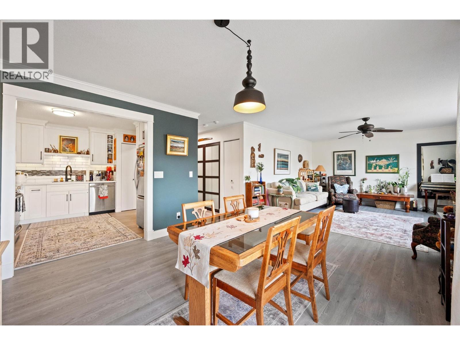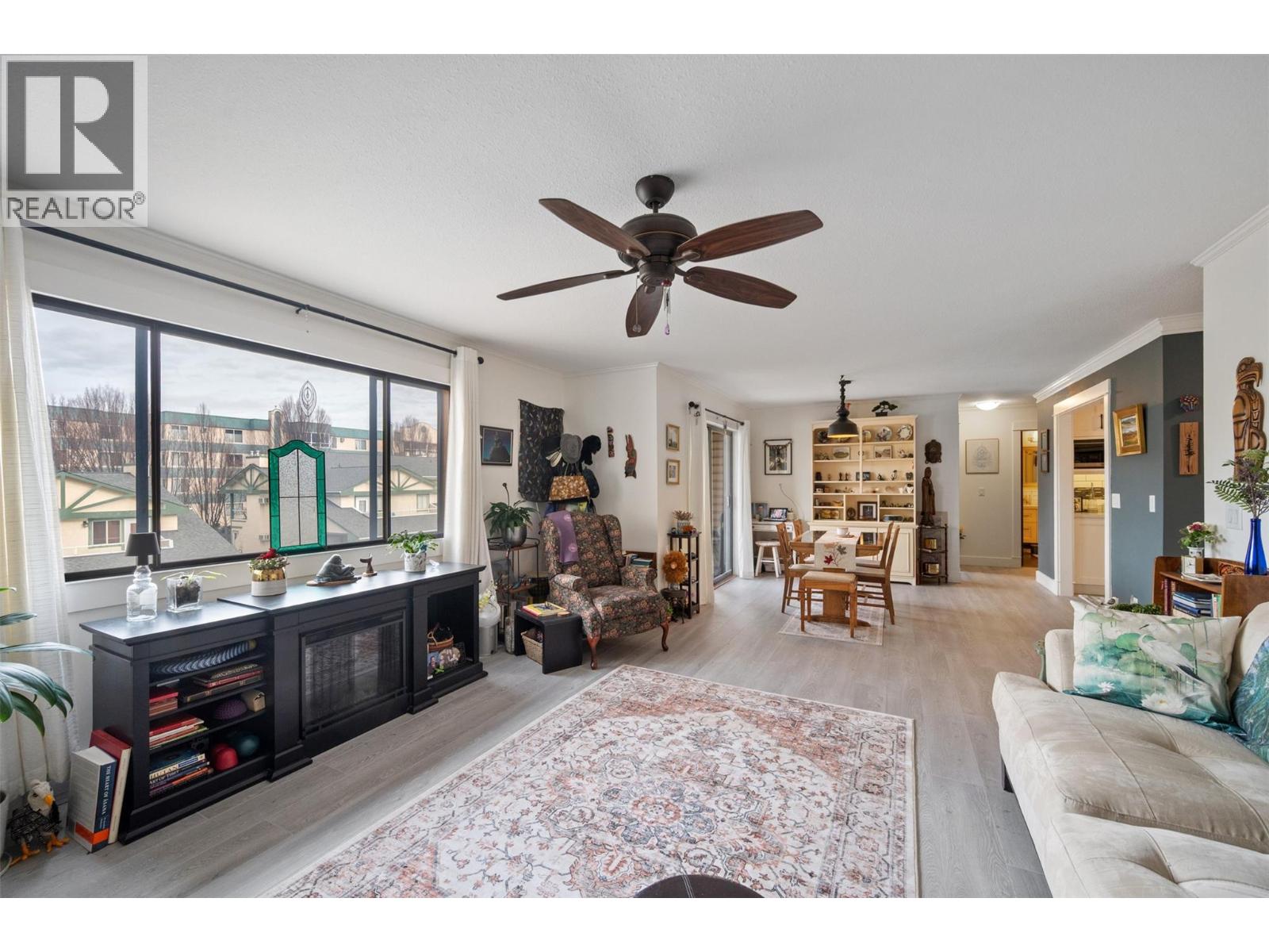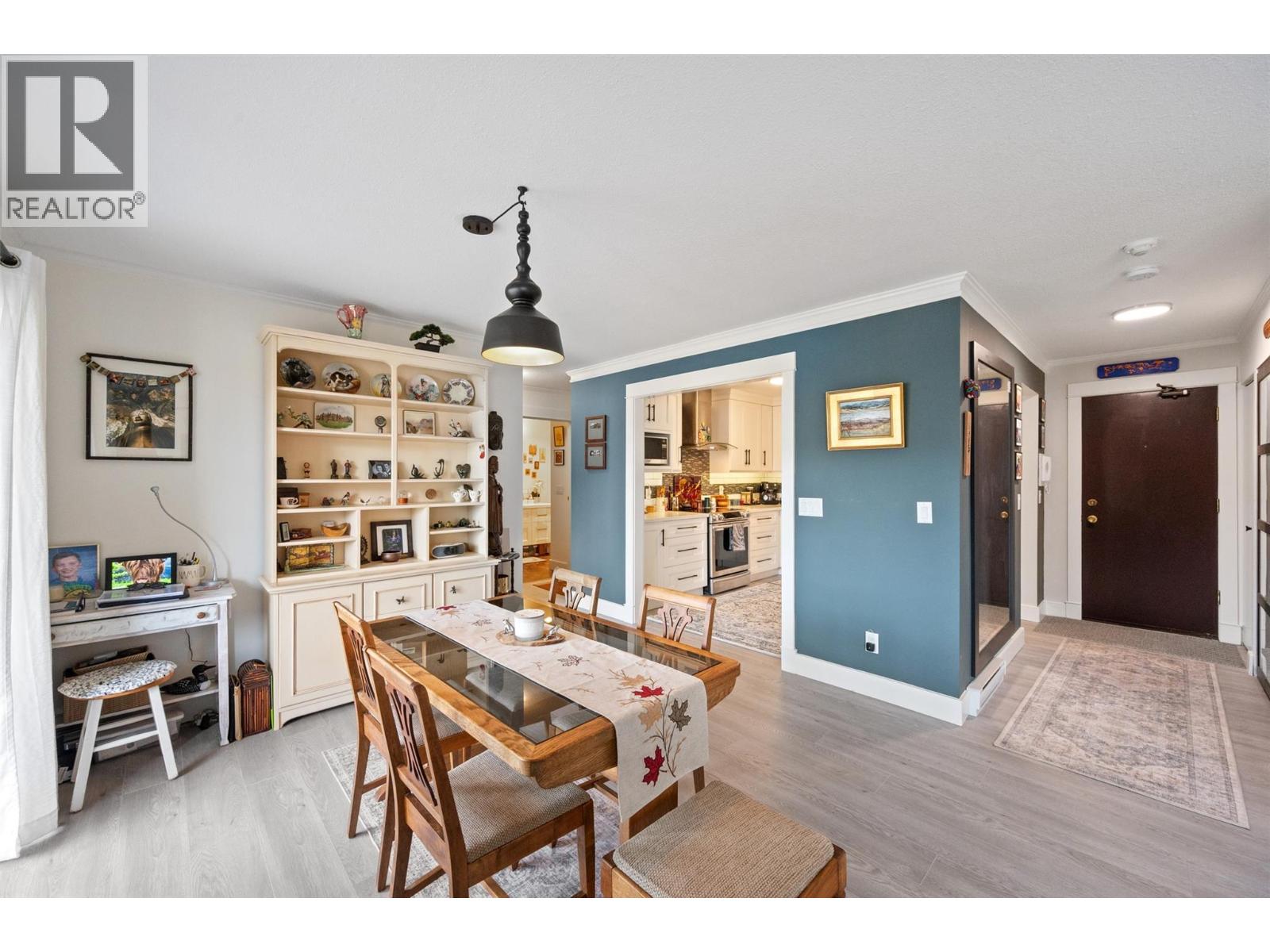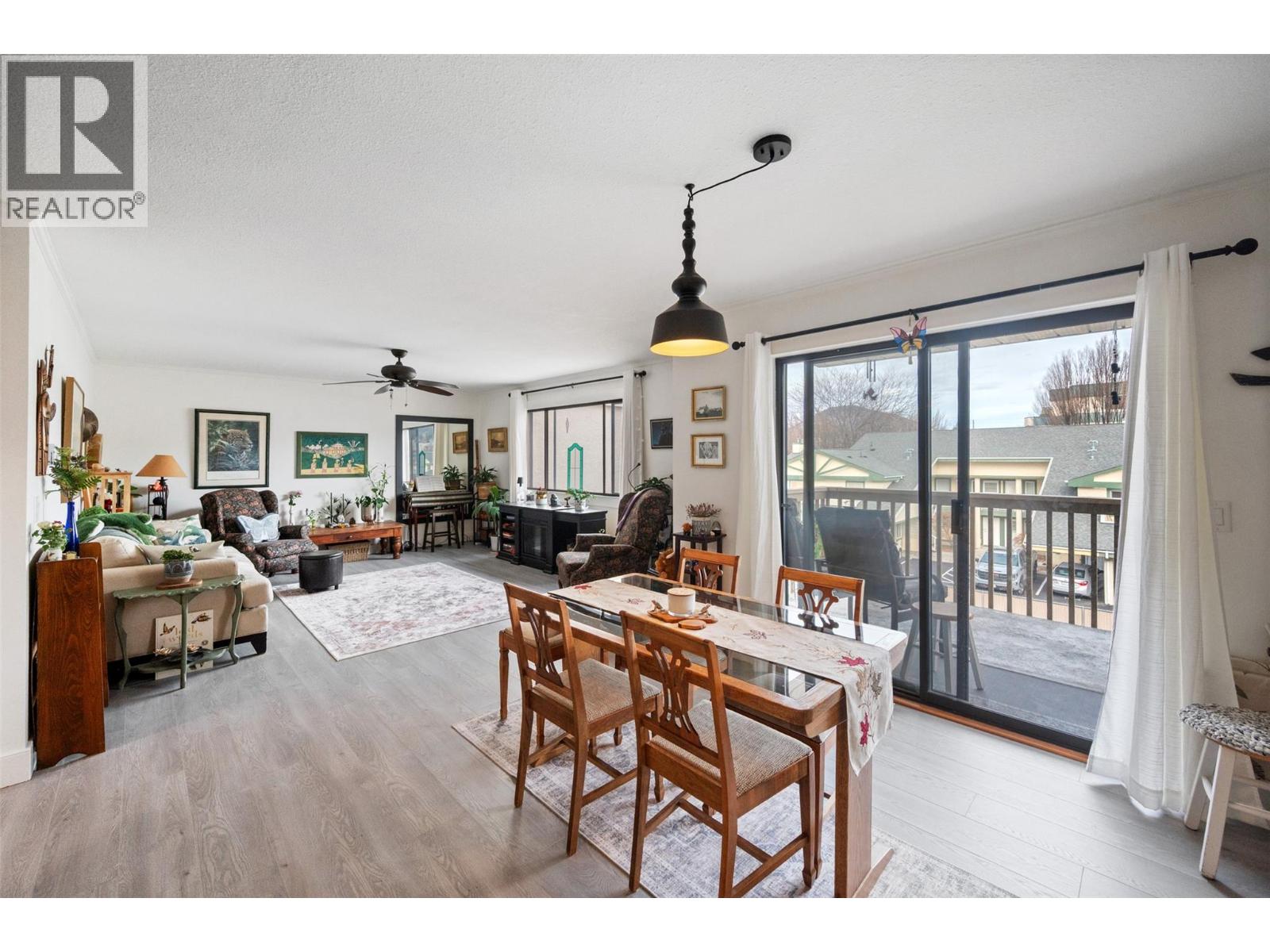 This 985 sq. ft. top-floor condo offers a spacious and functional layout in a central Penticton location. The bright, open-concept living and dining areas are complemented by a modernized kitchen featuring stainless steel appliances. In addition to the large primary bedroom, the floor plan includes a dedicated small office—perfect for a hobby room or workspace—along with the convenience of private in-suite laundry. Outdoor living is a highlight with a good-sized, north-facing covered deck that provides a comfortable retreat while avoiding the intense heat of the midday sun. This 55+ building is a pet-free environment that has been well-maintained, including the recent installation of a new elevator in 2025. One dedicated covered parking spot is included. Perfectly situated for an active lifestyle, the home is just a short walk from local shopping and restaurants, with both Okanagan Lake and Skaha Lake only a quick drive away. (id:21321)