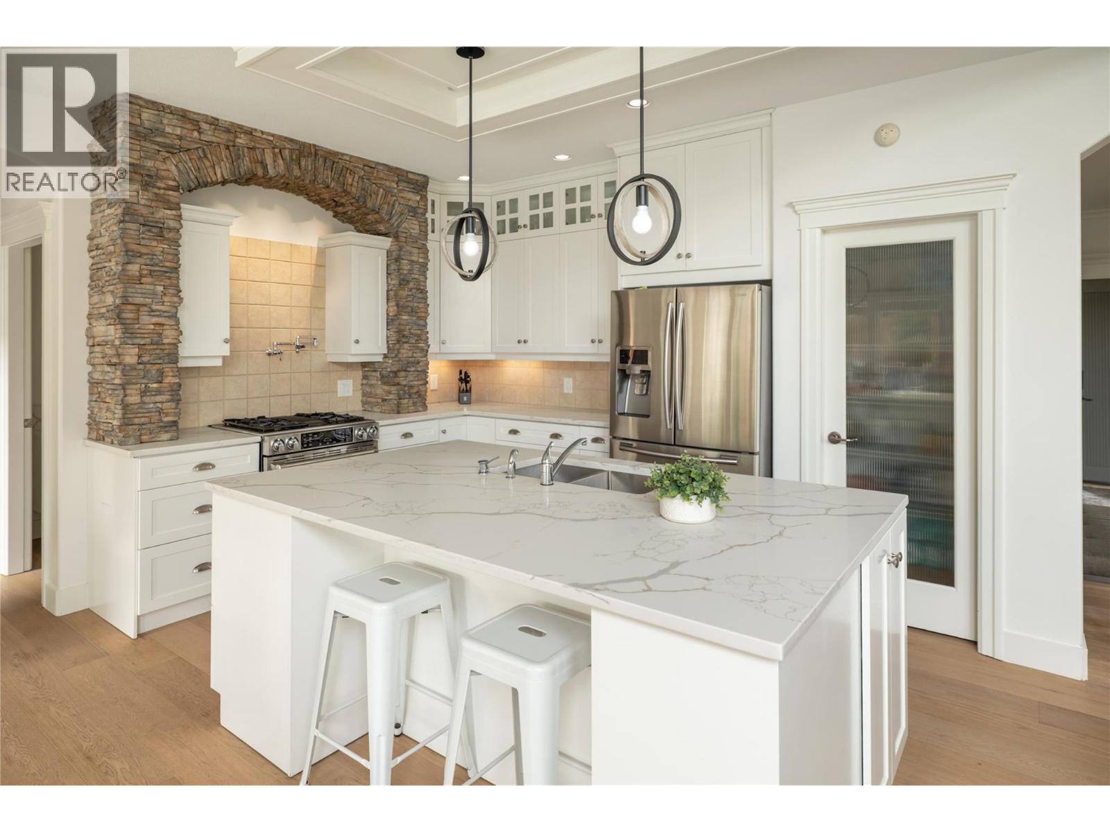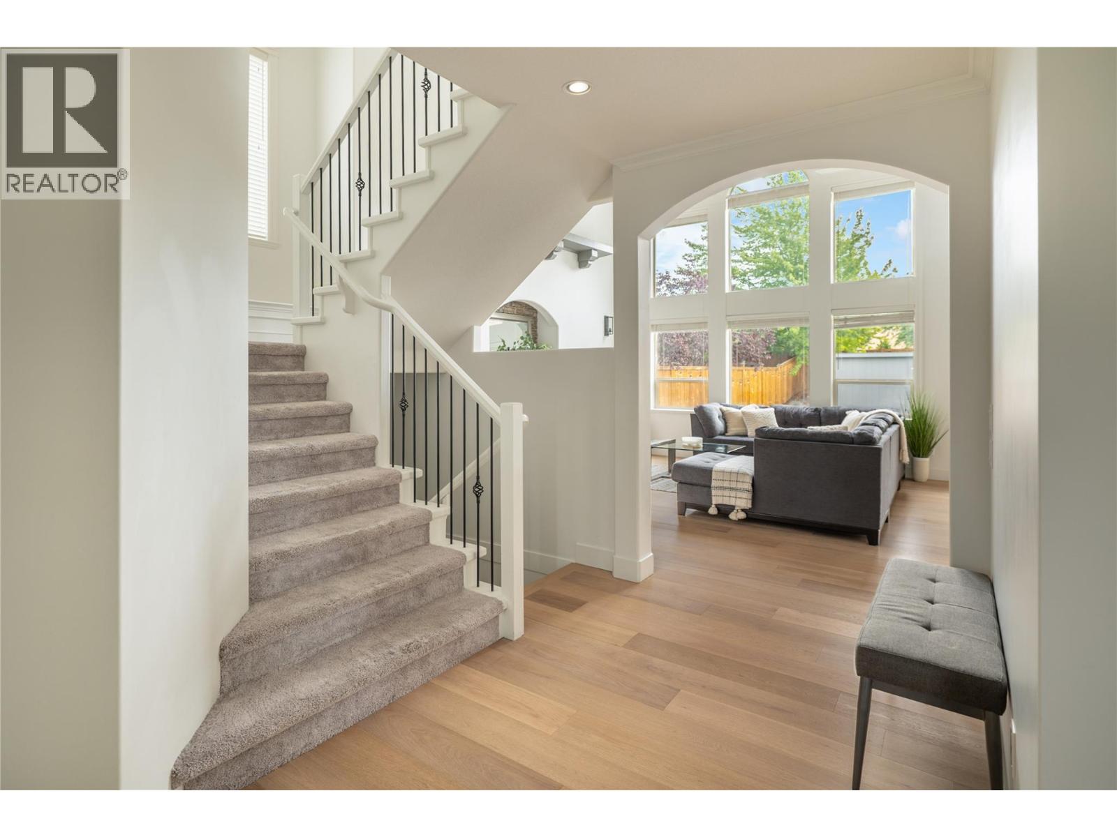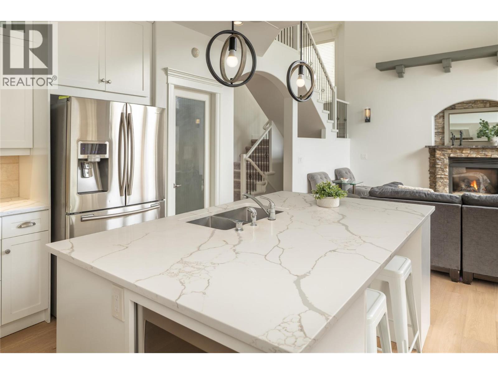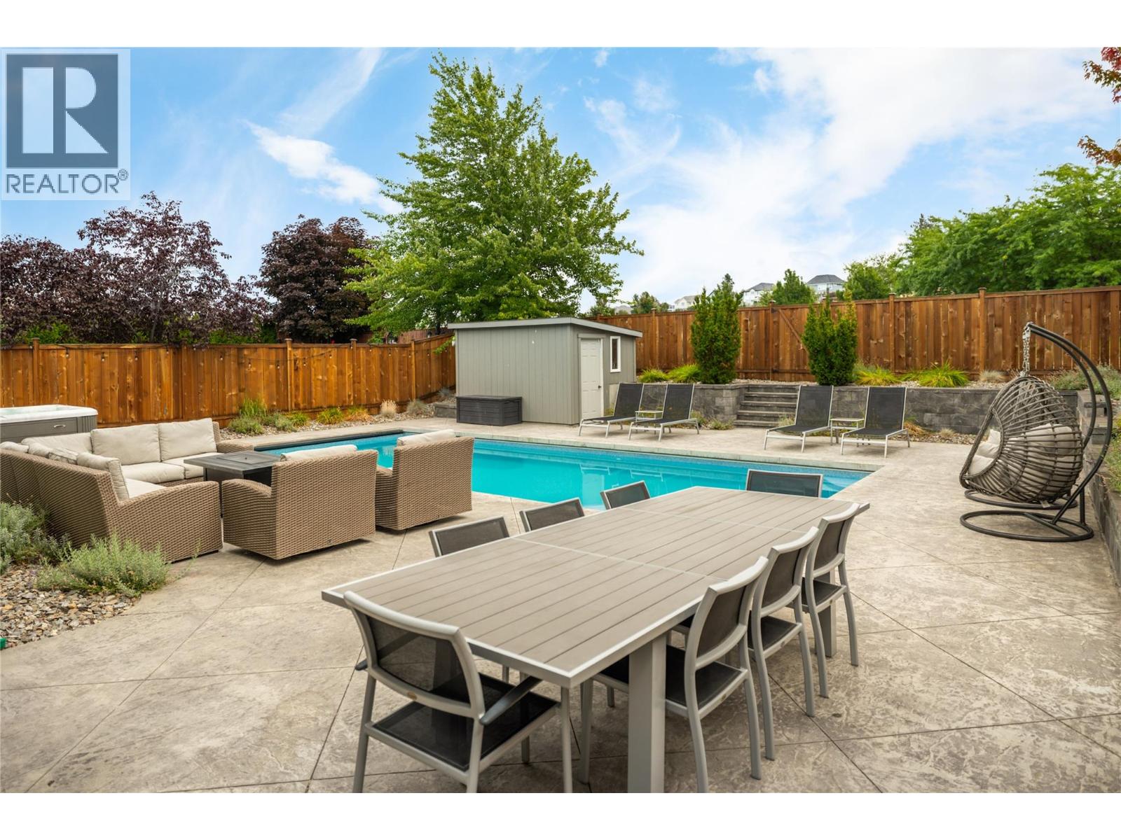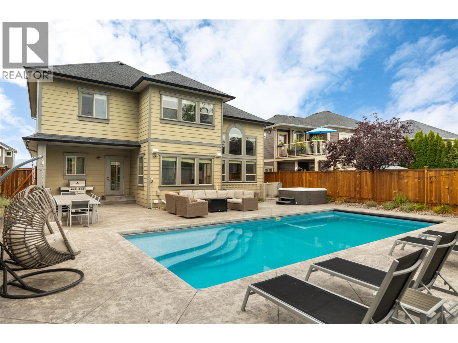 Discover this stunning 3,844 sq. ft. family home in the heart of Kettle Valley, perfectly designed for lifestyle and comfort. The backyard is a true retreat with a saltwater pool featuring an auto cover, a hot tub, and a fully fenced yard that backs directly onto Quilchena Park. The poolside patio flows seamlessly off the main level, allowing you to watch the family swim while preparing meals in the kitchen with its large island, pantry, and abundant storage. Inside, soaring ceilings and a gas fireplace create a warm, open-concept living space. The main floor also offers a bedroom, laundry, and a spacious double garage. Upstairs, three bedrooms plus a loft provide plenty of family space, while the expansive primary suite has double vanities, a soaking tub, walk-in shower, private water closet, and walk-in closet. The lower level adds even more versatility with a large rec room, office/den, additional bedroom and bathroom, plus a separate entrance. Updates include a brand-new high-efficiency furnace and heat pump, a new hot water tank plus a new auto cover for the pool (2023), while features such as a built-in vacuum add convenience. Ideally located within walking distance to schools, parks, coffee shops, and community stores, this home blends luxury with everyday ease. (id:21321)
