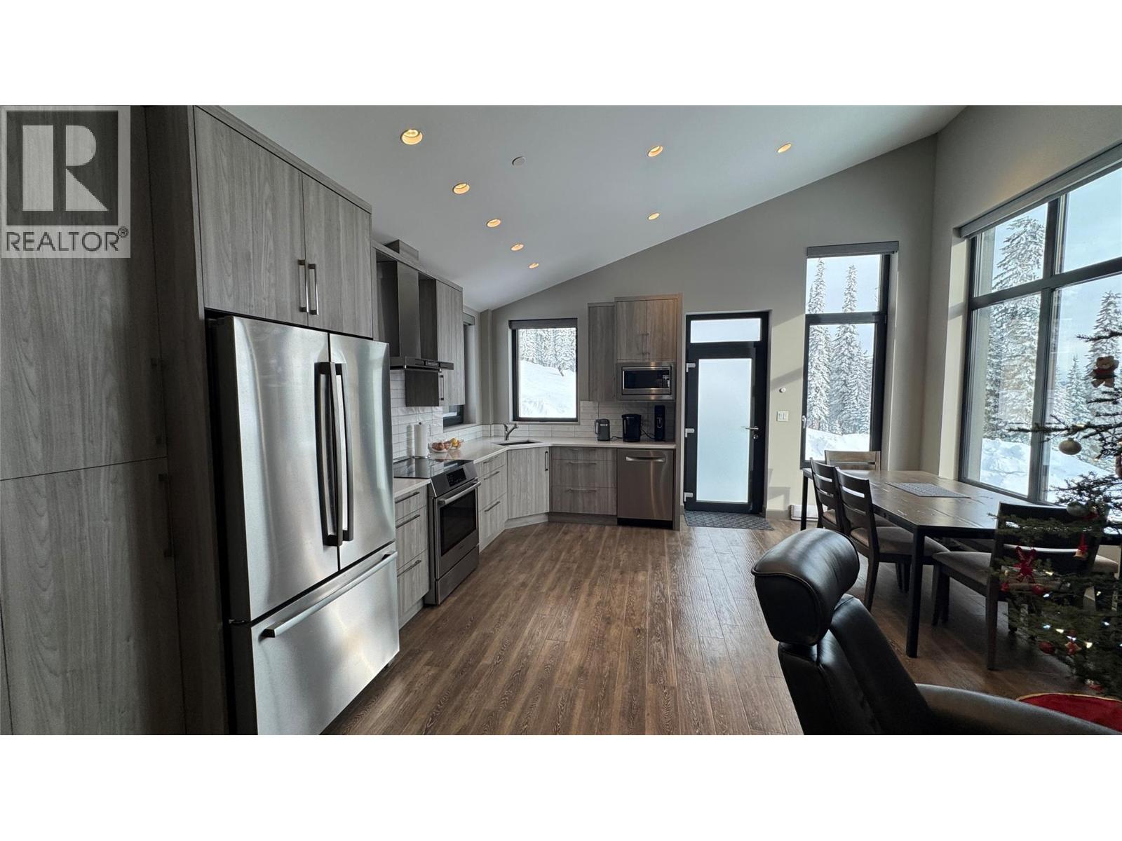 Welcome to 375 Feathertop Way located in the desirable Feathertop Estates. Enjoy true ski-in/ski-out convenience directly from your private ski locker, complete with a ski key rack, and quick access to The Bullet and Black Forest chairlifts. This home showcases 8” thick, heavily insulated exterior walls, triple-glazed European tilt-and-turn windows, and three-point latch European exterior doors, creating an airtight, energy-efficient envelope ideal for mountain conditions. Premium appliances throughout, including Bosch refrigerators and dishwashers on both upper and lower levels, a Bosch induction range in the upper kitchen, and a Bosch convection microwave in the lower kitchenette. The lower-level lock-off suite offers its own laundry and kitchenette, providing excellent flexibility for guests or potential rental income. Energy efficiency continues with LED lighting throughout, a Zehnder high-efficiency heat exchanger, and Dimplex electric baseboard and forced-air heating, each room equipped with individual remote-controlled thermostats. After a day on the slopes, relax by either electric fireplace or unwind in the spa-inspired amenities, including instant hot water at all sinks, an ensuite PRO-240 auto-flush steam generator, Jacuzzi J-345 hot tub with remote control, and a private sauna, also remotely controlled. This exceptional home is ideal for full-time living or a luxurious Big White retreat. (id:21321)