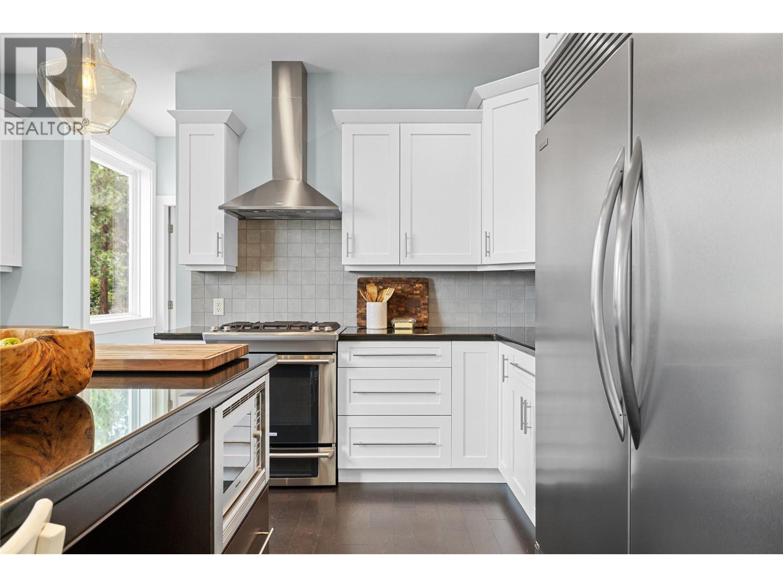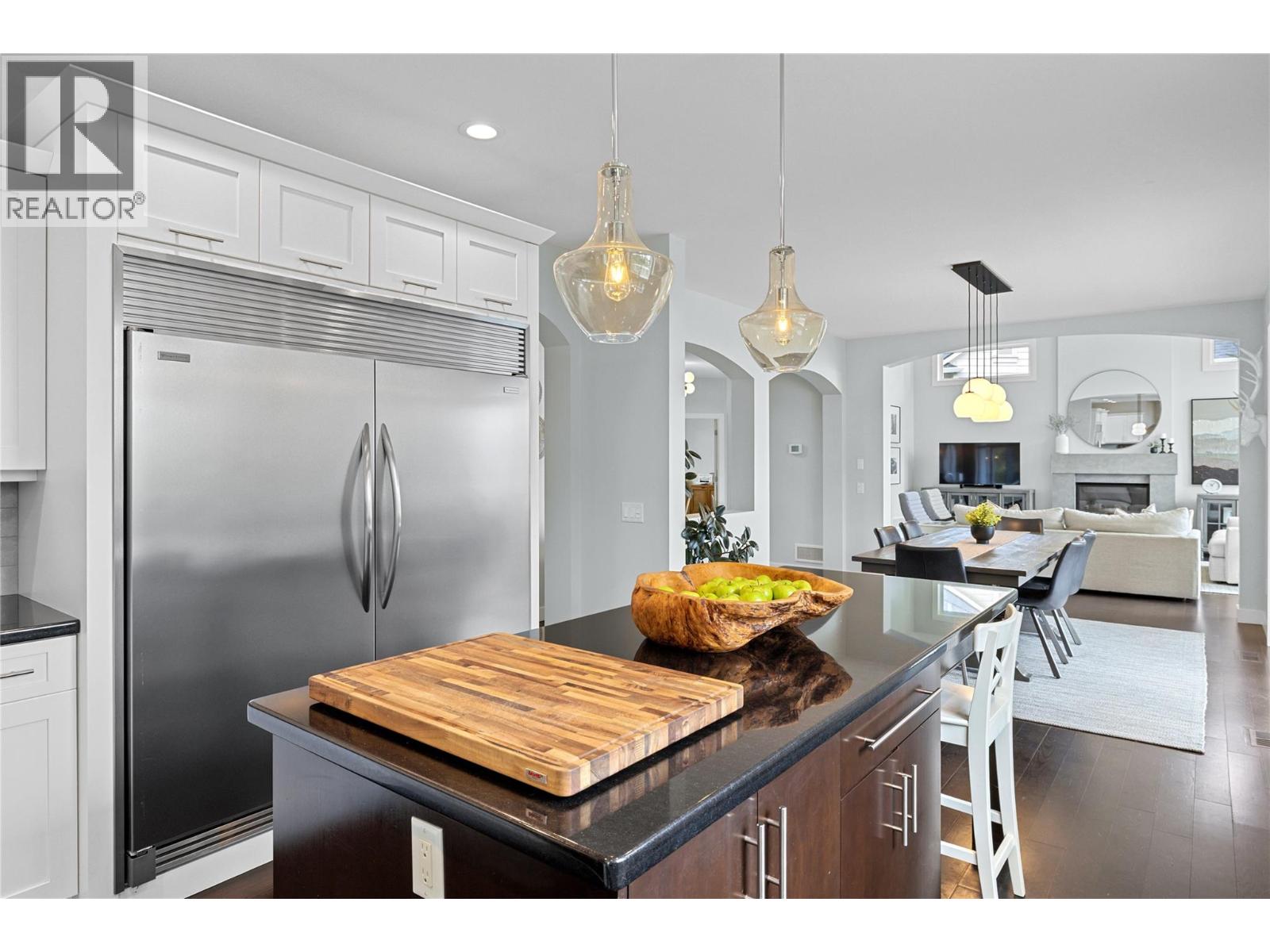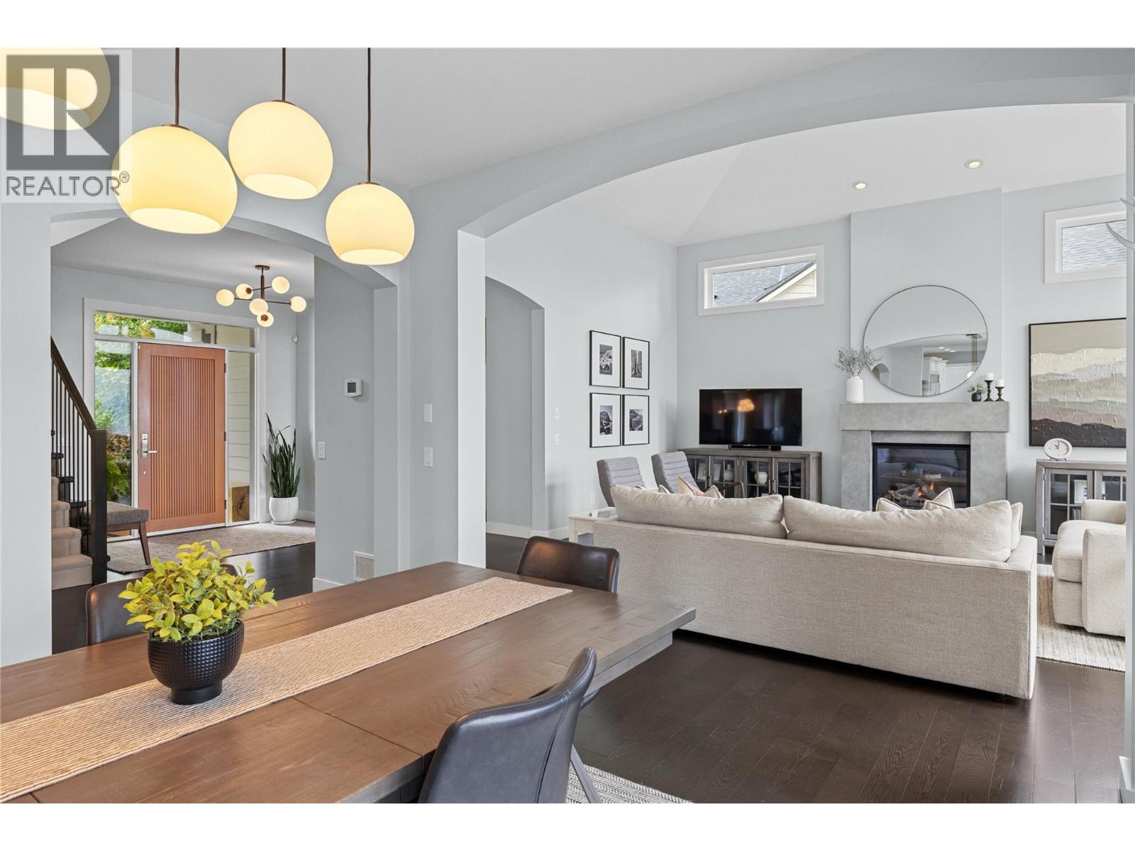 Nestled in the coveted Kettle Valley community, this elegant 4-bedroom + den, 4-bathroom home blends timeless design with breathtaking lake views and thoughtful functionality. Rich engineered hardwood floors lead you through a light-filled interior, where a stunning white designer kitchen awaits—complete with walk-in pantry, serving station, oversized fridge / freezer, gas range, and sleek stainless steel appliances. The open-concept great room is perfect for entertaining, seamlessly extending to a spacious deck ideal for sunset views and outdoor living. A striking double-sided fireplace warms both the serene primary suite and its spa-inspired ensuite featuring marble double vanities, a walk-in shower, and a deep soaker tub. Additional features include multiple walk-in closets, a dedicated gym area, central vacuum, water filtration system, hot water on demand, and a covered hot tub for year-round relaxation. The expansive, lakeview backyard offers endless potential for your outdoor vision, while the oversized double garage easily accommodates all your gear. Located on a quiet street, in a family-friendly neighbourhood near parks, trails and walk-able to top-rated schools, this home offers the perfect balance of luxury, lifestyle, and location. There is nothing for you to do in this incredible home. Simply move in and ENJOY KELOWNA LIFE! (id:21321)