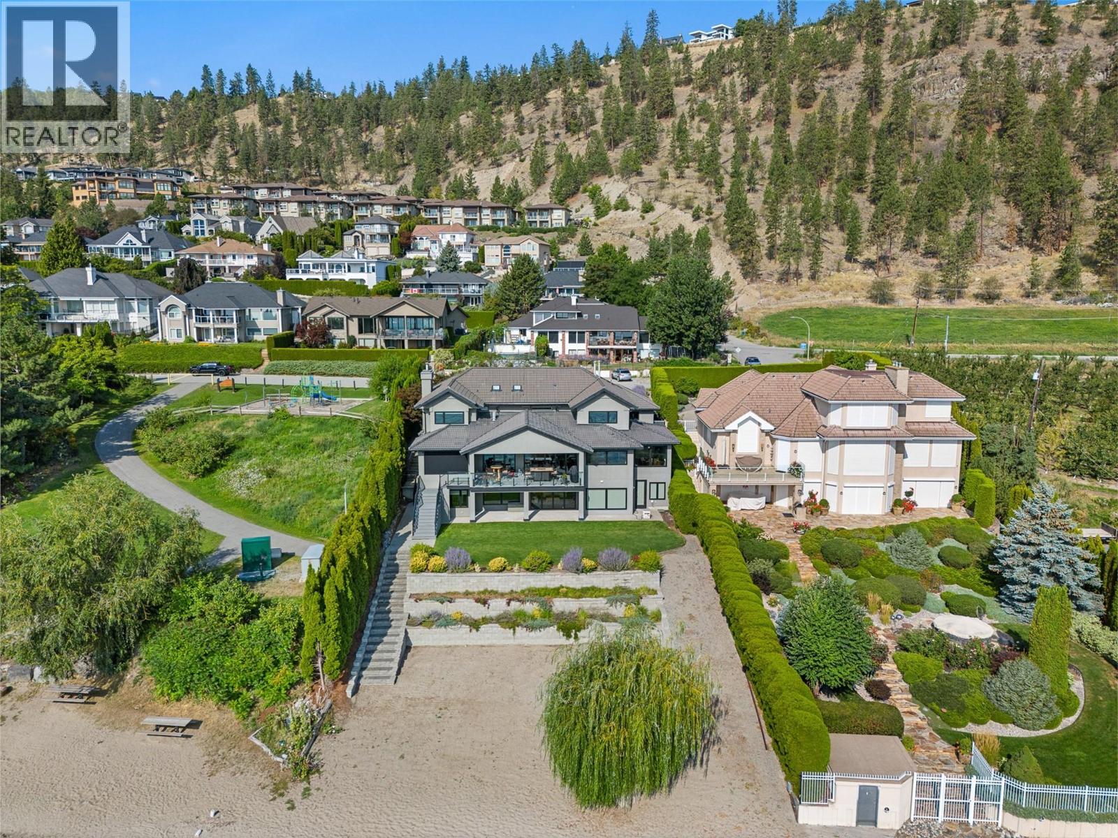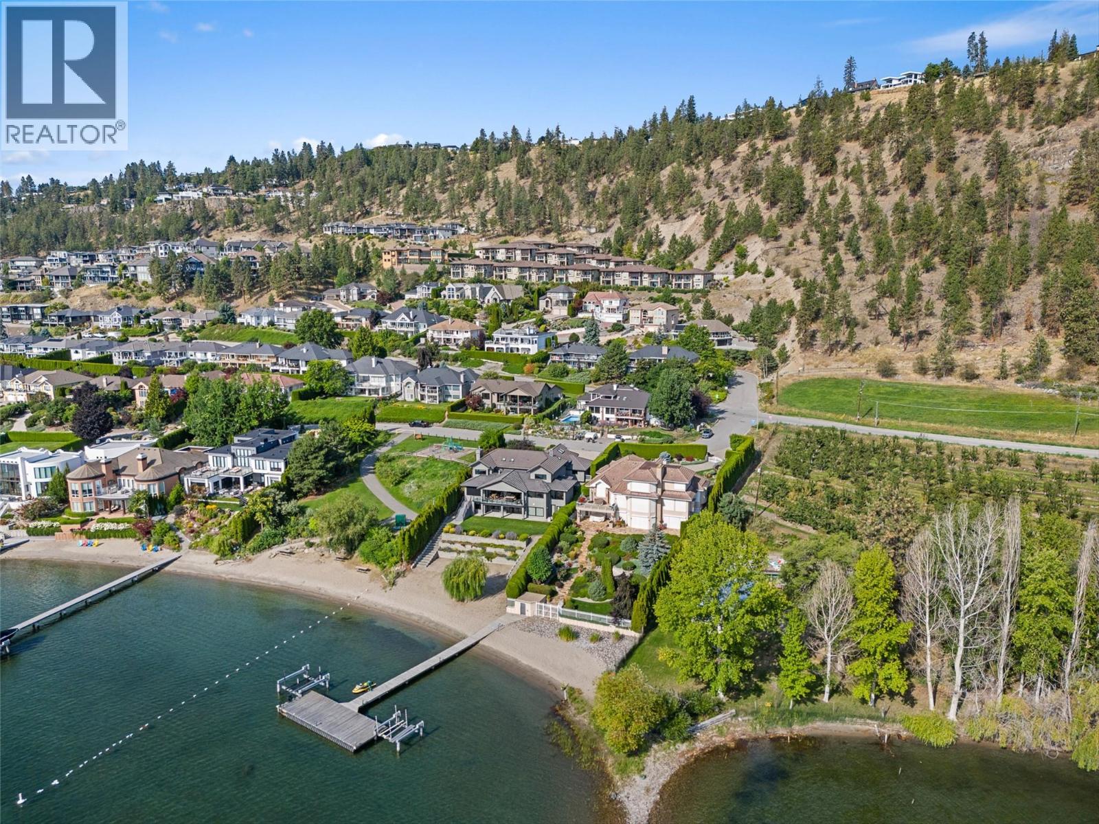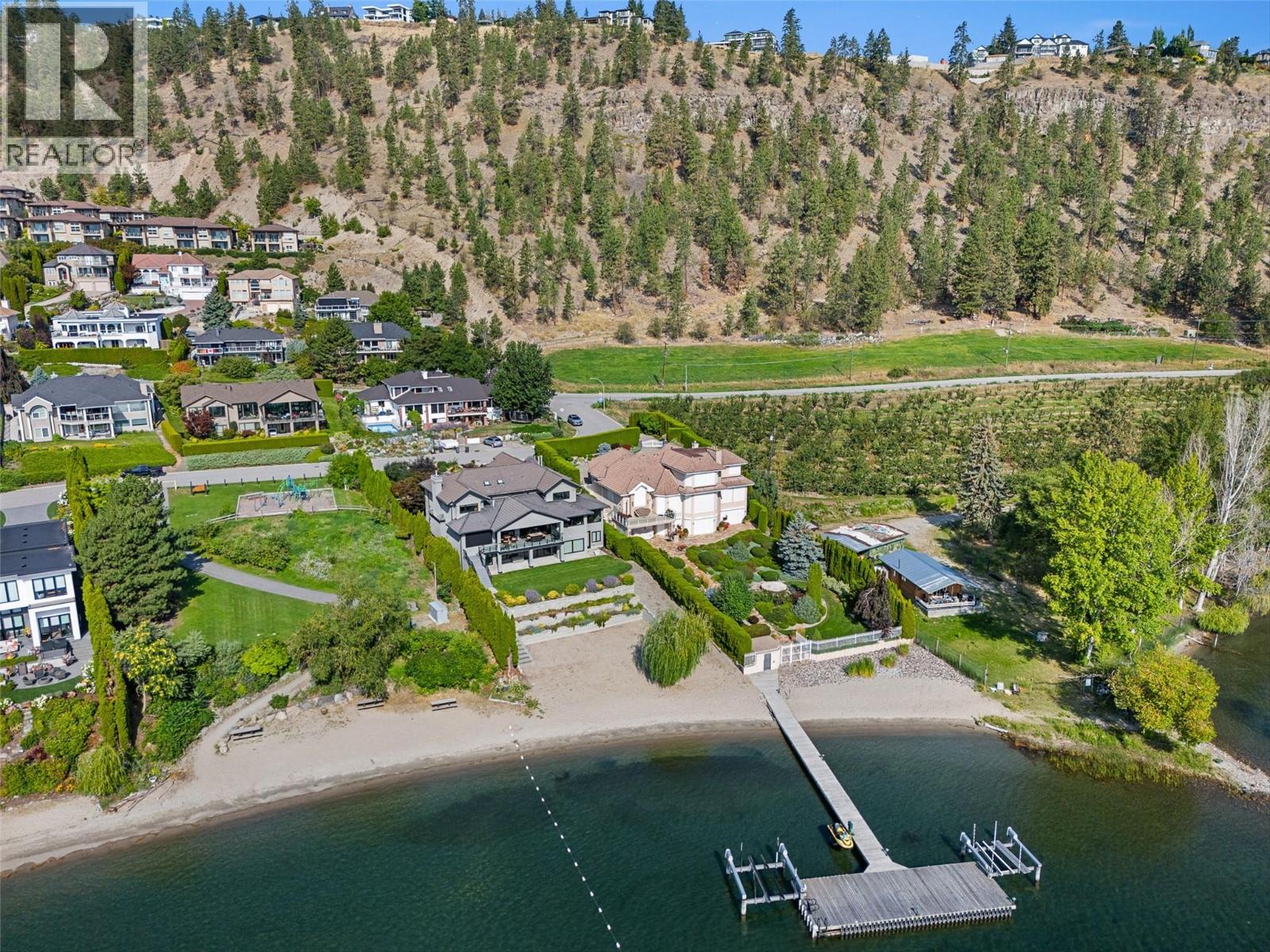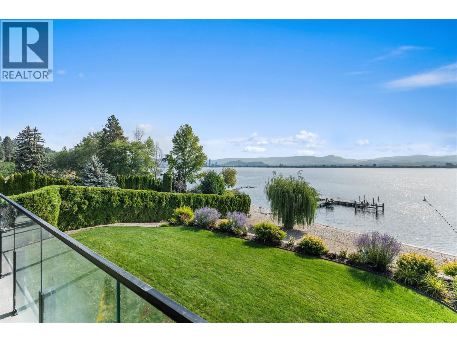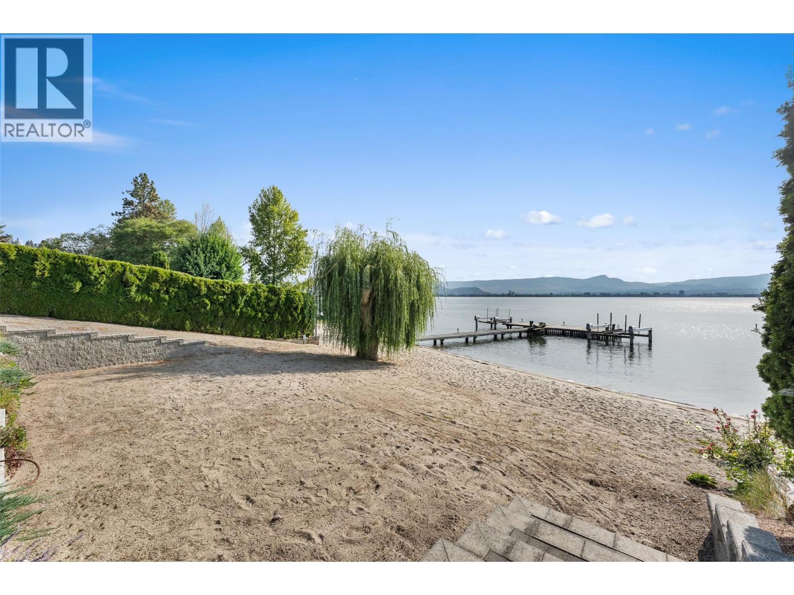 Nestled on a quiet cul de sac in a private waterfront setting, this beautiful customized residence offers a rare opportunity to experience tranquil living on the shores of Okanagan Lake. Surrounded by mature gently sloping grounds, the home blends refined design with a relaxed, resort-inspired lifestyle. Panoramic city and lake view and just minutes into town! A grand foyer with soaring ceilings, skylights and a graceful curved staircase welcomes you inside. The main living area unfolds beneath expansive windows and wall-to-wall Nano doors that open to the covered lakeside deck, creating seamless indoor-outdoor living just steps from the water. At the heart of the home, the chef’s kitchen featuring two islands, including a large L-shaped island with seating for seven, stone countertops, premium Thermador appliances and an oversized walk-in pantry. The primary retreat offers deck access, a custom walk-in closet and a spa-inspired ensuite with heated floors, a freestanding soaker tub and a fully tiled walk-in shower. Additional bedrooms on the upper level provide privacy for family and guests, including a second primary-style suite. The lower level is designed for relaxation with a spacious rec room, temp-controlled wine room, guest suite and walk-out access to the covered patio and backyard. All levels with elevator access! Outside, tiered landscaping leads to a sandy beach and a dock with boat and Seadoo lifts. Heated triple garage and generous driveway parking. (id:21321)