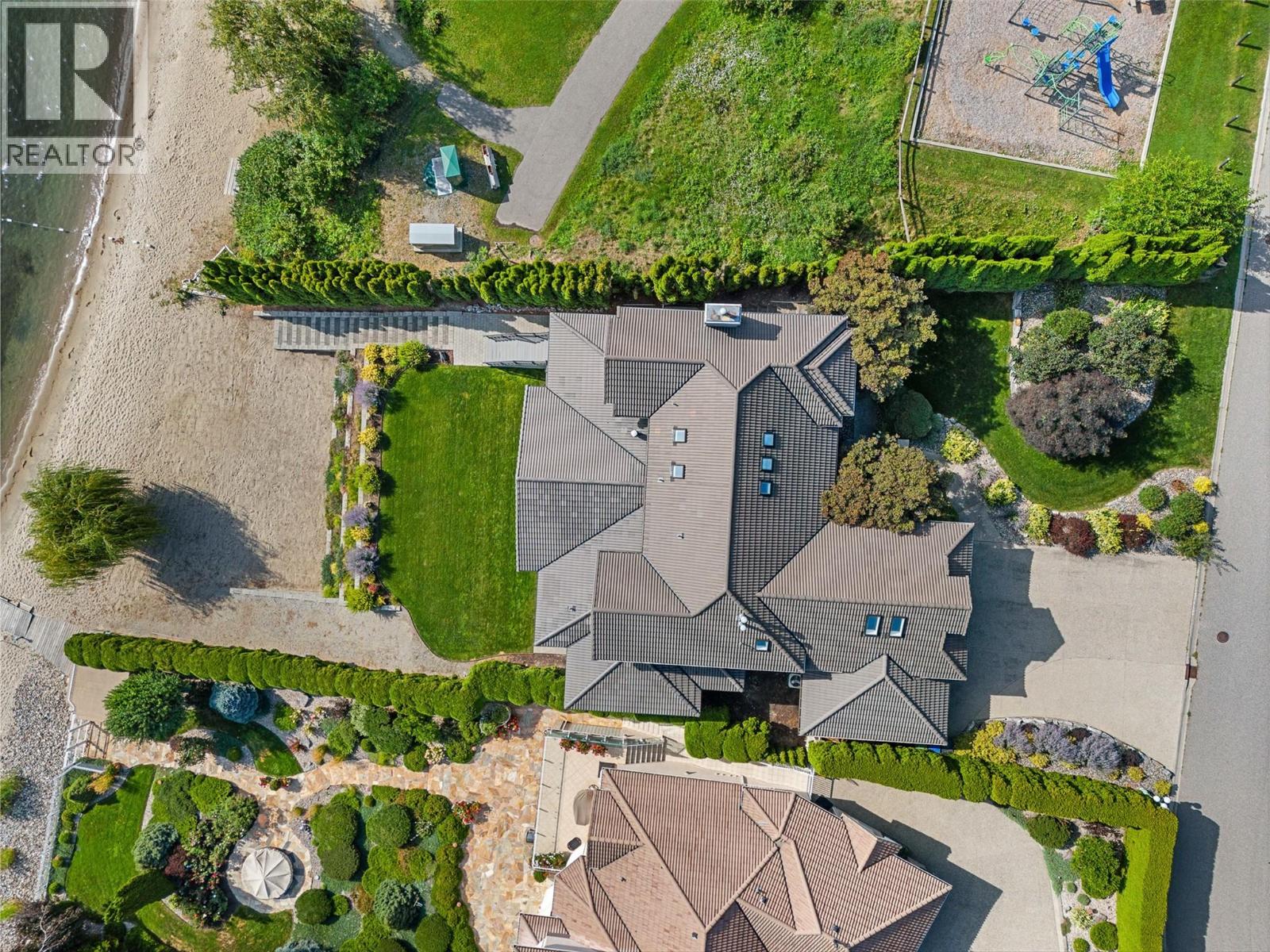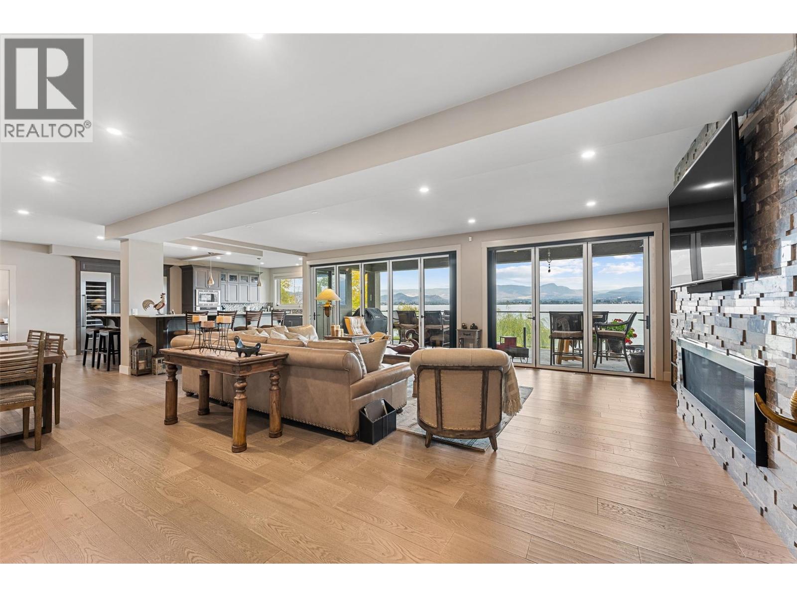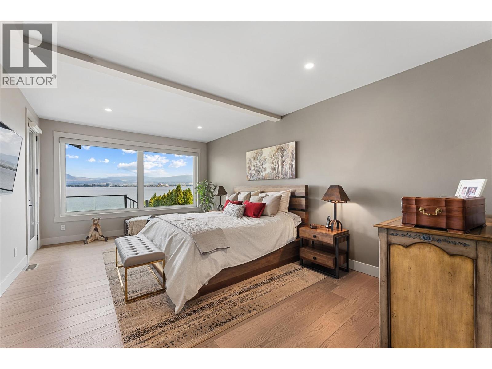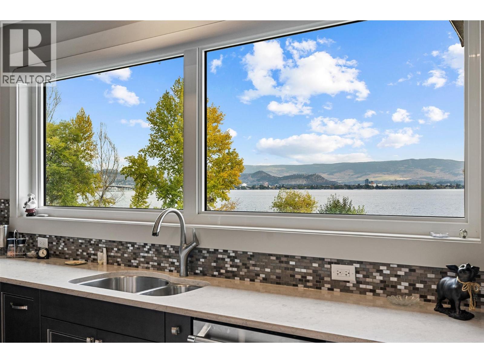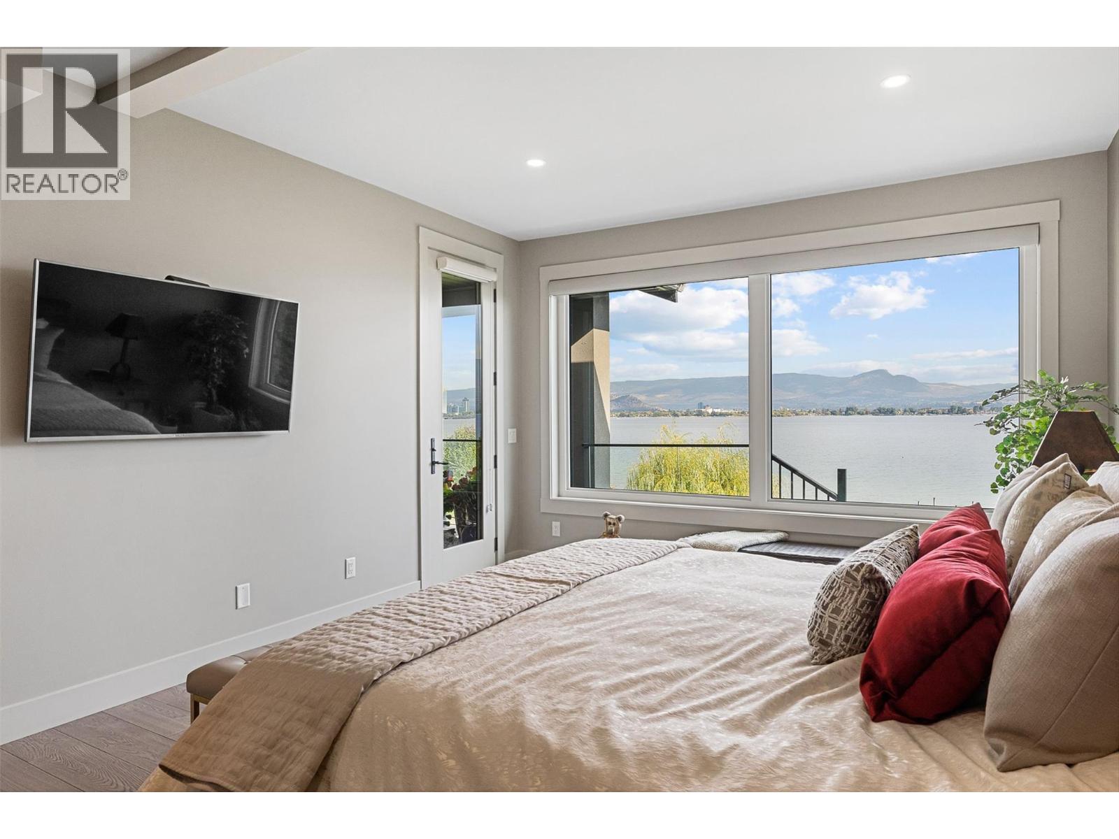 Nestled on a quiet cul de sac in a private waterfront setting, this beautiful customized residence offers a rare opportunity to experience tranquil living on the shores of Okanagan Lake. Surrounded by mature gently sloping grounds, the home blends refined design with a relaxed, resort-inspired lifestyle. Panoramic city and lake view and just minutes into town! A grand foyer with soaring ceilings, skylights and a graceful curved staircase welcomes you inside. The main living area unfolds beneath expansive windows and wall-to-wall Nano doors that open to the covered lakeside deck, creating seamless indoor-outdoor living just steps from the water. At the heart of the home, the chef’s kitchen featuring two islands, including a large L-shaped island with seating for seven, stone countertops, premium Thermador appliances and an oversized walk-in pantry. The primary retreat offers deck access, a custom walk-in closet and a spa-inspired ensuite with heated floors, a freestanding soaker tub and a fully tiled walk-in shower. Additional bedrooms on the upper level provide privacy for family and guests, including a second primary-style suite. The lower level is designed for relaxation with a spacious rec room, temp-controlled wine room, guest suite and walk-out access to the covered patio and backyard. All levels with elevator access! Outside, tiered landscaping leads to a sandy beach and a dock with boat and Seadoo lifts. Heated triple garage and generous driveway parking. (id:21321)