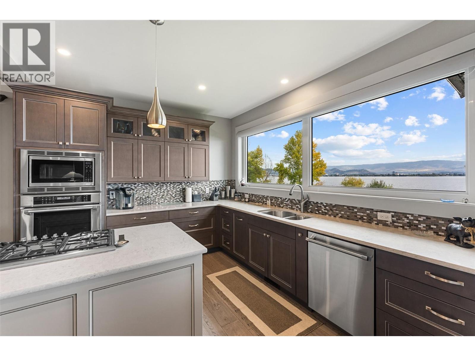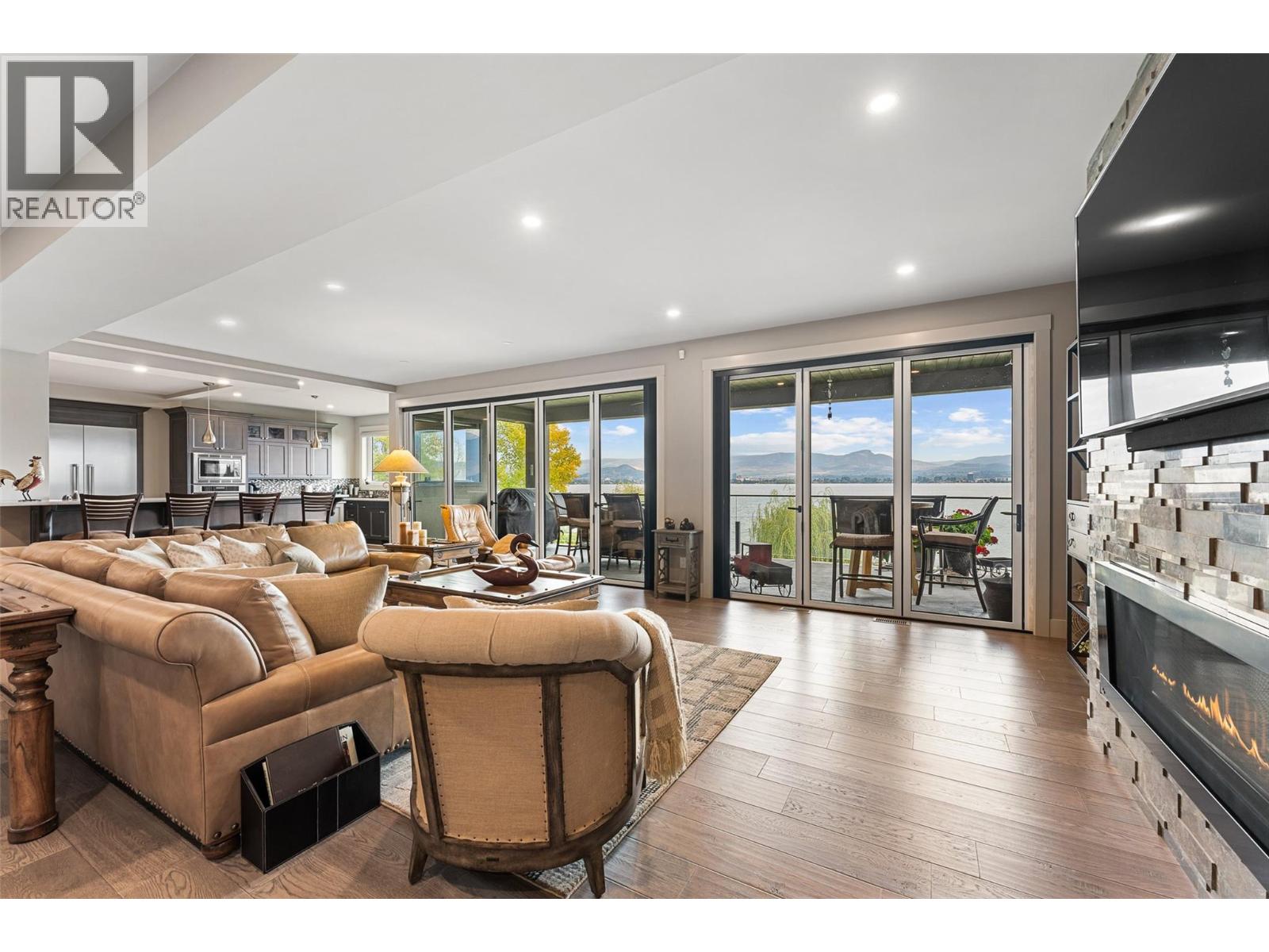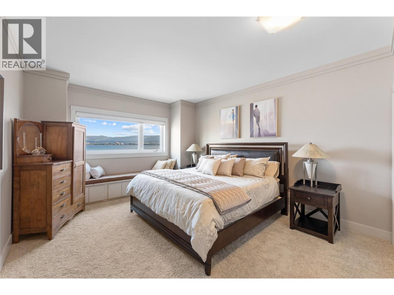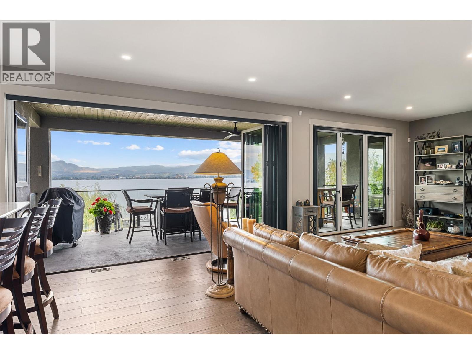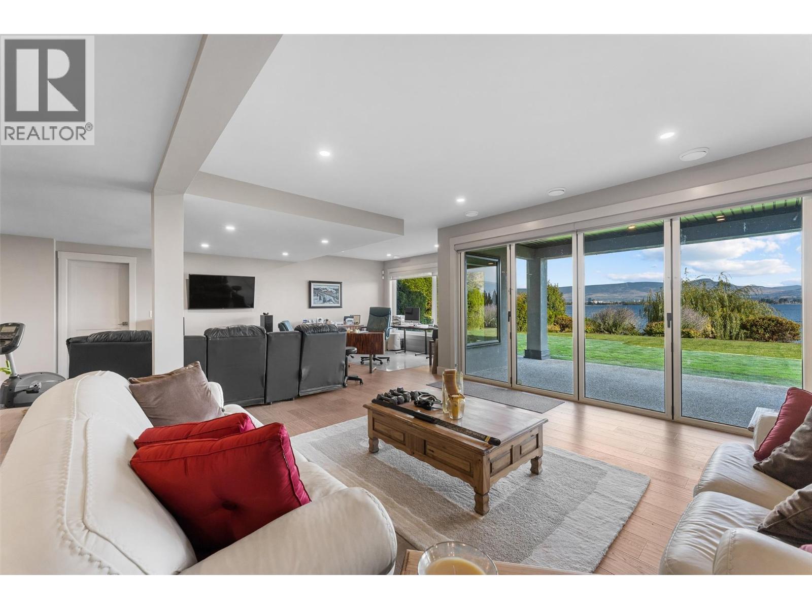 Nestled on a quiet cul de sac in a private waterfront setting, this beautiful customized residence offers a rare opportunity to experience tranquil living on the shores of Okanagan Lake. Surrounded by mature gently sloping grounds, the home blends refined design with a relaxed, resort-inspired lifestyle. Panoramic city and lake view and just minutes into town! A grand foyer with soaring ceilings, skylights and a graceful curved staircase welcomes you inside. The main living area unfolds beneath expansive windows and wall-to-wall Nano doors that open to the covered lakeside deck, creating seamless indoor-outdoor living just steps from the water. At the heart of the home, the chef’s kitchen featuring two islands, including a large L-shaped island with seating for seven, stone countertops, premium Thermador appliances and an oversized walk-in pantry. The primary retreat offers deck access, a custom walk-in closet and a spa-inspired ensuite with heated floors, a freestanding soaker tub and a fully tiled walk-in shower. Additional bedrooms on the upper level provide privacy for family and guests, including a second primary-style suite. The lower level is designed for relaxation with a spacious rec room, temp-controlled wine room, guest suite and walk-out access to the covered patio and backyard. All levels with elevator access! Outside, tiered landscaping leads to a sandy beach and a dock with boat and Seadoo lifts. Heated triple garage and generous driveway parking. (id:21321)