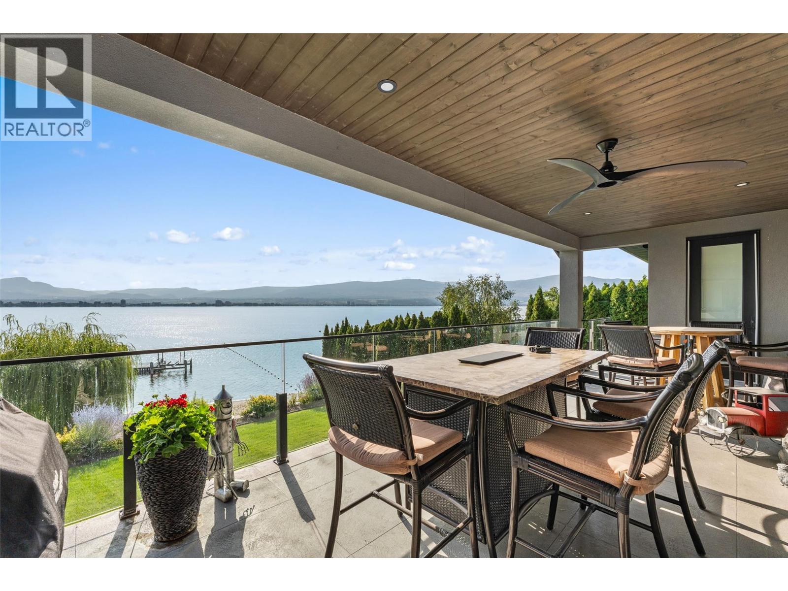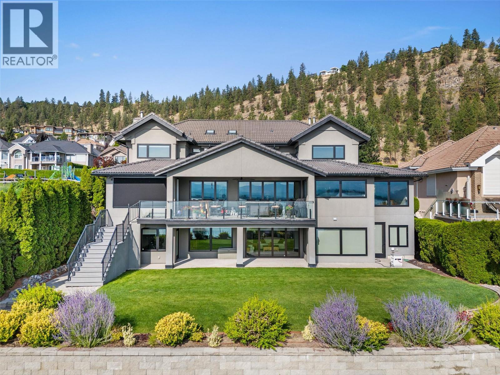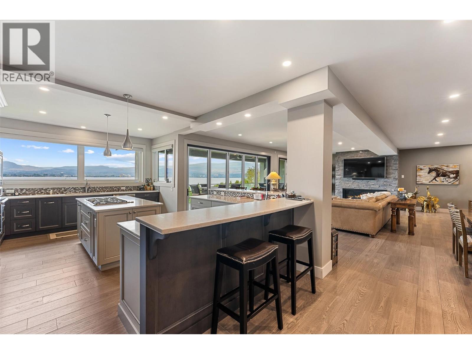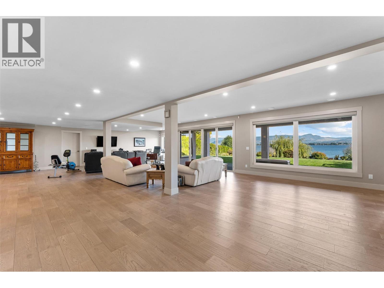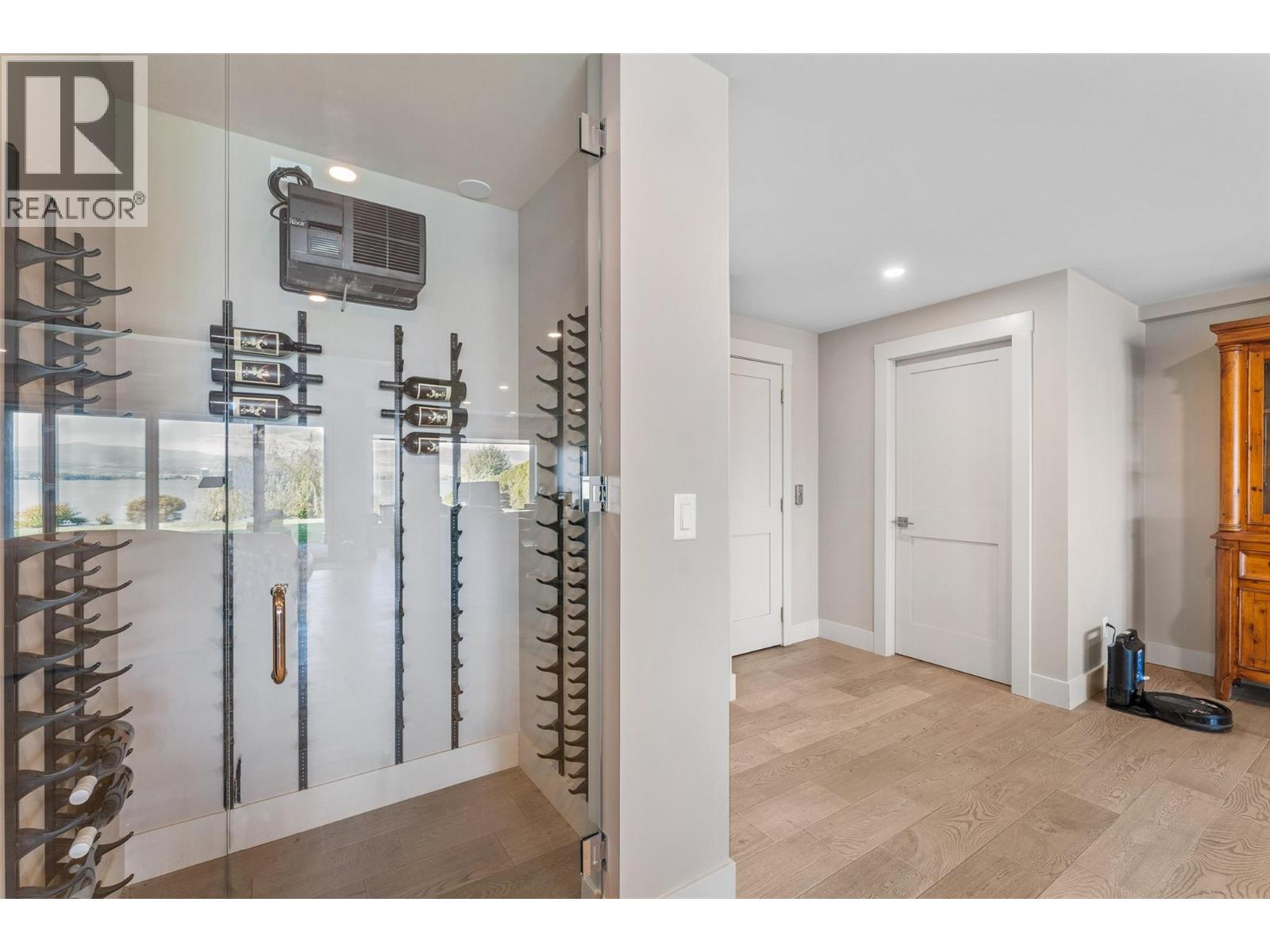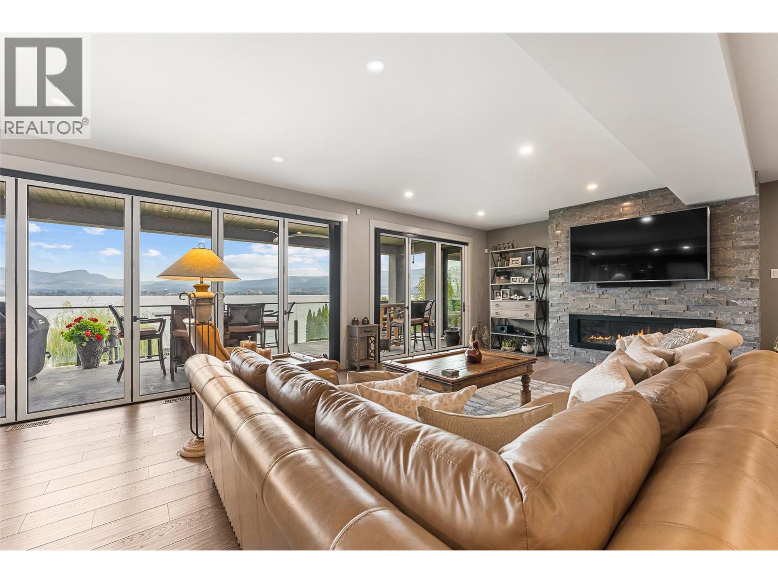 Nestled on a quiet cul de sac in a private waterfront setting, this beautiful customized residence offers a rare opportunity to experience tranquil living on the shores of Okanagan Lake. Surrounded by mature gently sloping grounds, the home blends refined design with a relaxed, resort-inspired lifestyle. Panoramic city and lake view and just minutes into town! A grand foyer with soaring ceilings, skylights and a graceful curved staircase welcomes you inside. The main living area unfolds beneath expansive windows and wall-to-wall Nano doors that open to the covered lakeside deck, creating seamless indoor-outdoor living just steps from the water. At the heart of the home, the chef’s kitchen featuring two islands, including a large L-shaped island with seating for seven, stone countertops, premium Thermador appliances and an oversized walk-in pantry. The primary retreat offers deck access, a custom walk-in closet and a spa-inspired ensuite with heated floors, a freestanding soaker tub and a fully tiled walk-in shower. Additional bedrooms on the upper level provide privacy for family and guests, including a second primary-style suite. The lower level is designed for relaxation with a spacious rec room, temp-controlled wine room, guest suite and walk-out access to the covered patio and backyard. All levels with elevator access! Outside, tiered landscaping leads to a sandy beach and a dock with boat and Seadoo lifts. Heated triple garage and generous driveway parking. (id:21321)