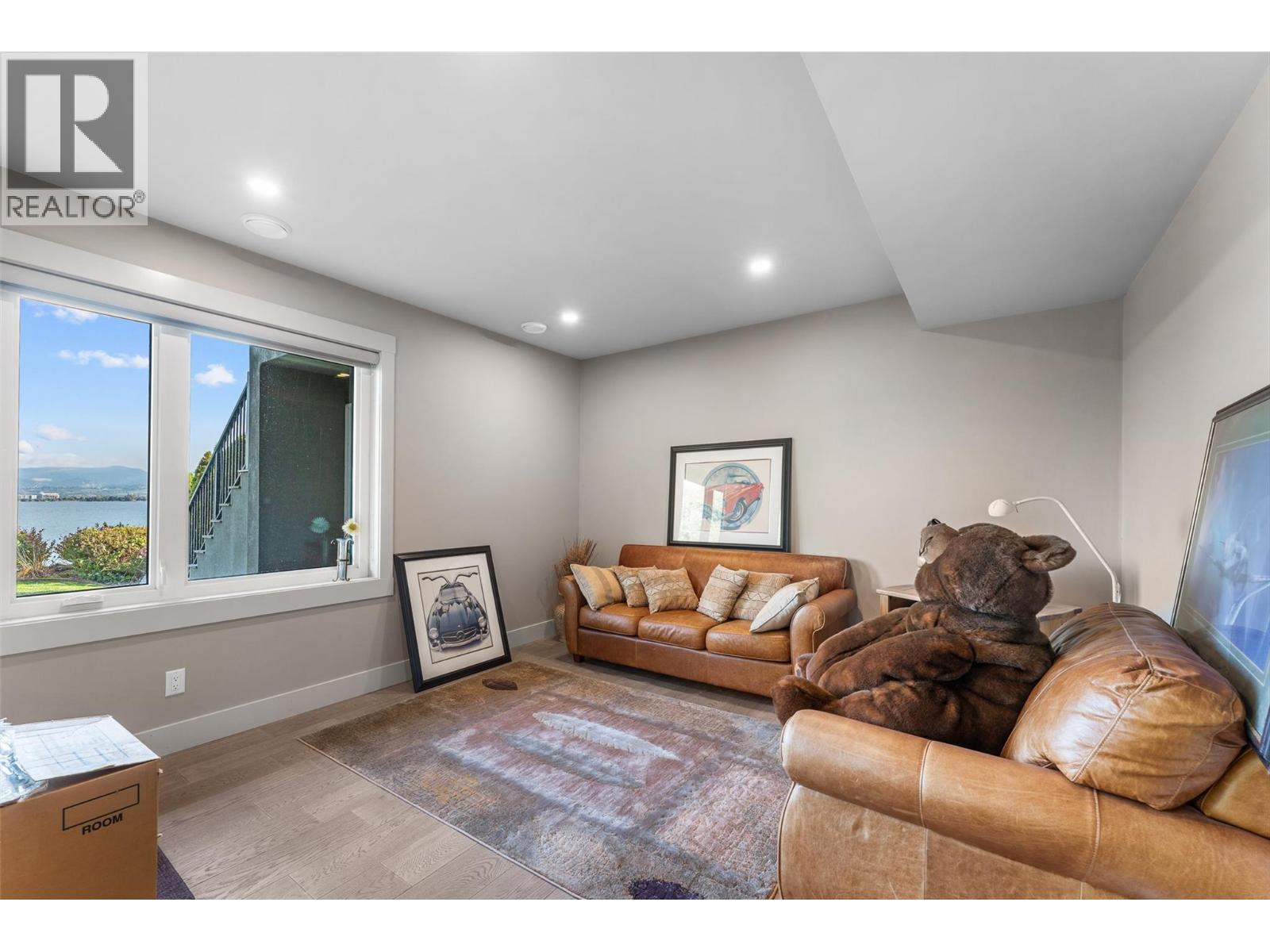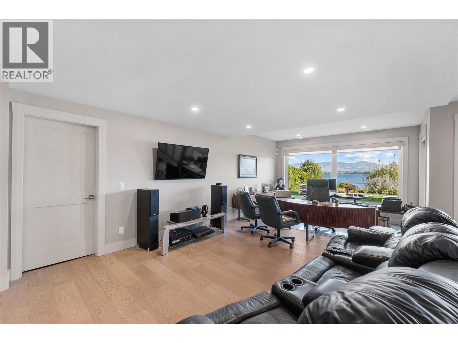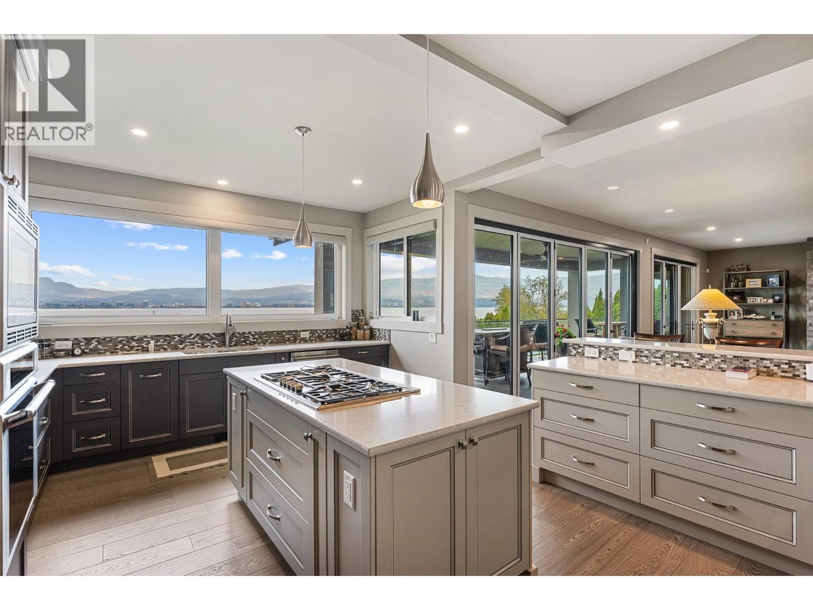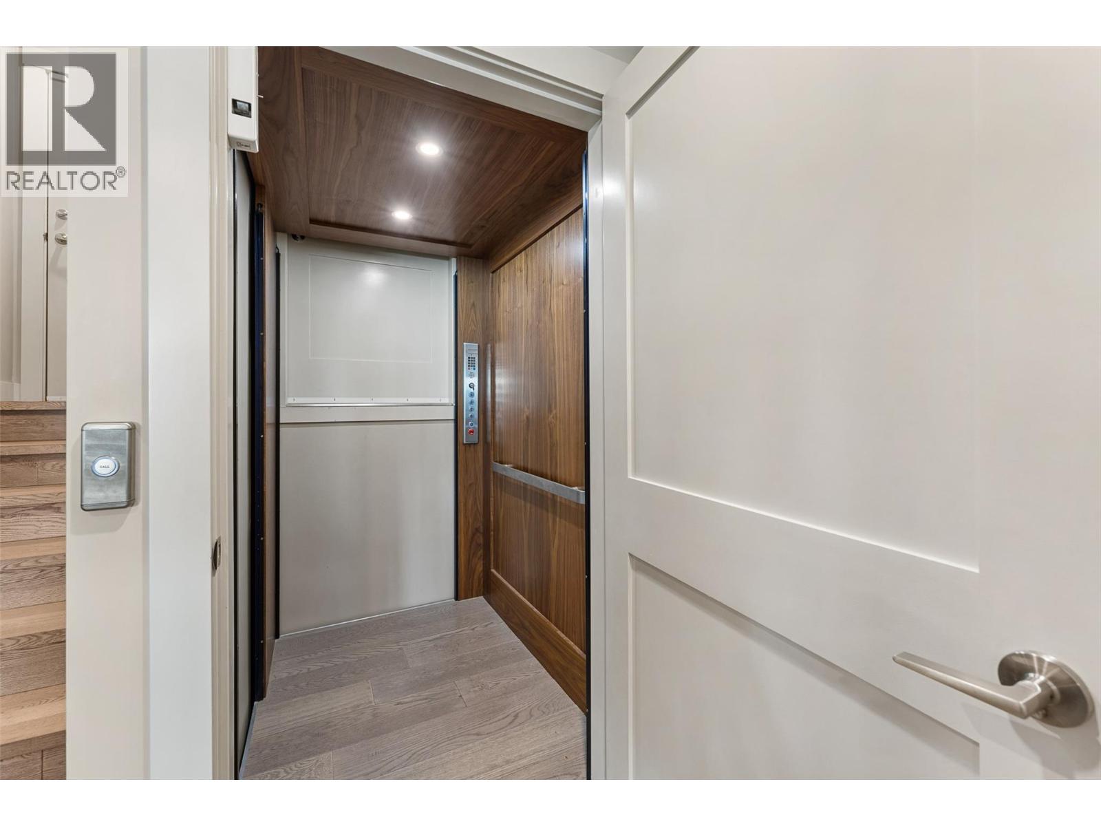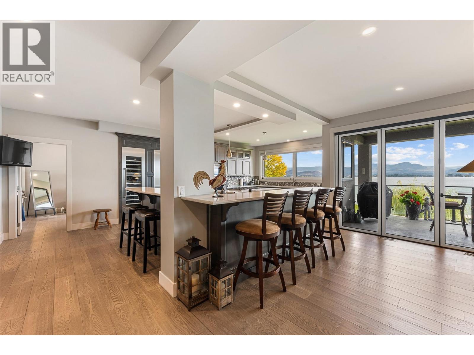 Nestled on a quiet cul de sac in a private waterfront setting, this beautiful customized residence offers a rare opportunity to experience tranquil living on the shores of Okanagan Lake. Surrounded by mature gently sloping grounds, the home blends refined design with a relaxed, resort-inspired lifestyle. Panoramic city and lake view and just minutes into town! A grand foyer with soaring ceilings, skylights and a graceful curved staircase welcomes you inside. The main living area unfolds beneath expansive windows and wall-to-wall Nano doors that open to the covered lakeside deck, creating seamless indoor-outdoor living just steps from the water. At the heart of the home, the chef’s kitchen featuring two islands, including a large L-shaped island with seating for seven, stone countertops, premium Thermador appliances and an oversized walk-in pantry. The primary retreat offers deck access, a custom walk-in closet and a spa-inspired ensuite with heated floors, a freestanding soaker tub and a fully tiled walk-in shower. Additional bedrooms on the upper level provide privacy for family and guests, including a second primary-style suite. The lower level is designed for relaxation with a spacious rec room, temp-controlled wine room, guest suite and walk-out access to the covered patio and backyard. All levels with elevator access! Outside, tiered landscaping leads to a sandy beach and a dock with boat and Seadoo lifts. Heated triple garage and generous driveway parking. (id:21321)