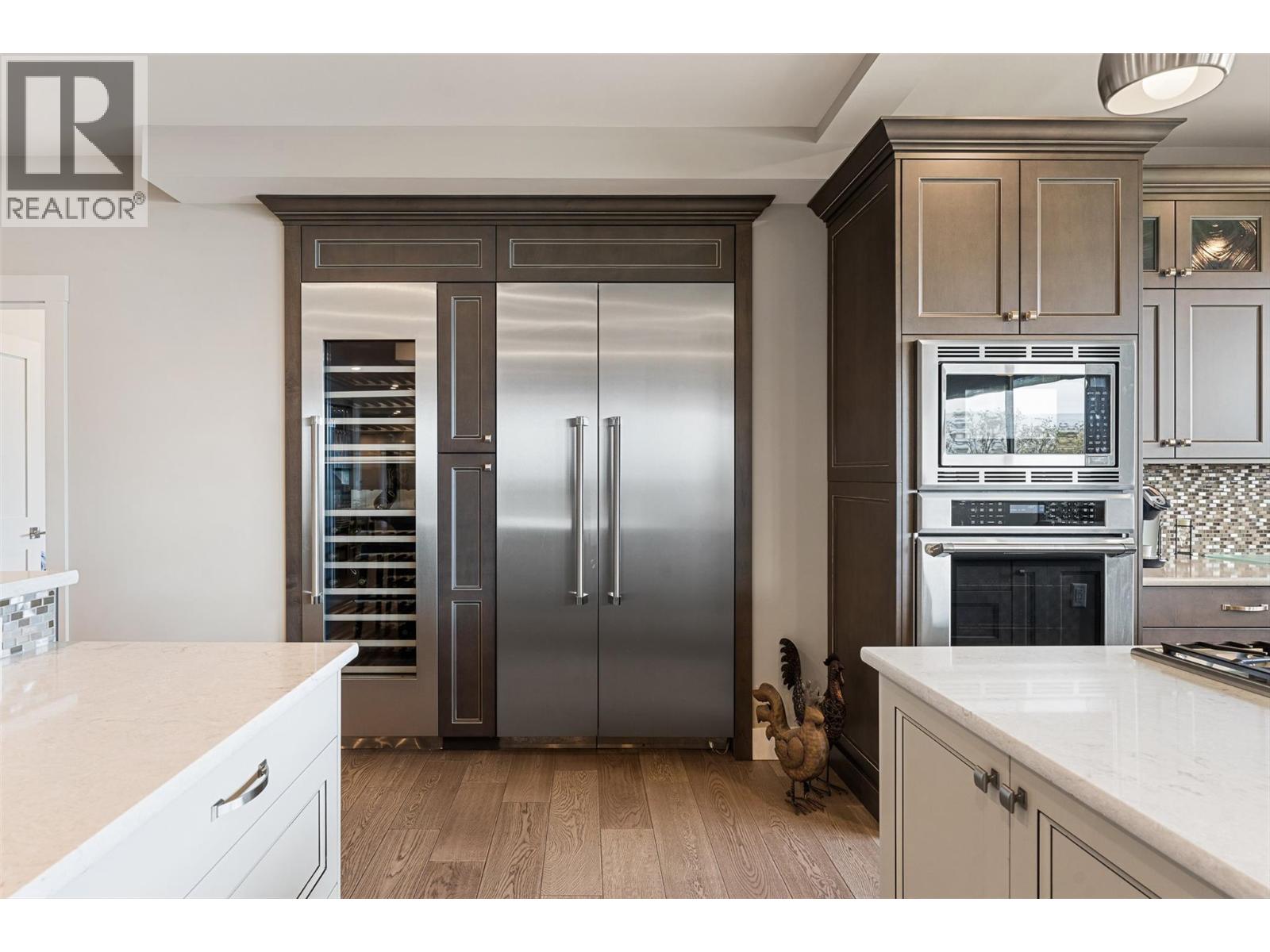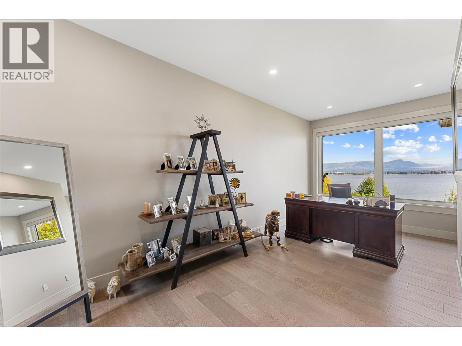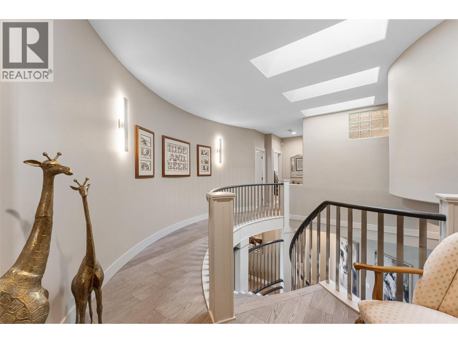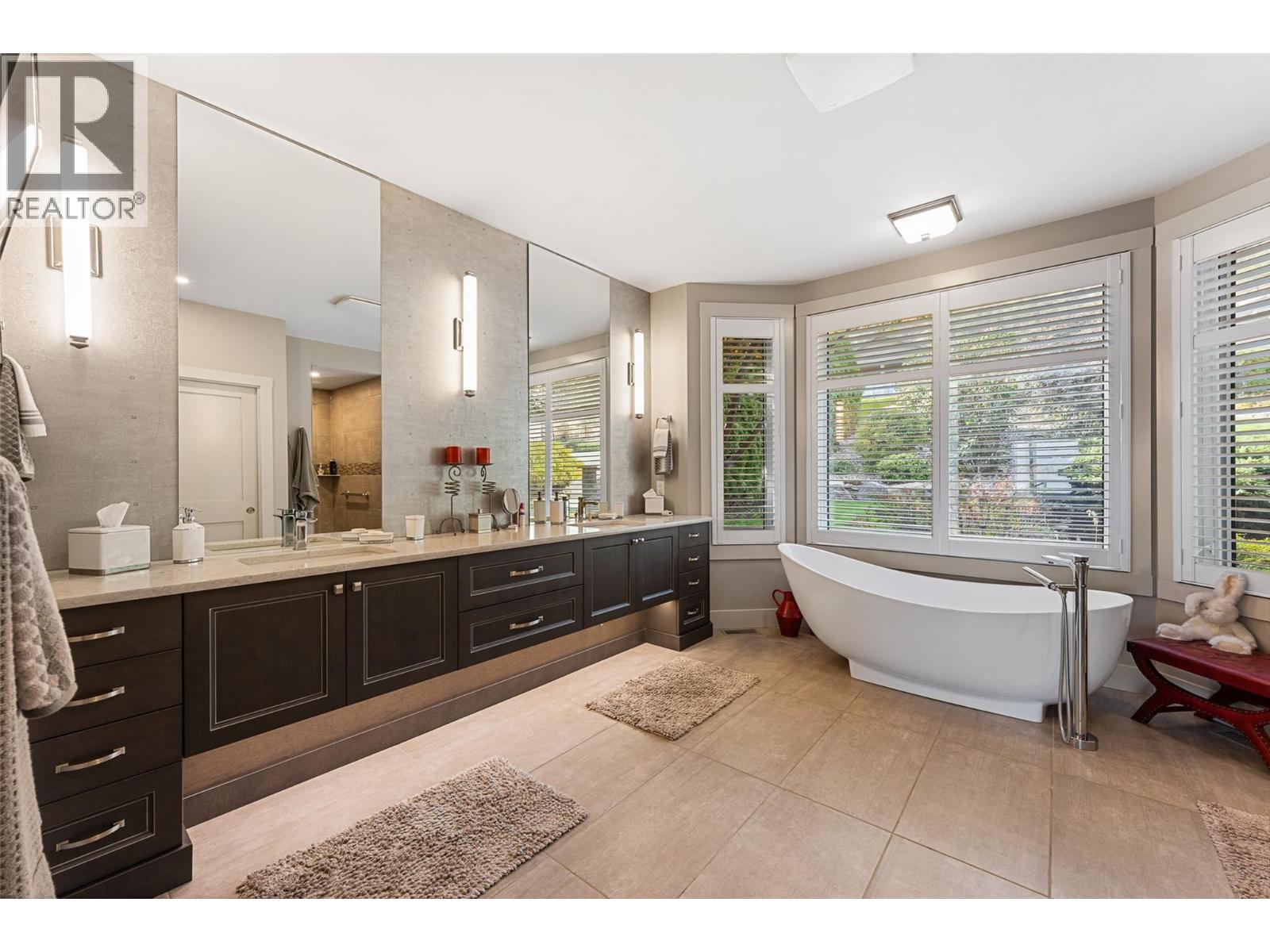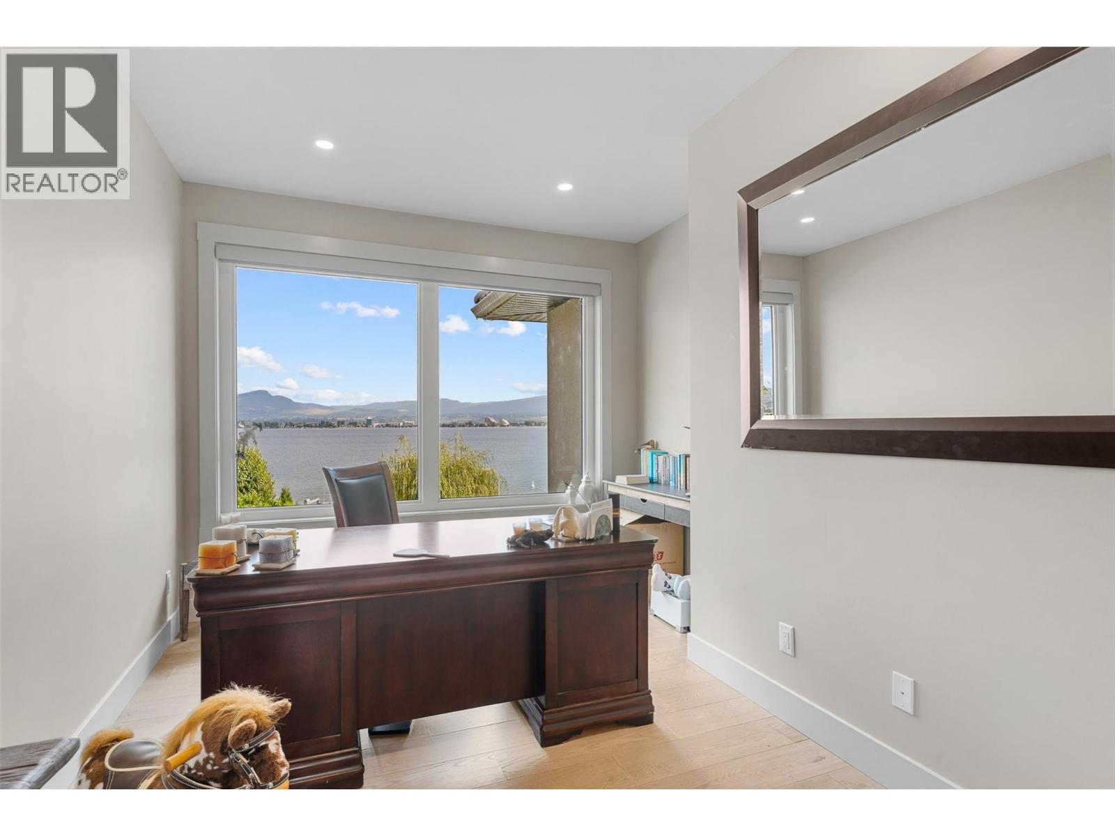 Nestled on a quiet cul de sac in a private waterfront setting, this beautiful customized residence offers a rare opportunity to experience tranquil living on the shores of Okanagan Lake. Surrounded by mature gently sloping grounds, the home blends refined design with a relaxed, resort-inspired lifestyle. Panoramic city and lake view and just minutes into town! A grand foyer with soaring ceilings, skylights and a graceful curved staircase welcomes you inside. The main living area unfolds beneath expansive windows and wall-to-wall Nano doors that open to the covered lakeside deck, creating seamless indoor-outdoor living just steps from the water. At the heart of the home, the chef’s kitchen featuring two islands, including a large L-shaped island with seating for seven, stone countertops, premium Thermador appliances and an oversized walk-in pantry. The primary retreat offers deck access, a custom walk-in closet and a spa-inspired ensuite with heated floors, a freestanding soaker tub and a fully tiled walk-in shower. Additional bedrooms on the upper level provide privacy for family and guests, including a second primary-style suite. The lower level is designed for relaxation with a spacious rec room, temp-controlled wine room, guest suite and walk-out access to the covered patio and backyard. All levels with elevator access! Outside, tiered landscaping leads to a sandy beach and a dock with boat and Seadoo lifts. Heated triple garage and generous driveway parking. (id:21321)