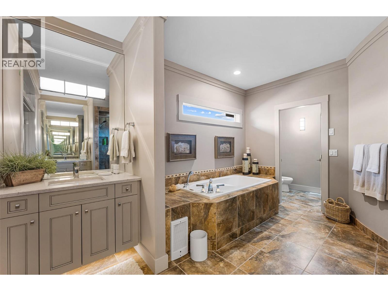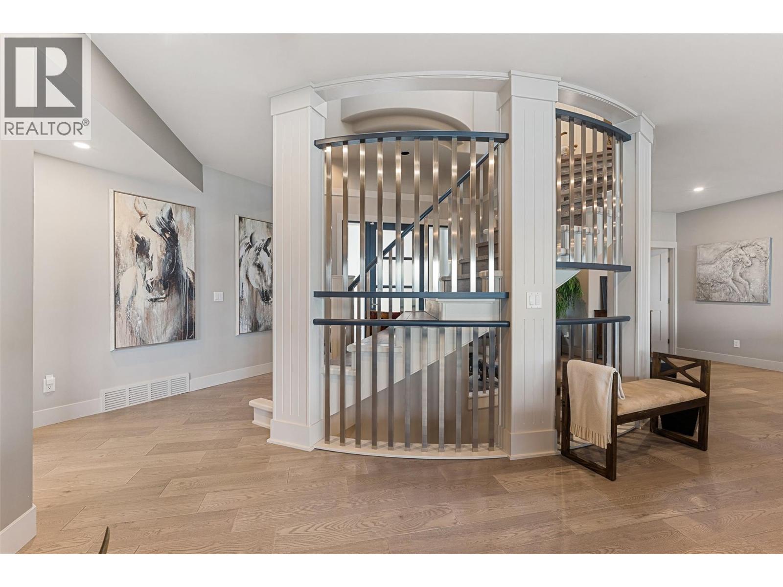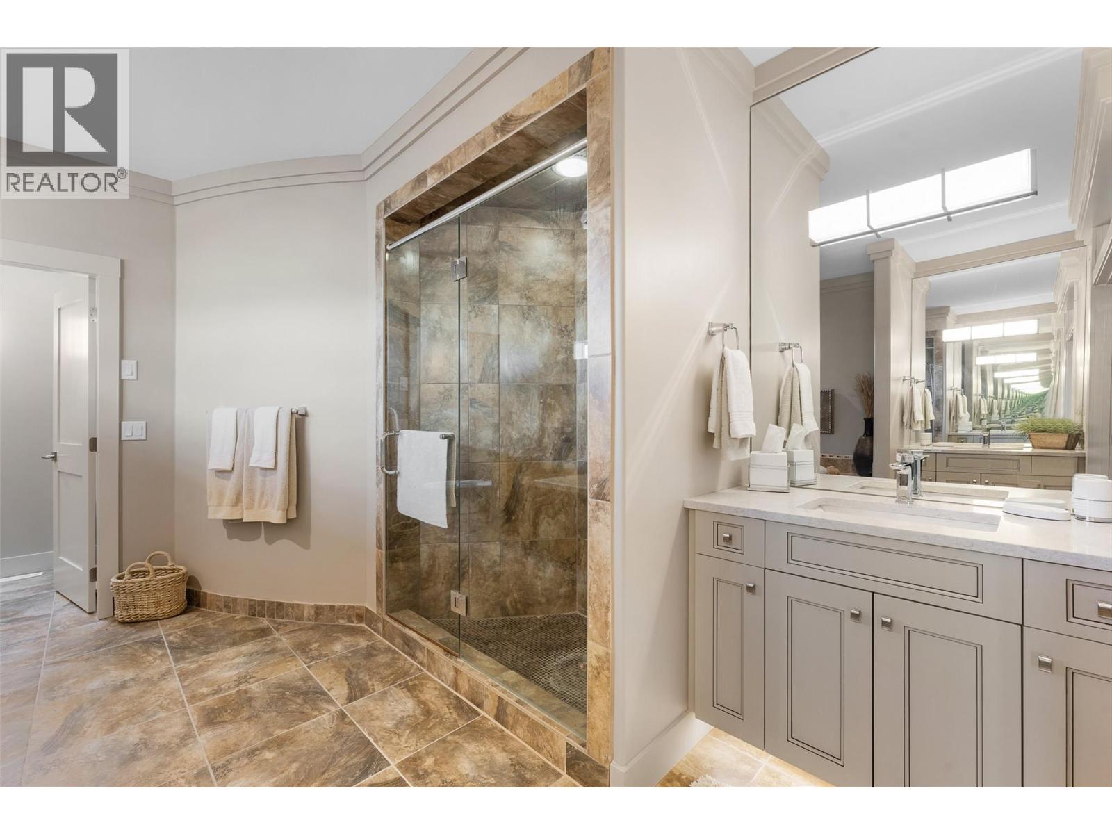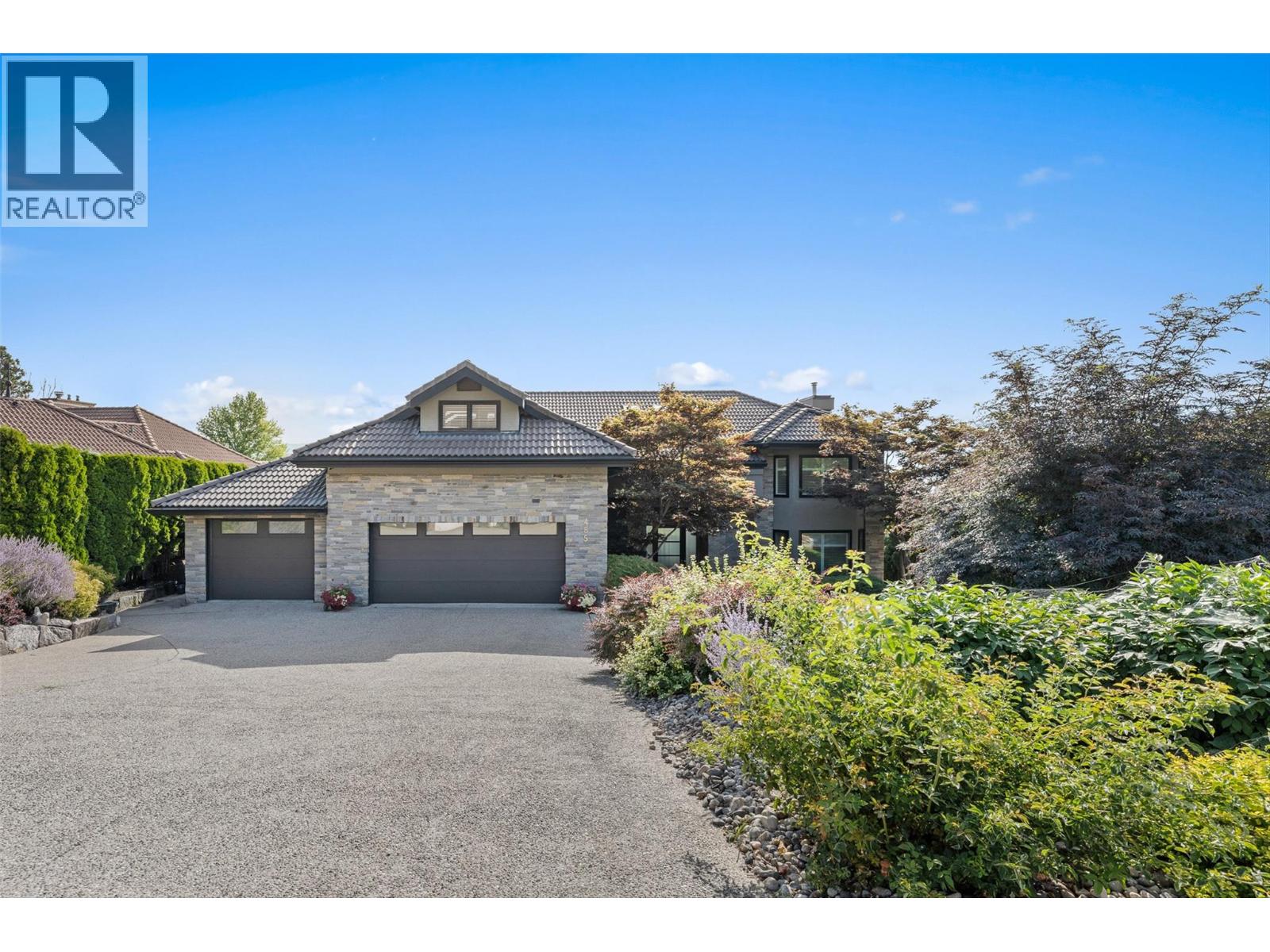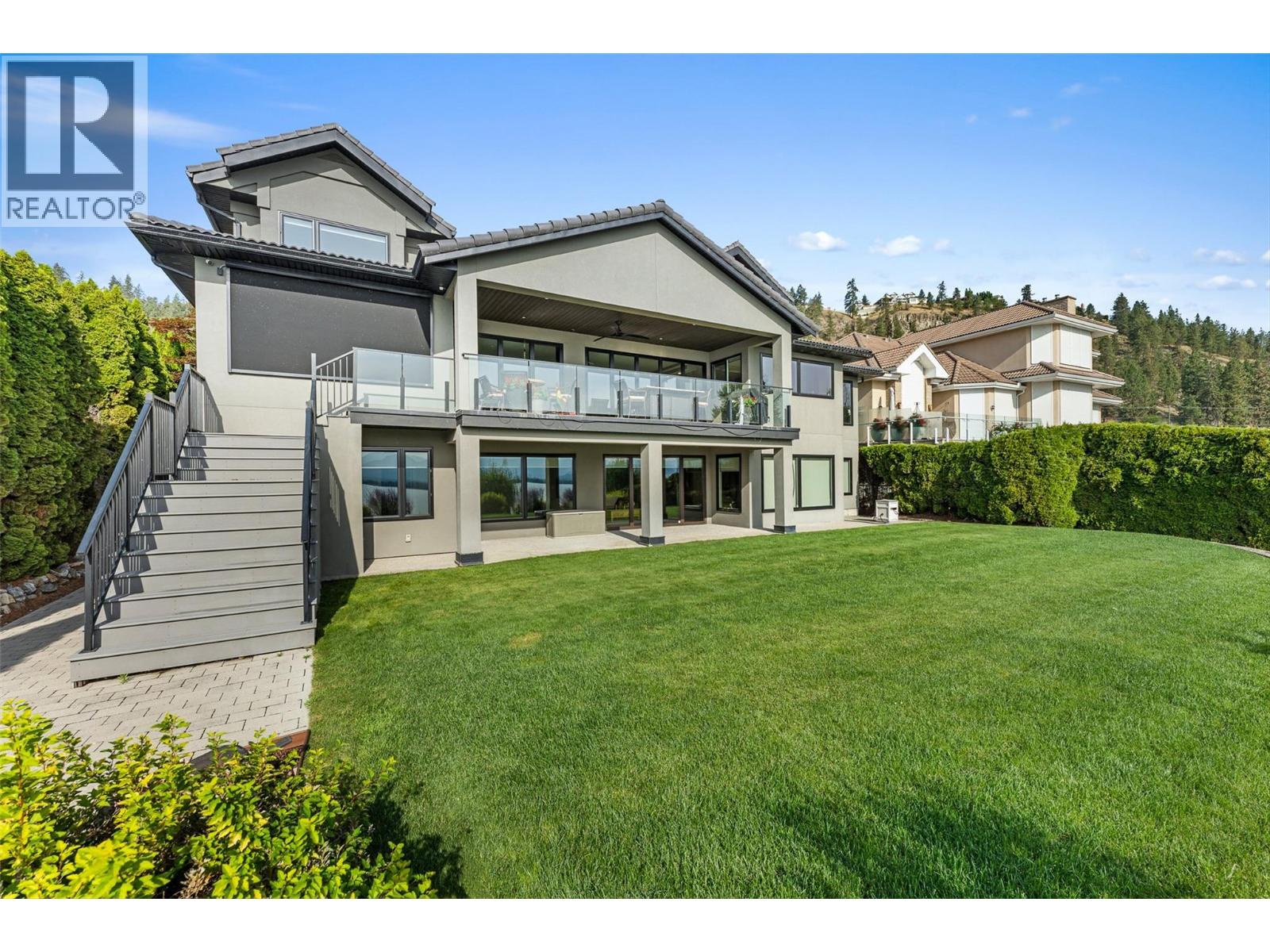 Nestled on a quiet cul de sac in a private waterfront setting, this beautiful customized residence offers a rare opportunity to experience tranquil living on the shores of Okanagan Lake. Surrounded by mature gently sloping grounds, the home blends refined design with a relaxed, resort-inspired lifestyle. Panoramic city and lake view and just minutes into town! A grand foyer with soaring ceilings, skylights and a graceful curved staircase welcomes you inside. The main living area unfolds beneath expansive windows and wall-to-wall Nano doors that open to the covered lakeside deck, creating seamless indoor-outdoor living just steps from the water. At the heart of the home, the chef’s kitchen featuring two islands, including a large L-shaped island with seating for seven, stone countertops, premium Thermador appliances and an oversized walk-in pantry. The primary retreat offers deck access, a custom walk-in closet and a spa-inspired ensuite with heated floors, a freestanding soaker tub and a fully tiled walk-in shower. Additional bedrooms on the upper level provide privacy for family and guests, including a second primary-style suite. The lower level is designed for relaxation with a spacious rec room, temp-controlled wine room, guest suite and walk-out access to the covered patio and backyard. All levels with elevator access! Outside, tiered landscaping leads to a sandy beach and a dock with boat and Seadoo lifts. Heated triple garage and generous driveway parking. (id:21321)