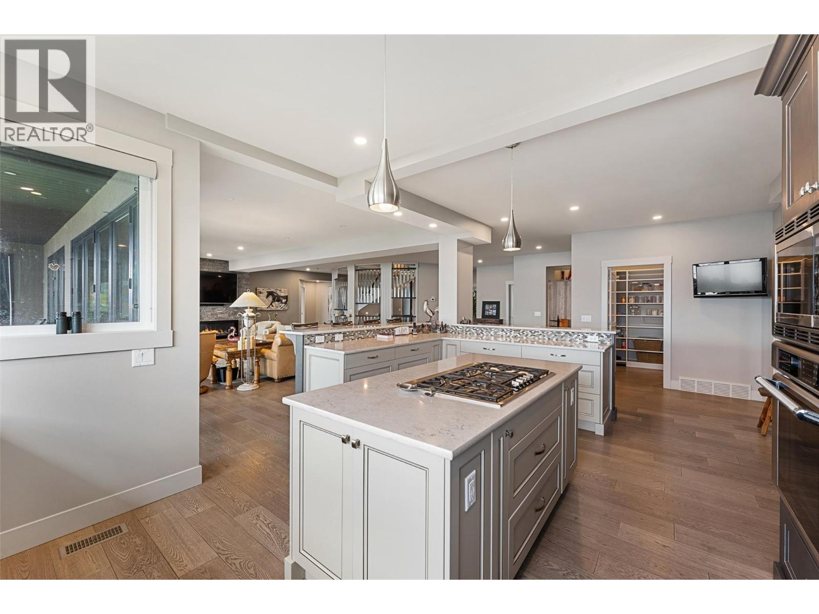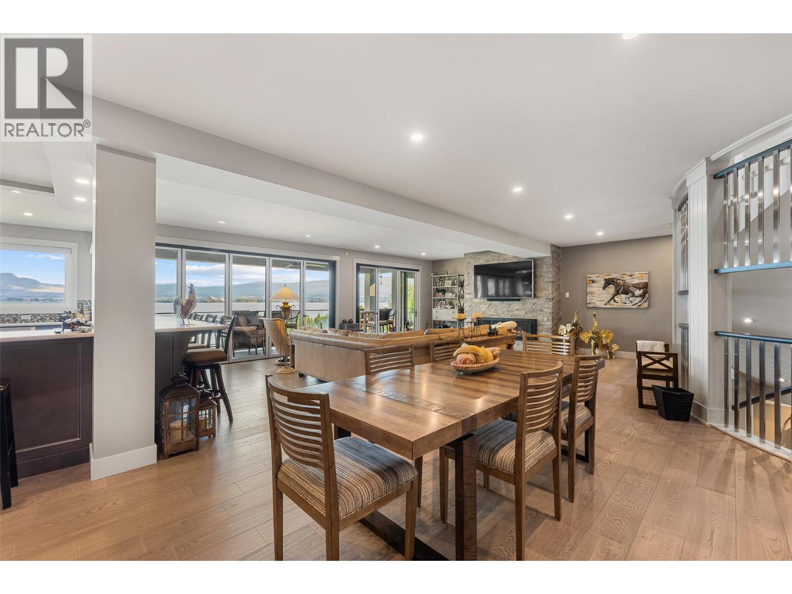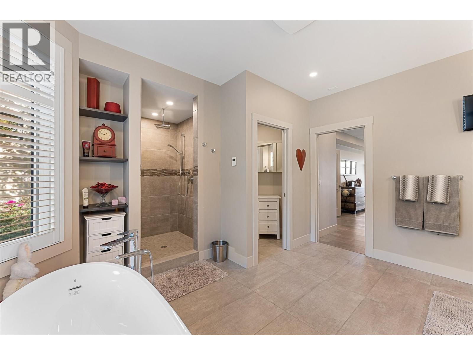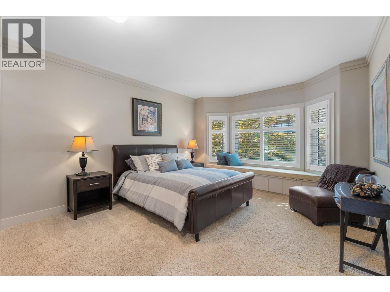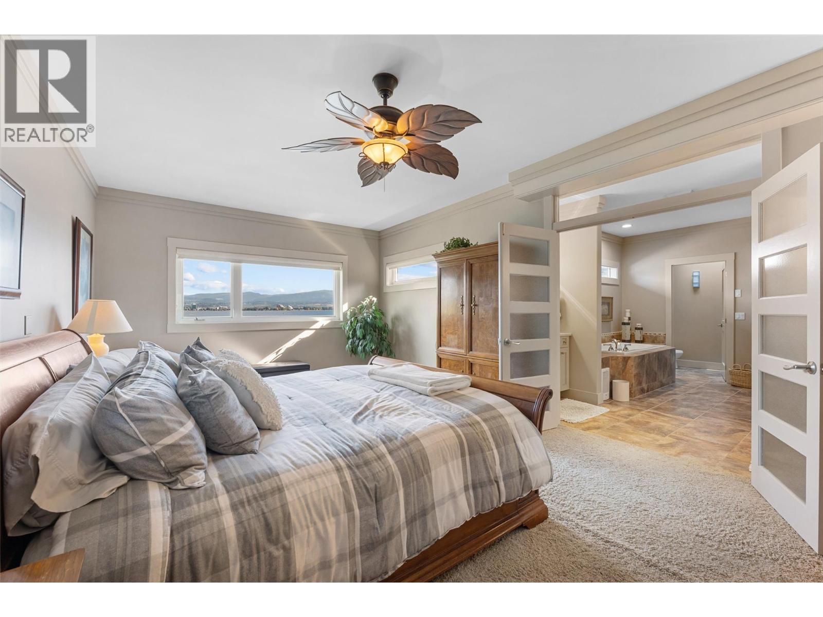 Nestled on a quiet cul de sac in a private waterfront setting, this beautiful customized residence offers a rare opportunity to experience tranquil living on the shores of Okanagan Lake. Surrounded by mature gently sloping grounds, the home blends refined design with a relaxed, resort-inspired lifestyle. Panoramic city and lake view and just minutes into town! A grand foyer with soaring ceilings, skylights and a graceful curved staircase welcomes you inside. The main living area unfolds beneath expansive windows and wall-to-wall Nano doors that open to the covered lakeside deck, creating seamless indoor-outdoor living just steps from the water. At the heart of the home, the chef’s kitchen featuring two islands, including a large L-shaped island with seating for seven, stone countertops, premium Thermador appliances and an oversized walk-in pantry. The primary retreat offers deck access, a custom walk-in closet and a spa-inspired ensuite with heated floors, a freestanding soaker tub and a fully tiled walk-in shower. Additional bedrooms on the upper level provide privacy for family and guests, including a second primary-style suite. The lower level is designed for relaxation with a spacious rec room, temp-controlled wine room, guest suite and walk-out access to the covered patio and backyard. All levels with elevator access! Outside, tiered landscaping leads to a sandy beach and a dock with boat and Seadoo lifts. Heated triple garage and generous driveway parking. (id:21321)