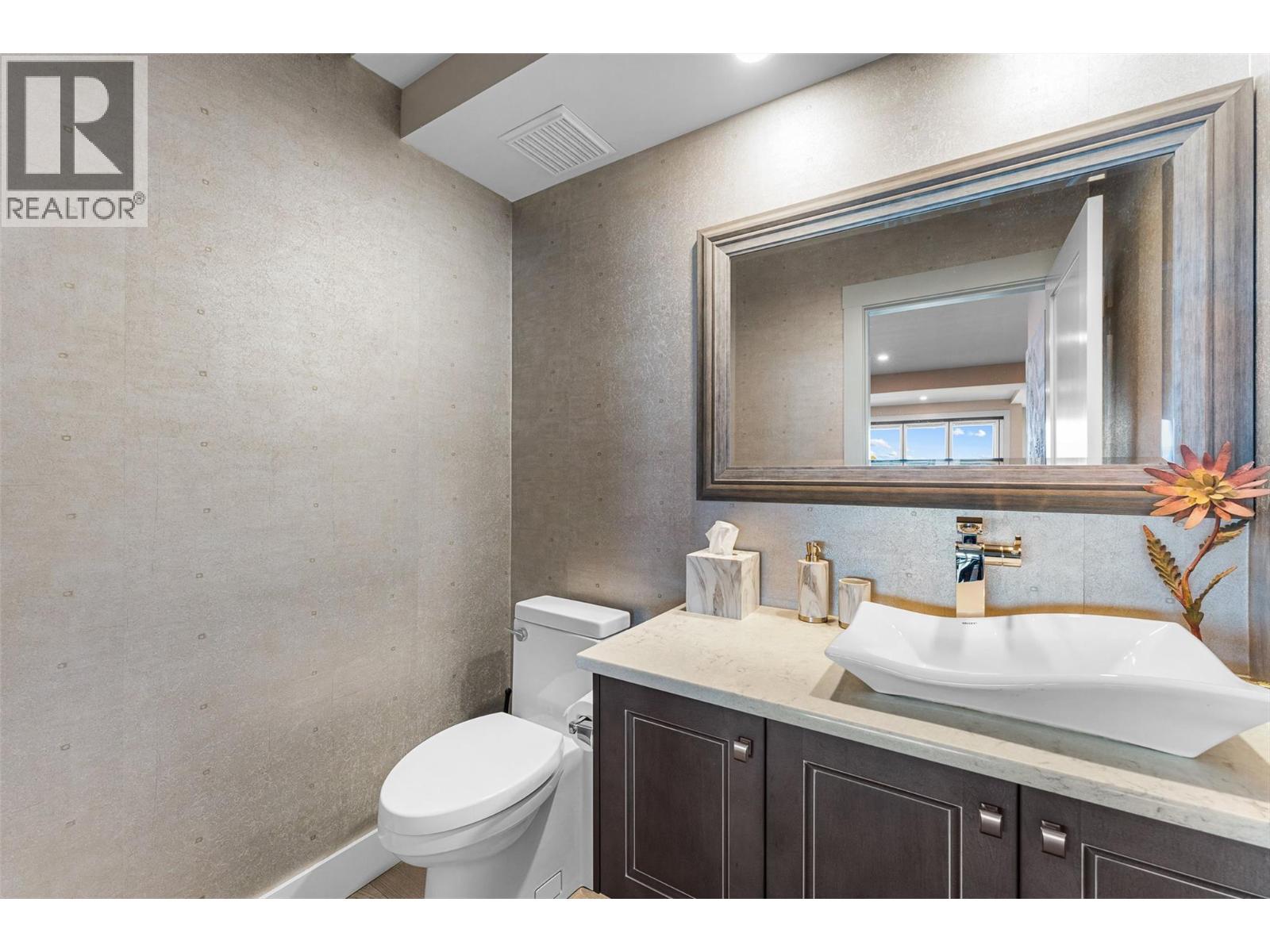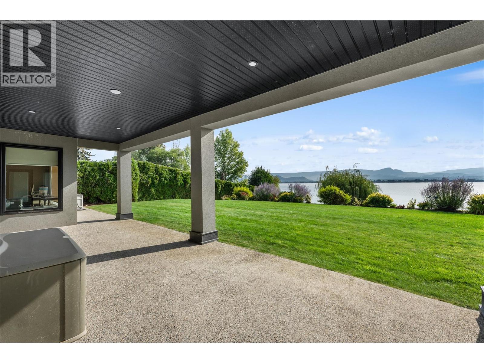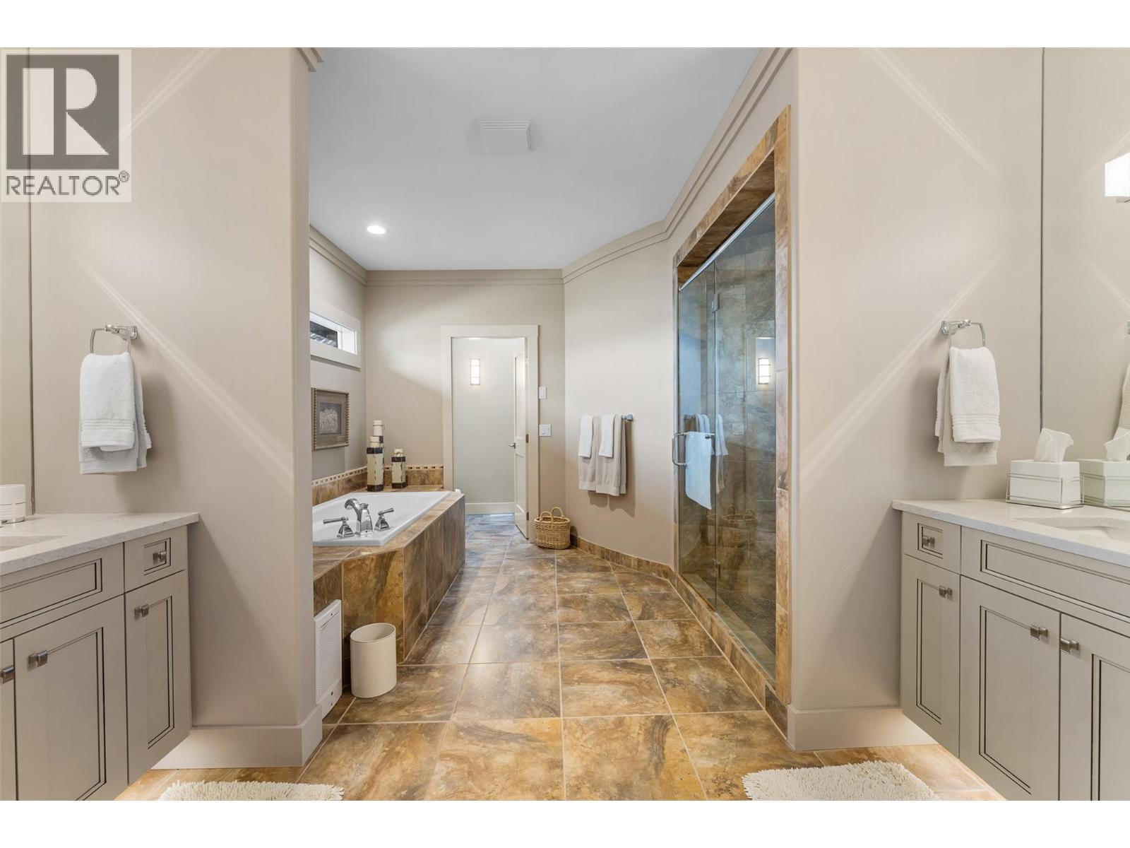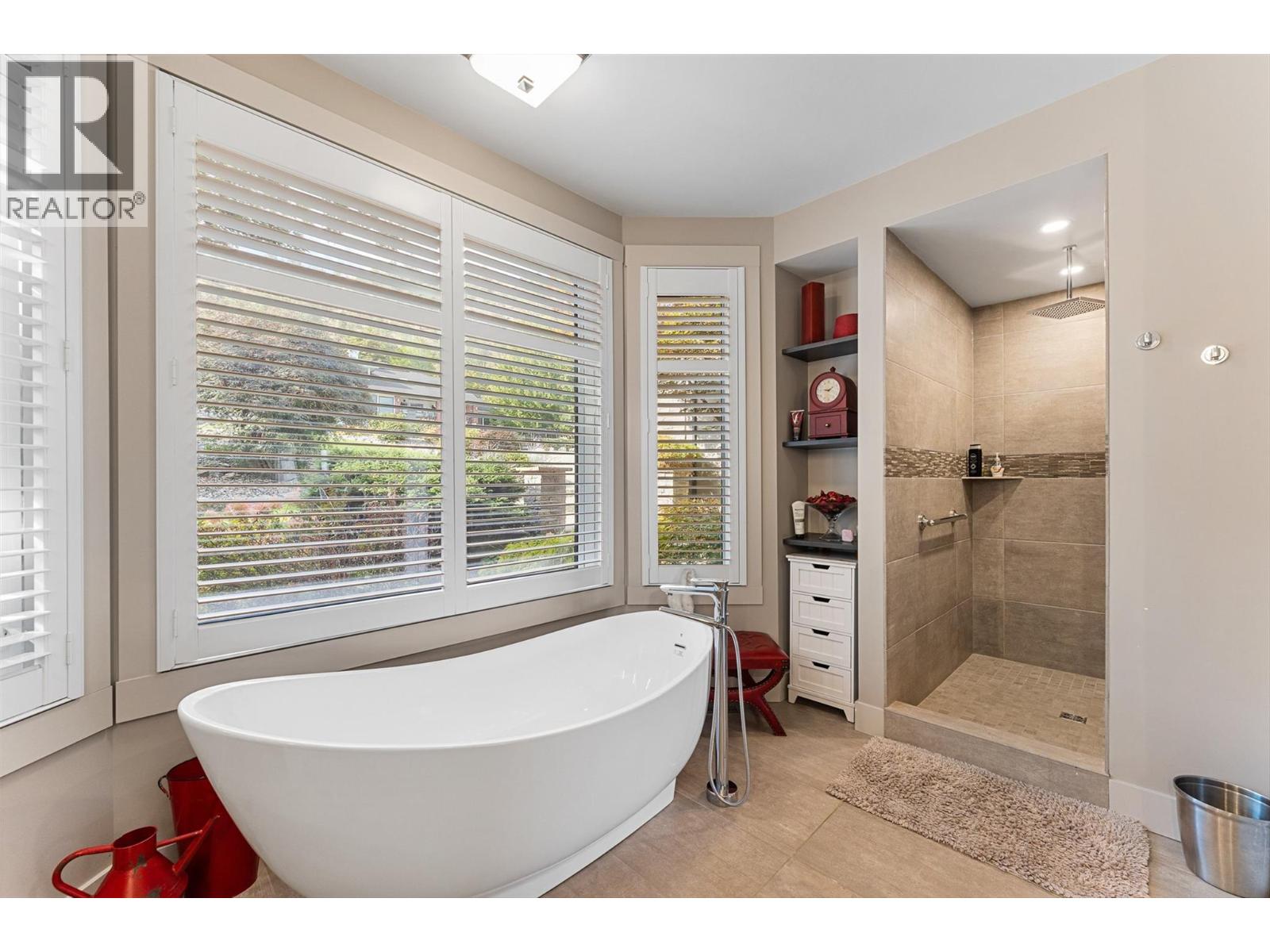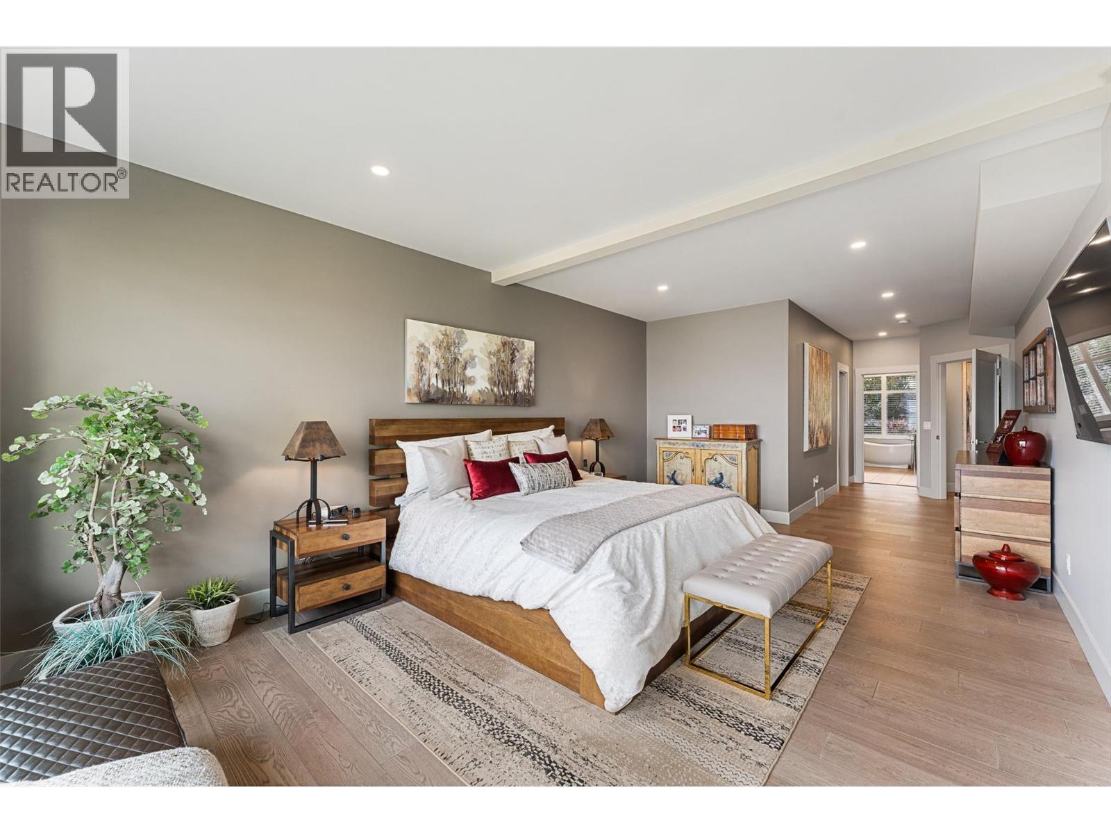 Nestled on a quiet cul de sac in a private waterfront setting, this beautiful customized residence offers a rare opportunity to experience tranquil living on the shores of Okanagan Lake. Surrounded by mature gently sloping grounds, the home blends refined design with a relaxed, resort-inspired lifestyle. Panoramic city and lake view and just minutes into town! A grand foyer with soaring ceilings, skylights and a graceful curved staircase welcomes you inside. The main living area unfolds beneath expansive windows and wall-to-wall Nano doors that open to the covered lakeside deck, creating seamless indoor-outdoor living just steps from the water. At the heart of the home, the chef’s kitchen featuring two islands, including a large L-shaped island with seating for seven, stone countertops, premium Thermador appliances and an oversized walk-in pantry. The primary retreat offers deck access, a custom walk-in closet and a spa-inspired ensuite with heated floors, a freestanding soaker tub and a fully tiled walk-in shower. Additional bedrooms on the upper level provide privacy for family and guests, including a second primary-style suite. The lower level is designed for relaxation with a spacious rec room, temp-controlled wine room, guest suite and walk-out access to the covered patio and backyard. All levels with elevator access! Outside, tiered landscaping leads to a sandy beach and a dock with boat and Seadoo lifts. Heated triple garage and generous driveway parking. (id:21321)