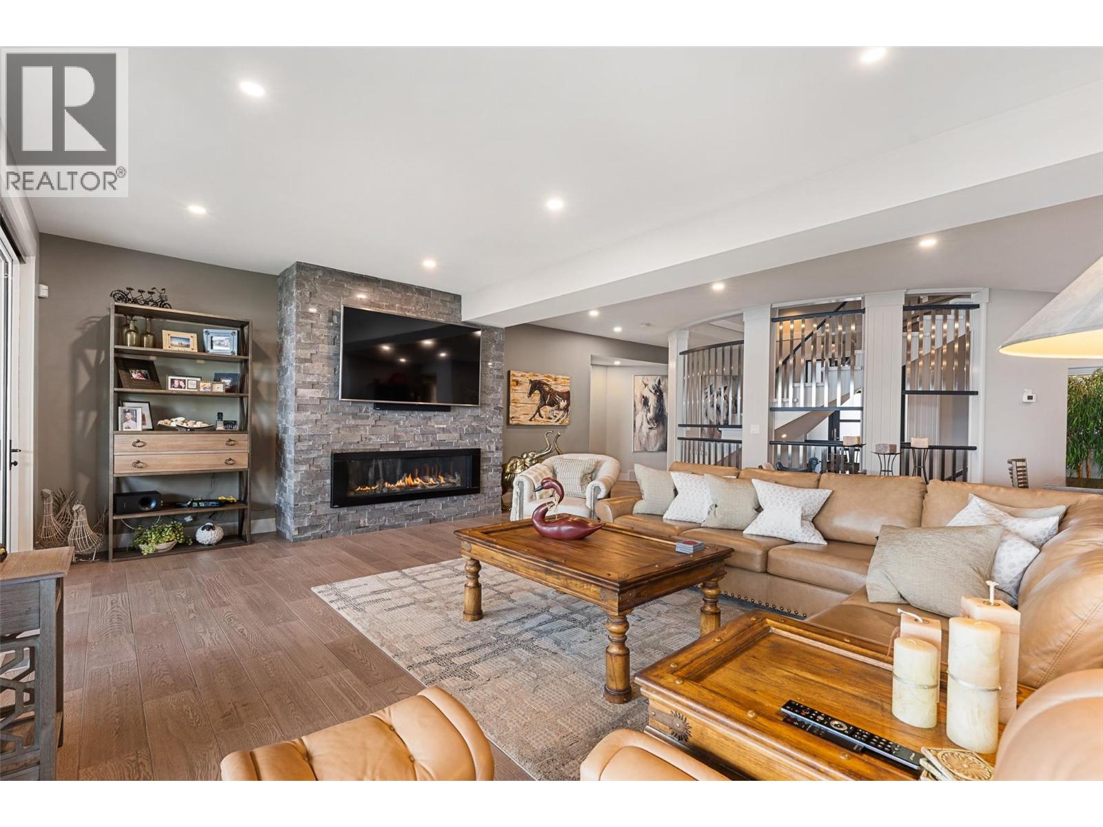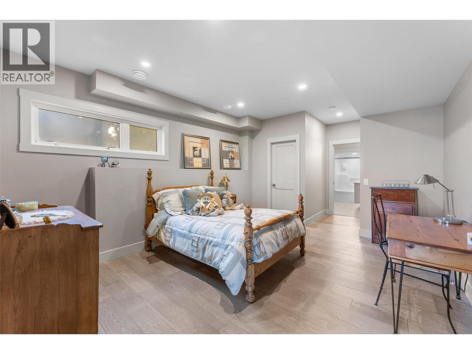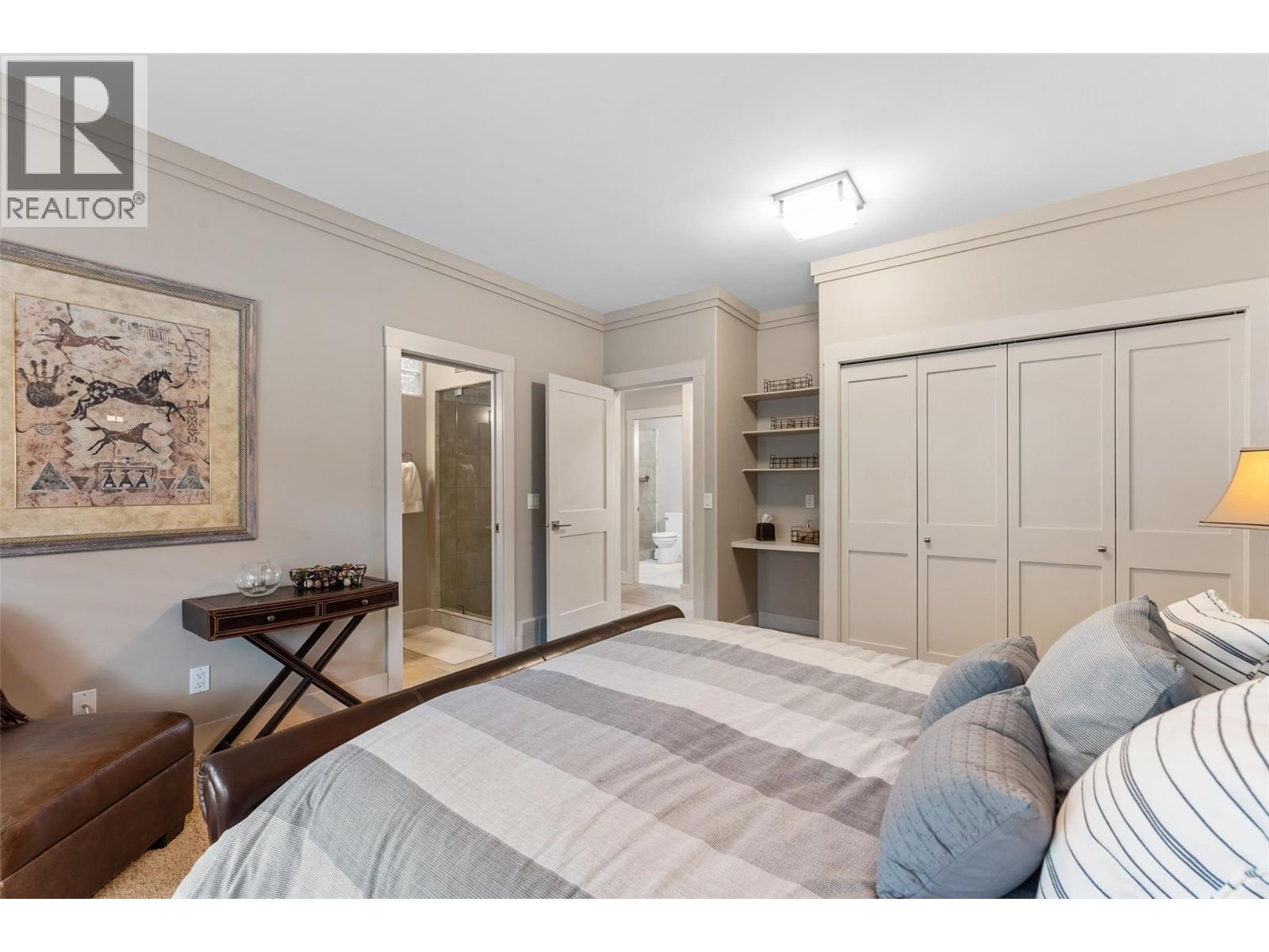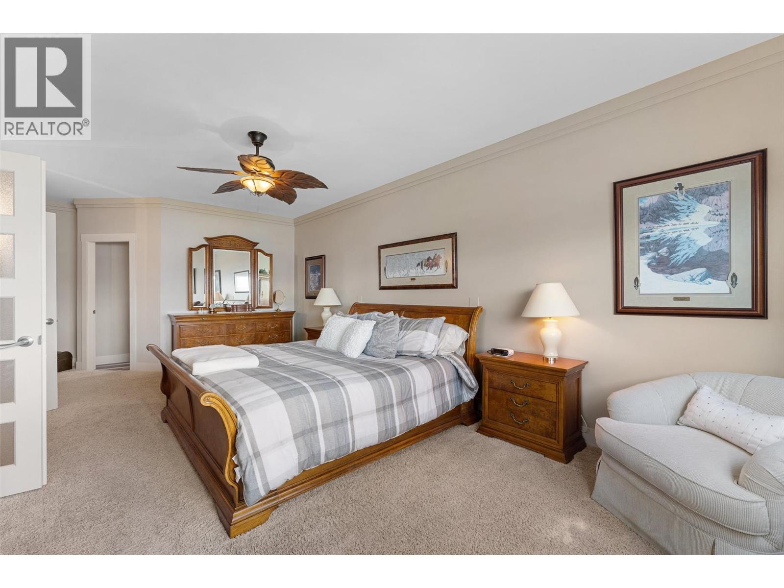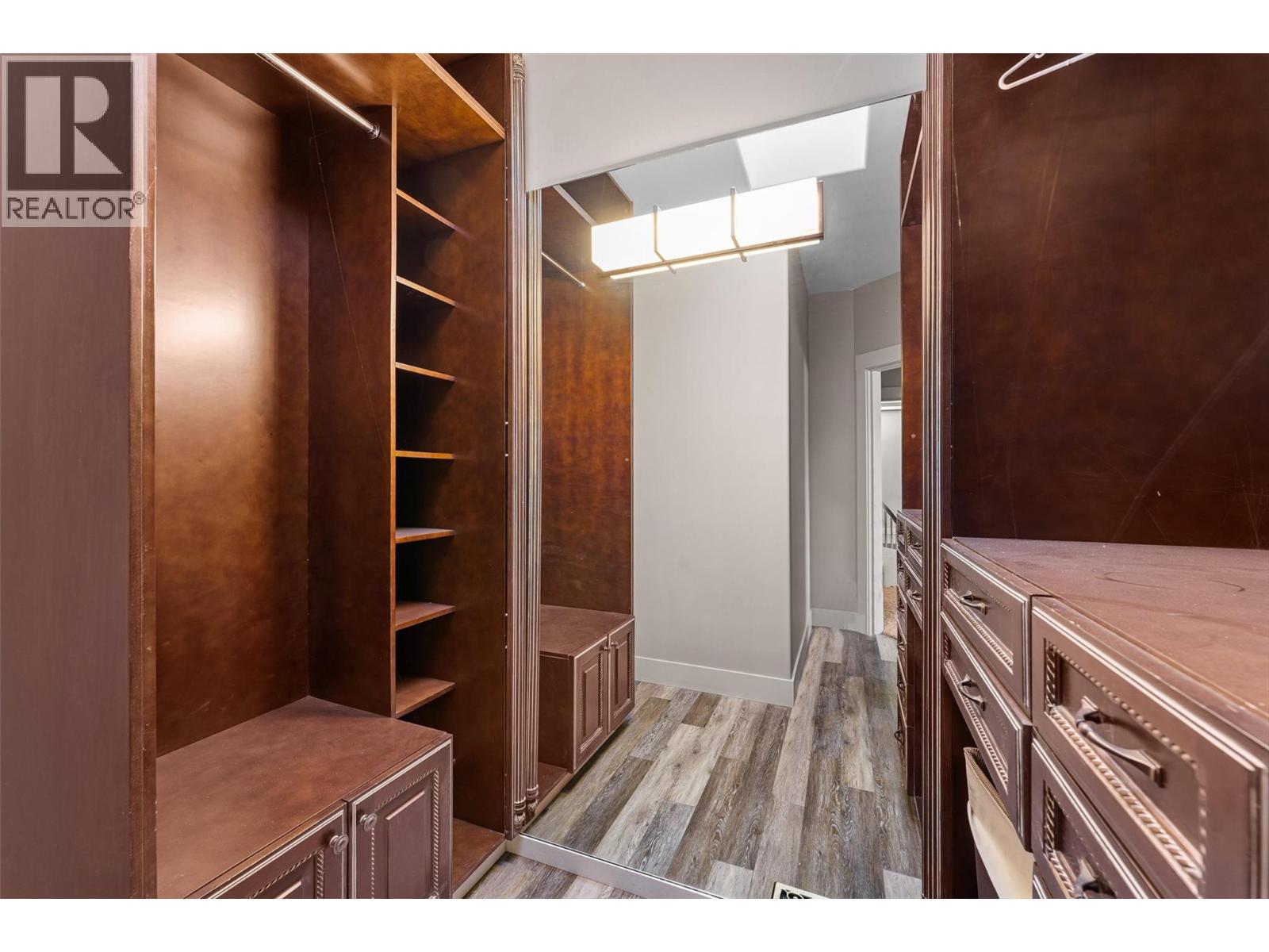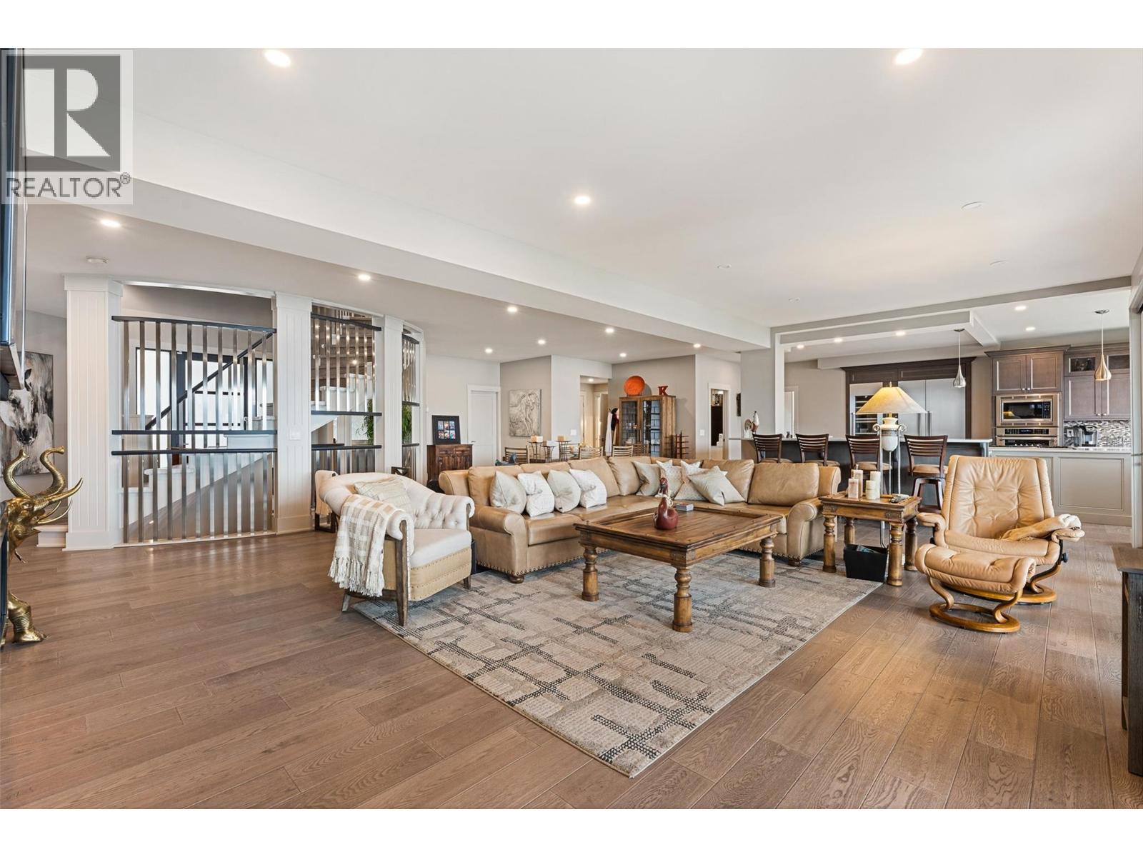 Nestled on a quiet cul de sac in a private waterfront setting, this beautiful customized residence offers a rare opportunity to experience tranquil living on the shores of Okanagan Lake. Surrounded by mature gently sloping grounds, the home blends refined design with a relaxed, resort-inspired lifestyle. Panoramic city and lake view and just minutes into town! A grand foyer with soaring ceilings, skylights and a graceful curved staircase welcomes you inside. The main living area unfolds beneath expansive windows and wall-to-wall Nano doors that open to the covered lakeside deck, creating seamless indoor-outdoor living just steps from the water. At the heart of the home, the chef’s kitchen featuring two islands, including a large L-shaped island with seating for seven, stone countertops, premium Thermador appliances and an oversized walk-in pantry. The primary retreat offers deck access, a custom walk-in closet and a spa-inspired ensuite with heated floors, a freestanding soaker tub and a fully tiled walk-in shower. Additional bedrooms on the upper level provide privacy for family and guests, including a second primary-style suite. The lower level is designed for relaxation with a spacious rec room, temp-controlled wine room, guest suite and walk-out access to the covered patio and backyard. All levels with elevator access! Outside, tiered landscaping leads to a sandy beach and a dock with boat and Seadoo lifts. Heated triple garage and generous driveway parking. (id:21321)