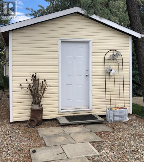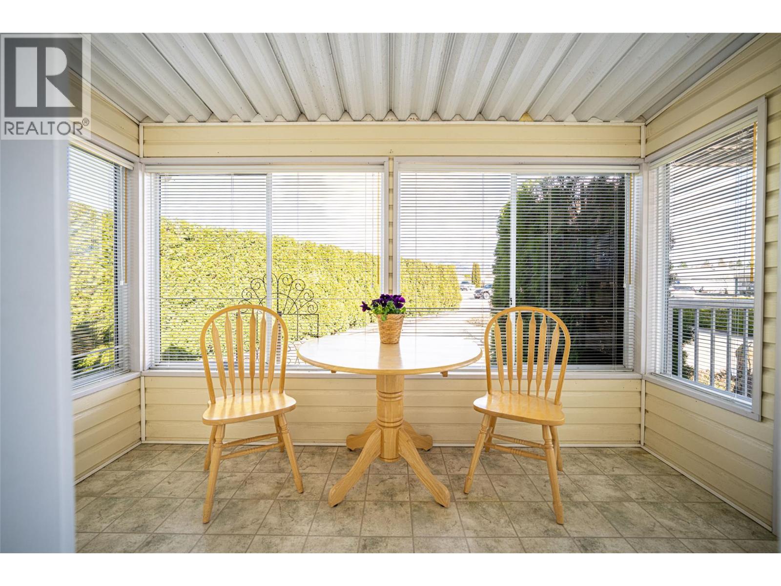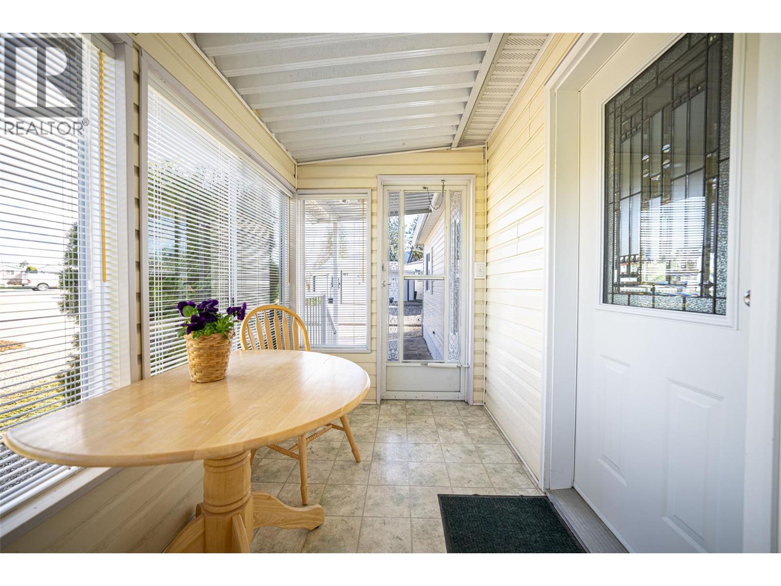 This is an exceptionally well-maintained 2-bedroom plus den, 2-bathroom manufactured home. The property has been meticulously cared for and remains in excellent condition. The interior features a spacious open-concept kitchen with ample cupboards, storage and four pull-out cupboard shelves. Both bathrooms include modern fixtures and granite countertops. The home is drywalled with new vinyl plank flooring throughout and large windows providing a bright atmosphere and a relaxing enclosed porch. Significant upgrades include a 35-year roof (installed in 2014), a water softener and reverse osmosis system, a newer hot water tank, and a new dishwasher. The exterior offers a large private yard and a sundeck with views of Okanagan Lake and Spall Golf Course. The grounds include a fire pit, multiple garden areas with perennials, and an automated watering system. Additionally, the property provides a 12' x 16' workshop, a storage shed, and ample parking for both vehicles and an RV. (id:21321)