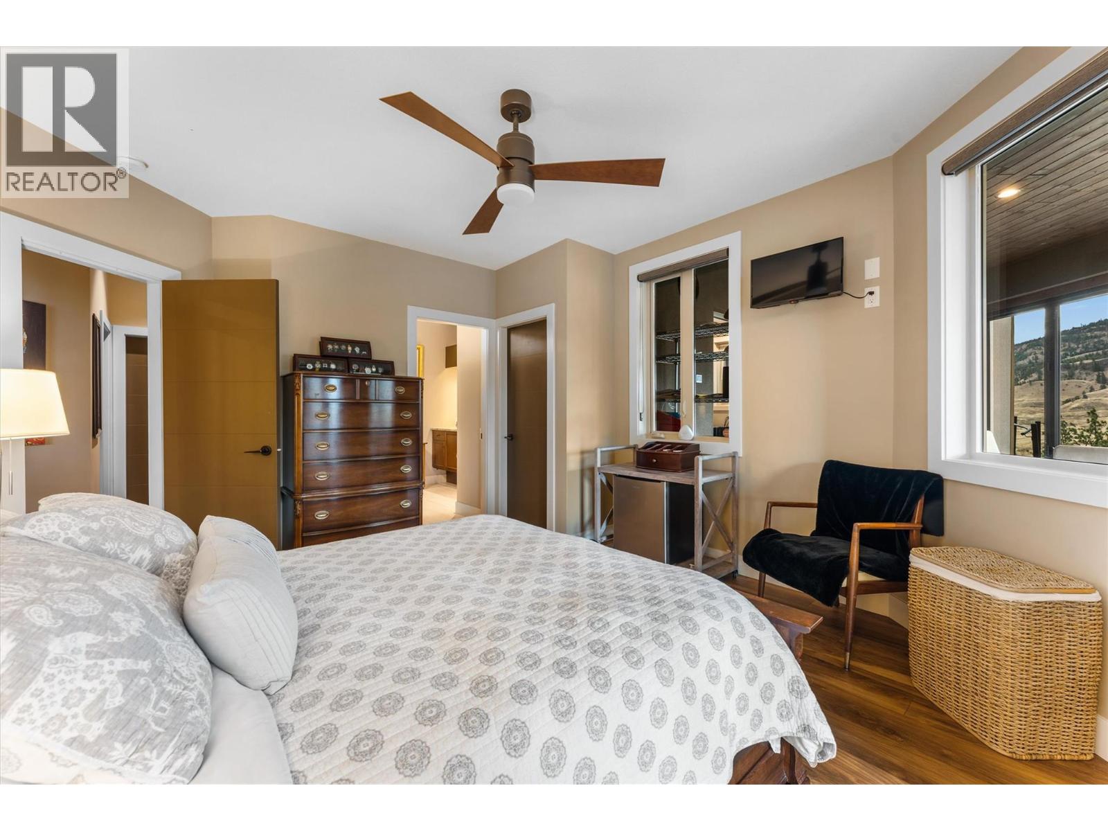 Set in the picturesque golf course community of Black Mountain, this custom residence blends craftsmanship with functionality. The main level features a seamless open-concept layout framed by panoramic views of the valley & the 18th hole. The kitchen offers shaker cabinetry, granite countertops & a large island. A stone-clad fireplace anchors the living area, while the dining space opens to an expansive covered deck complete with an outdoor kitchen, built-in pellet smoker, cooktop, gas heater and granite bar—ideal for year-round entertaining. The primary suite captures tranquil views & includes deck access, a walk-in closet with custom built-ins & a spa-inspired ensuite with heated floors & a freestanding tub. The lower level continues to impress with a recreation room featuring a full wet bar & two guest suites with ensuite access and a flexible third bedroom/office. A stunning 627 sq ft four-season bonus room completes the lower level with retractable glass doors connecting to the outdoors serving as a seamless space for hosting, entertaining & relaxing. Just steps away, a private hot tub beneath a custom wood gazebo with windows creates a relaxing retreat. Additional highlights include an office, a heated oversized garage, low-maintenance landscaping & RV parking with power & water hookups. Set on a premier lot offering exceptional privacy, this distinctive home stands out in Black Mountain, combining spectacular views, thoughtful design & effortless comfort. (id:21321)