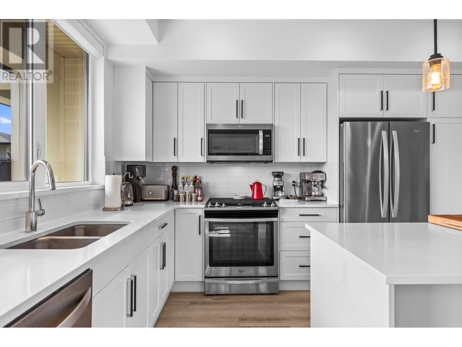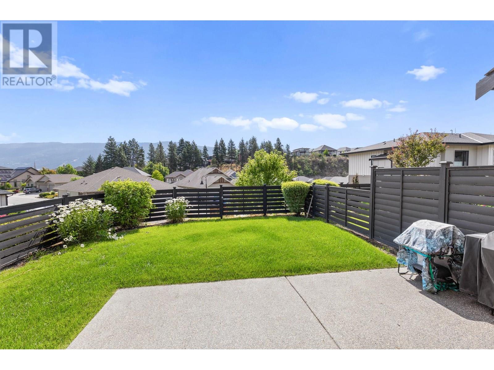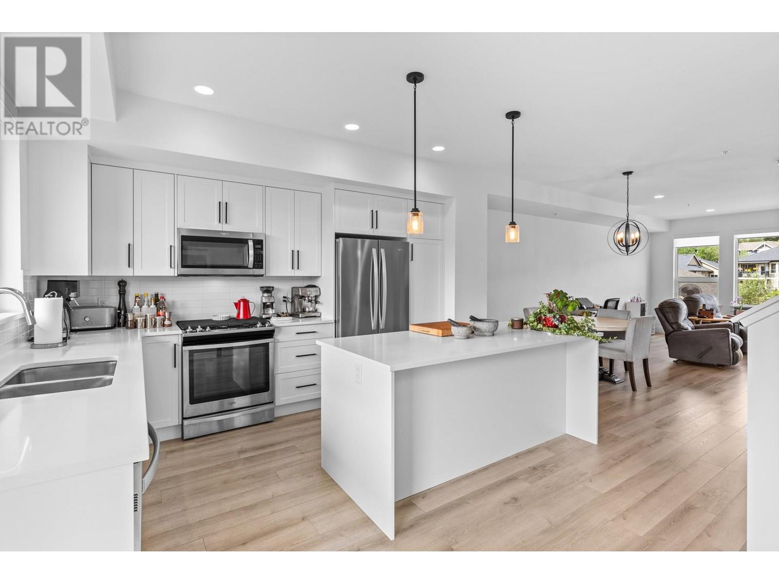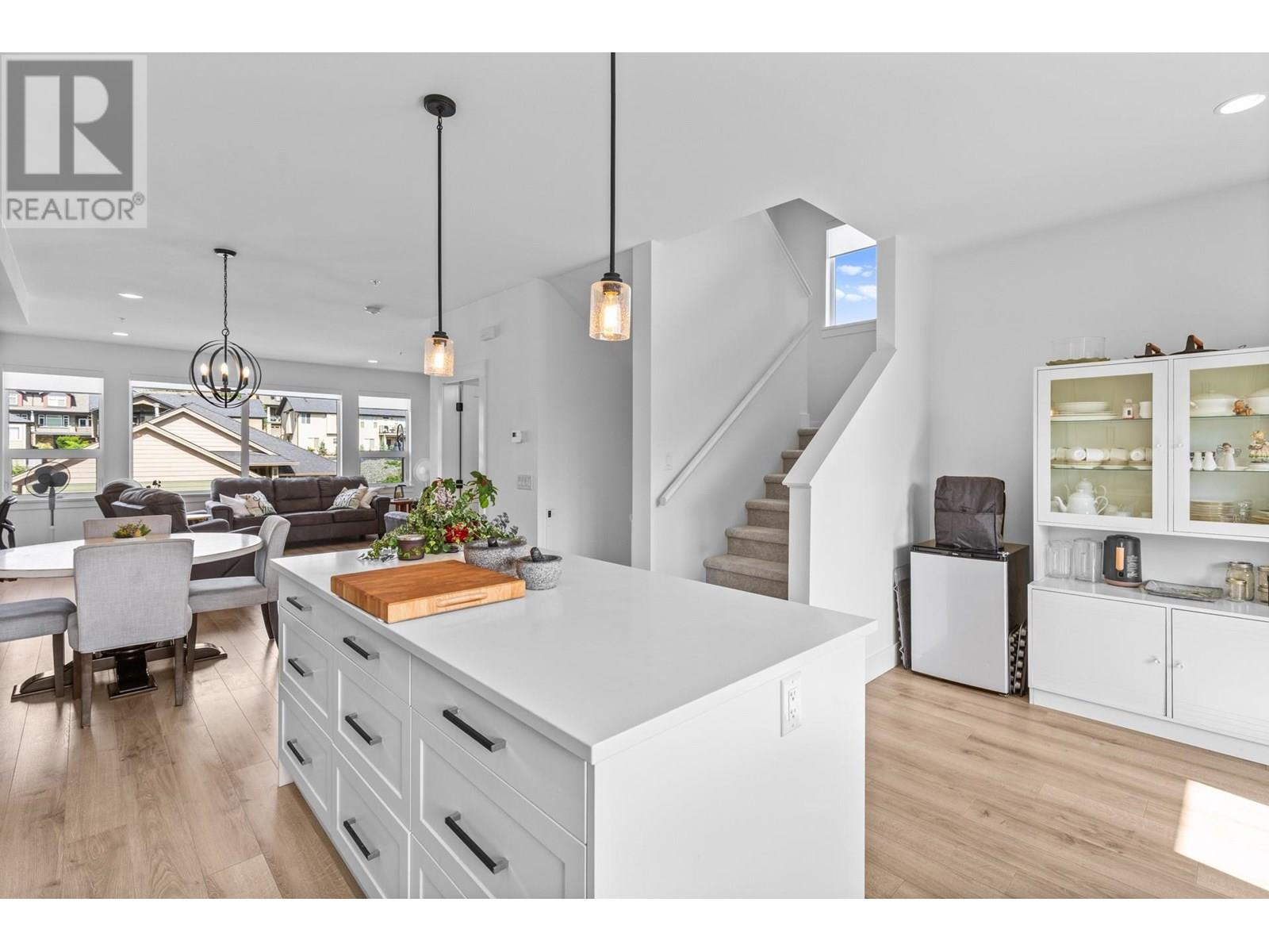 Bright & Modern End Unit in Rockridge at The Lakes. A vibrant and family/pet friendly townhome community in the heart of Lake Country. This stylish 3-bedroom + den/flex, 3-bathroom end unit offers the perfect blend of space, functionality, and comfort. Flooded with natural light, the main floor showcases a modern open-concept design with large windows throughout. The kitchen is a true highlight, featuring quartz countertops, a gas range, sit-up island, and cozy eating nook. The layout flows seamlessly into a spacious dining area and bright living room—perfect for everyday living and entertaining. Step out from the kitchen to your private, elevated backyard oasis with panoramic Eastern Mountain views. With no units directly behind, you’ll enjoy added privacy along with a gas hookup, power, and water connection. Upstairs you’ll find three well-appointed bedrooms, including a generous primary suite with a 4-piece ensuite. The laundry is conveniently located on this level as well. The lower level adds valuable flexibility with a den/flex room – perfect for a home office, gym, or guest space. Additional features include a double car garage, a full-length 26 ft driveway that easily accommodates most vehicles, and close proximity to visitor parking—making hosting friends and family a breeze. This home truly has it all—modern comfort, unbeatable functionality, and a fantastic location. (id:21321)