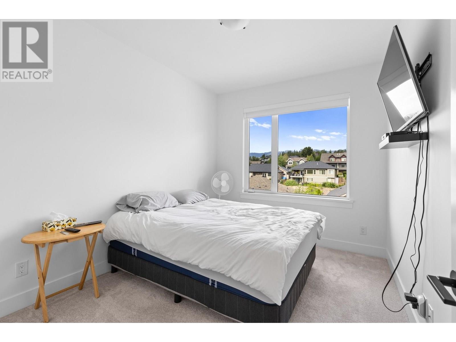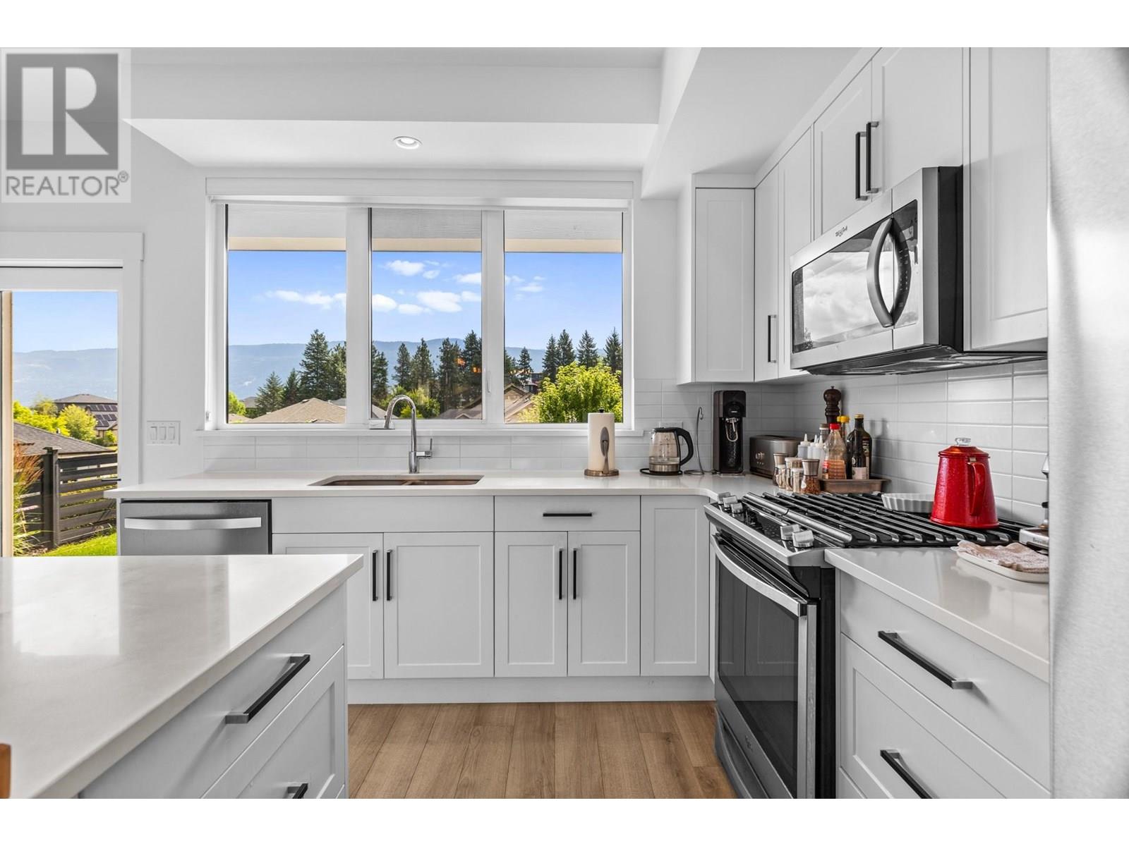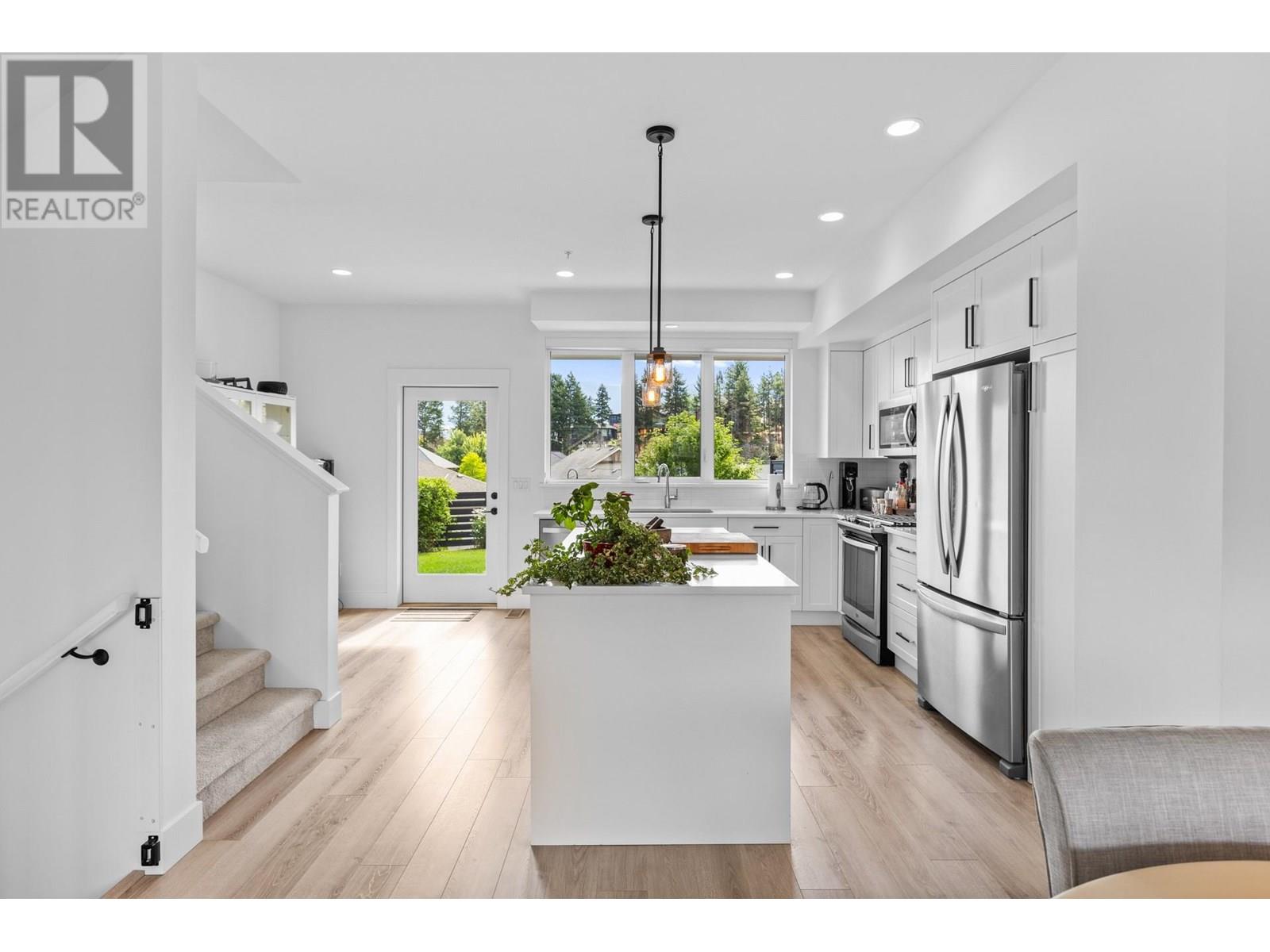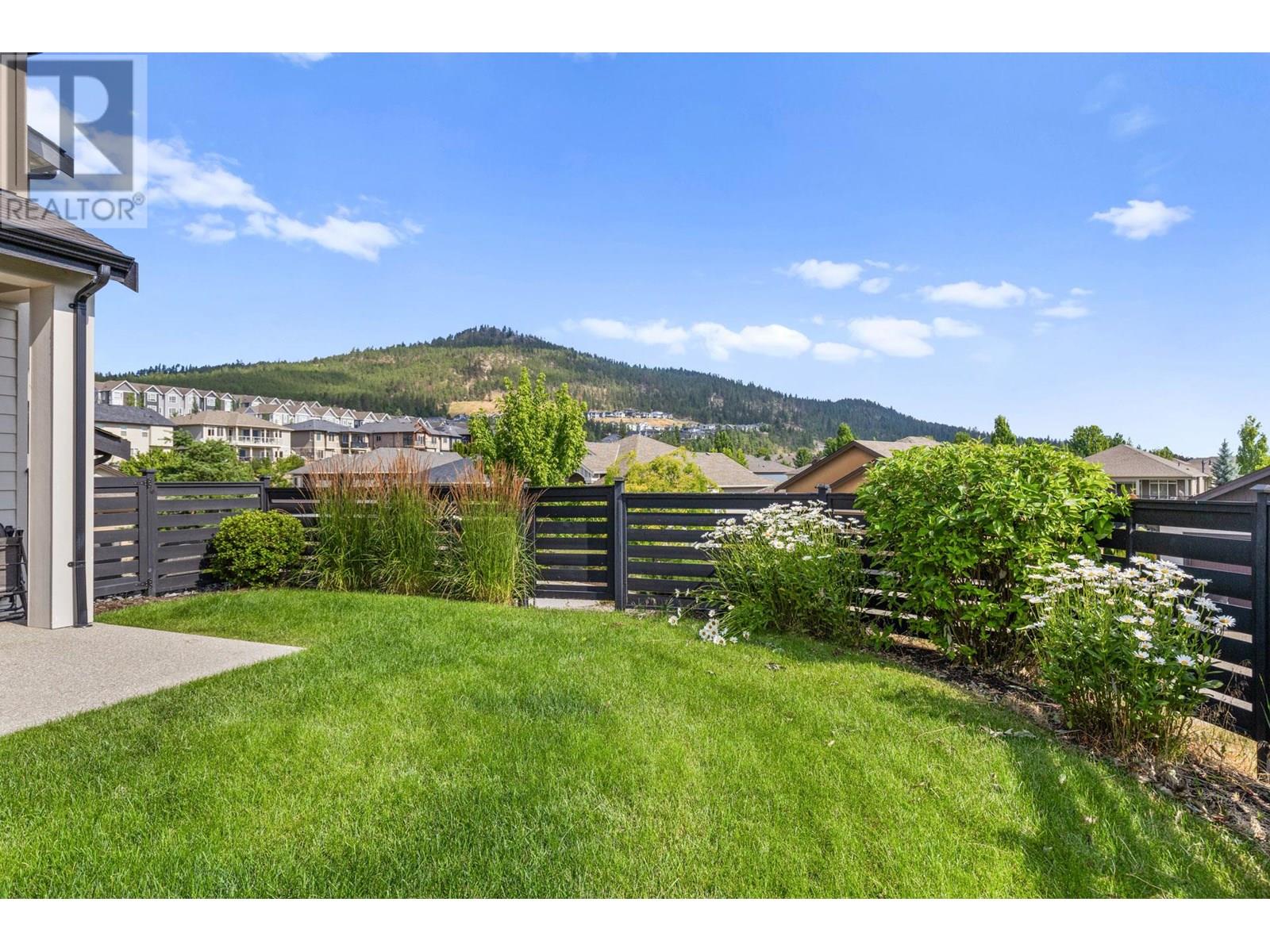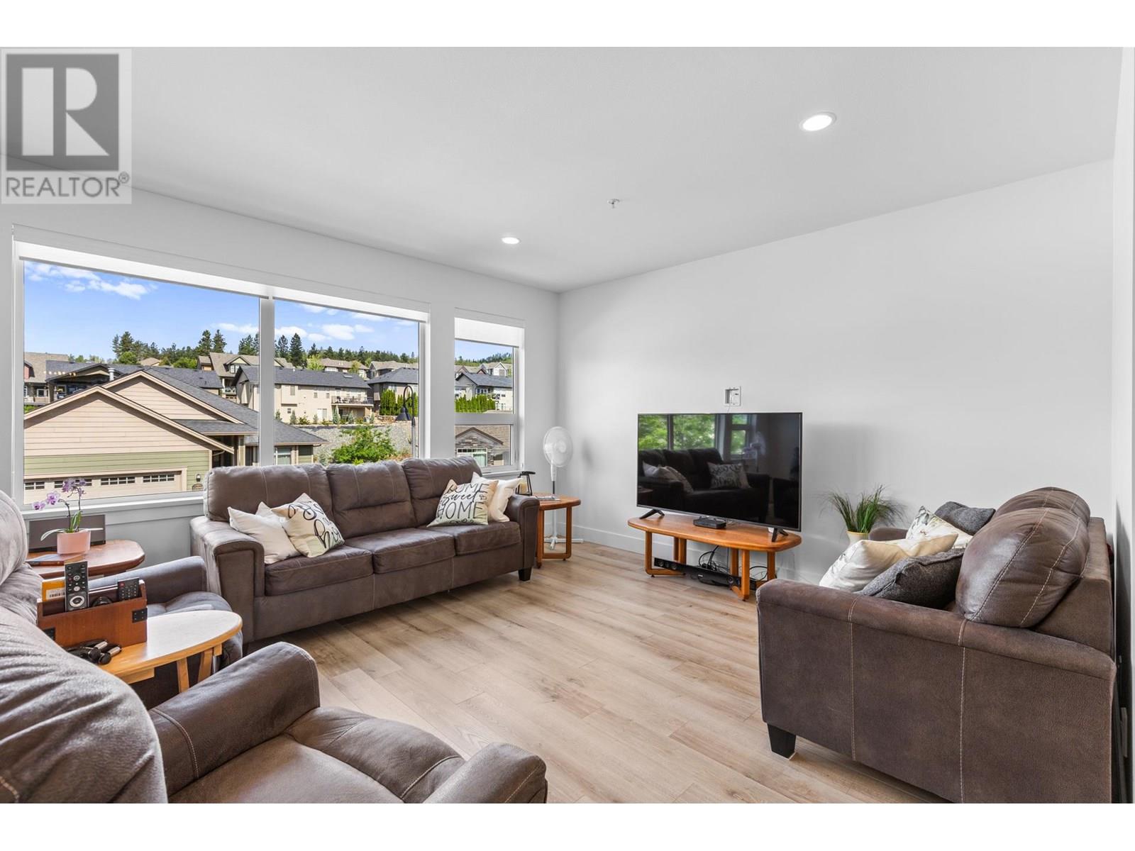 Bright & Modern End Unit in Rockridge at The Lakes. A vibrant and family/pet friendly townhome community in the heart of Lake Country. This stylish 3-bedroom + den/flex, 3-bathroom end unit offers the perfect blend of space, functionality, and comfort. Flooded with natural light, the main floor showcases a modern open-concept design with large windows throughout. The kitchen is a true highlight, featuring quartz countertops, a gas range, sit-up island, and cozy eating nook. The layout flows seamlessly into a spacious dining area and bright living room—perfect for everyday living and entertaining. Step out from the kitchen to your private, elevated backyard oasis with panoramic Eastern Mountain views. With no units directly behind, you’ll enjoy added privacy along with a gas hookup, power, and water connection. Upstairs you’ll find three well-appointed bedrooms, including a generous primary suite with a 4-piece ensuite. The laundry is conveniently located on this level as well. The lower level adds valuable flexibility with a den/flex room – perfect for a home office, gym, or guest space. Additional features include a double car garage, a full-length 26 ft driveway that easily accommodates most vehicles, and close proximity to visitor parking—making hosting friends and family a breeze. This home truly has it all—modern comfort, unbeatable functionality, and a fantastic location. (id:21321)