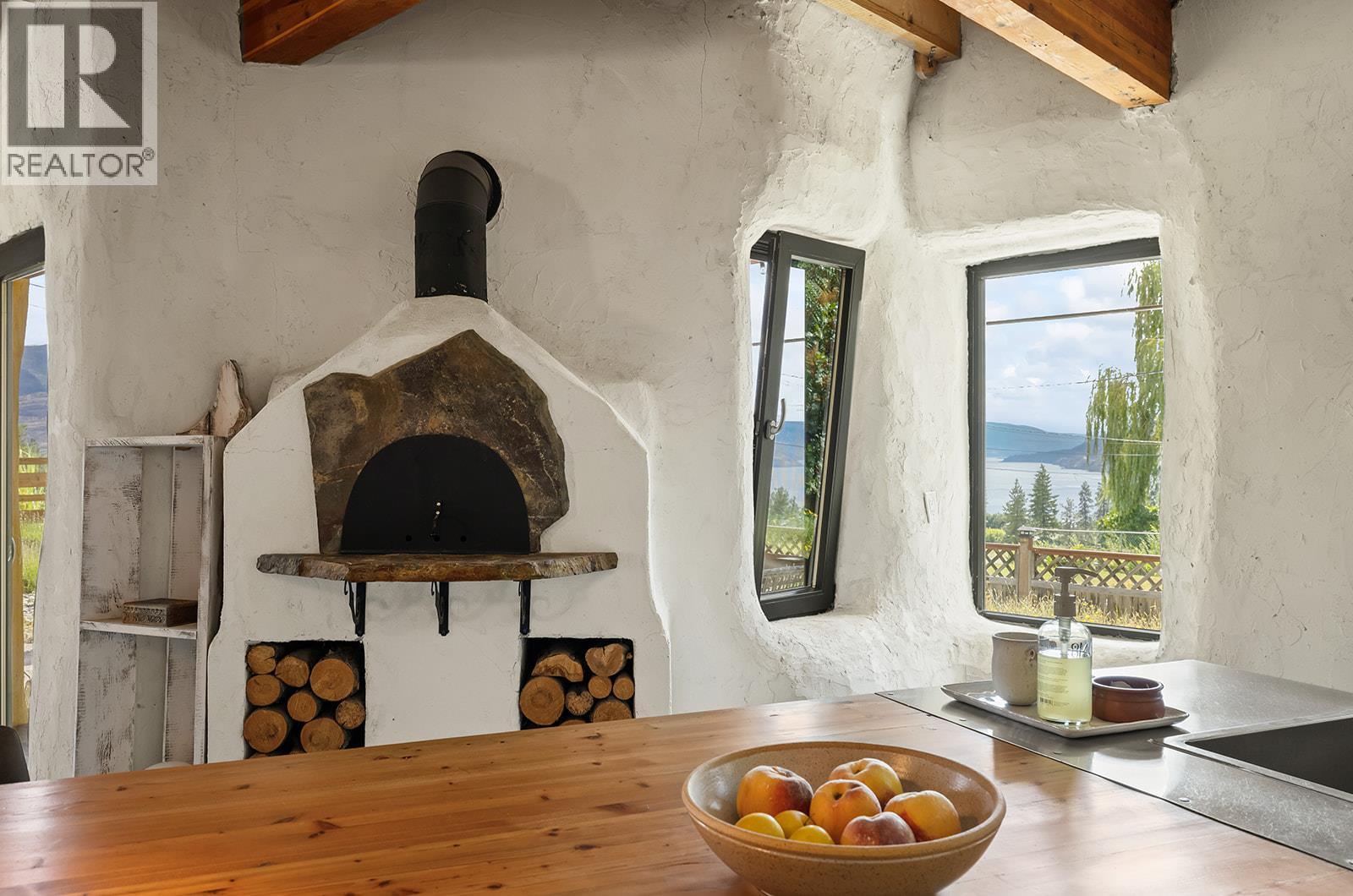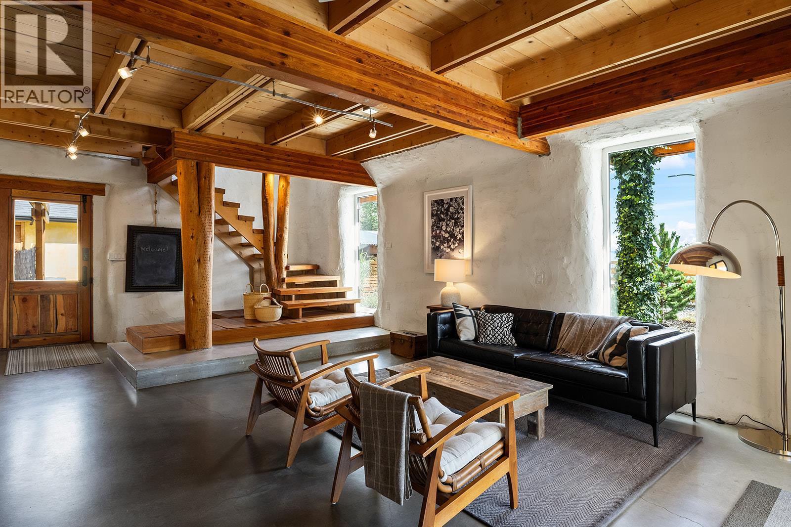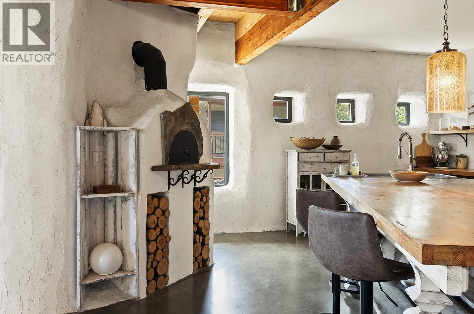 This one of a kind timber-frame straw-bale home blends architectural beauty with exceptional energy efficiency. Thoughtfully designed and extensively upgraded, this residence delivers remarkable heat retention and year round comfort with extremely low operating costs, averaging just three cords of wood annually for heating. The home features a Blaze King wood stove with long burn times, hydronic in floor heating on the main level, dual heat pumps for heating and cooling, and high performance tilt turn Innotech windows and doors. The ICF concrete slab, 18 inch straw bale walls, and reclaimed wood flooring naturally regulate temperature throughout the home, with upper level floors back beveled to allow warm air circulation. The kitchen showcases a wood fired Forno pizza oven, massive eat up island and apron sink, while the spa inspired main bathroom offers a 2025 tiled walk in shower, bidet, and in floor heat. Outdoors you will find a large covered patio, solar heated saltwater lap pool, veranda, newer fencing with custom metal caps, and a durable metal accented exterior. Major updates include a 2018 roof and eavestroughs, 2019 Duradeck upper deck, 2024 heat pump, and sewer brought onto the property with connection at the lot line. The property may support a future double garage with carriage house, buyer to verify. Built by the original owner with a passion for sustainable living, this is a rare opportunity to own a highly efficient and beautifully crafted home. (id:21321)