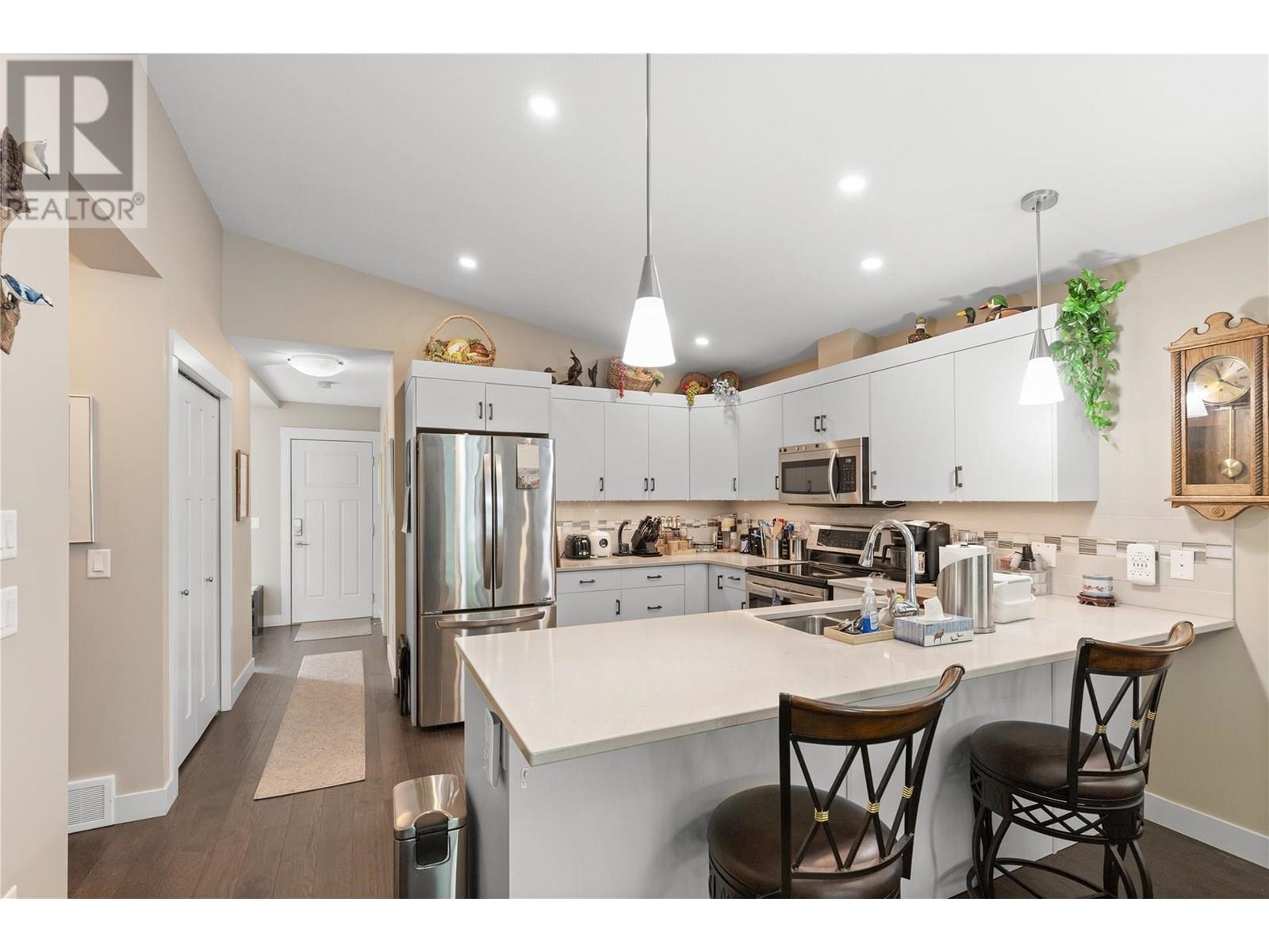 Welcome Home to Barnard’s Village. Stylish, Comfortable, and Move-In Ready! Discover modern living at its finest in this 2-bed, 2-bath manufactured home, located in the highly sought-after Barnard’s Village community. Thoughtfully designed with a blend of comfort and contemporary finishes incl. hardwood flooring, this home offers a spacious layout ideal for easy, low-maintenance living. The open-concept kitchen features upgraded cabinetry with pull-outs, quartz countertops, S/S appliances, and a convenient breakfast bar, perfect for casual dining and entertaining. The living room features a vaulted ceiling and flows seamlessly through a set of french doors to a very private north-facing patio, offering the ideal space to relax and enjoy the outdoors. The primary bedroom is a true retreat with a walk-in closet and ensuite featuring a walk-in shower and double vanity. A 2nd bedroom and full bath provide comfort and privacy for guests or family. Additional highlights include a double garage, and low-maintenance landscaping and detached garden / storage shed. The driveway and front concrete surfaces have all been refinished with a visually appealing and practical Polyguard finish. Located just steps away from north end shopping, restaurants, and amenities, this home offers the perfect balance of lifestyle and location. Whether downsizing, buying your first home or seeking affordable luxury in a vibrant community, this is the one you've been waiting for. Don’t miss your chance – book a showing today! (id:21321)
