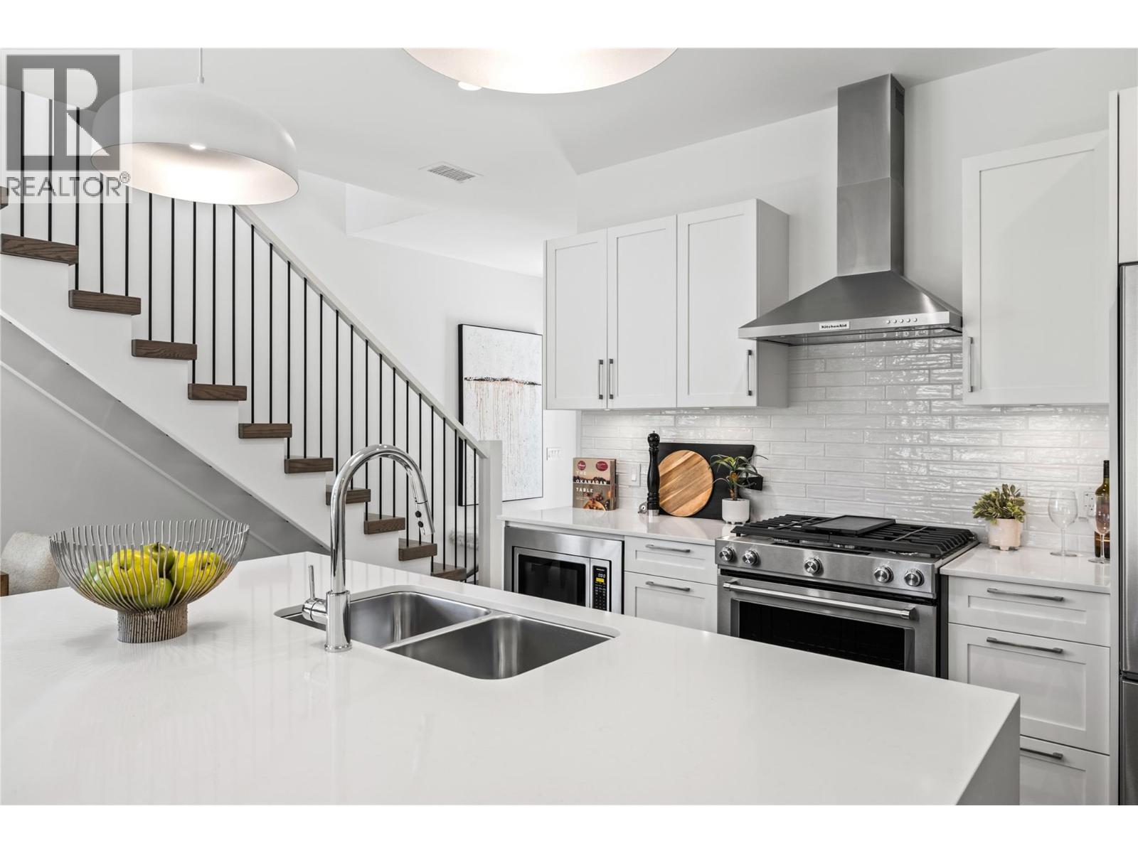 Priced to Sell. Move In Now. Last remaining homes starting from $799,900. This is your best opportunity to Live Where You Play. Located along the 18th hole at the Quail Golf Course, these award-winning townhomes ensure you can live the Kelowna lifestyle, with golf at your doorstep. Quiet but convenient location near YLW, UBC-Okanagan and the growing University/Airport district shopping/dining area. Approx.1,950 sq ft, featuring your primary bedroom on the main floor, with two additional bedrooms and a den/flex area upstairs. Designer details including the open tread wood staircase, German-made laminate flooring on the main floor, LED lights and an open floorplan. The kitchen includes KitchenAid appliances, 5-burner gas stove, quartz countertops, waterfall island with storage on both sides, and shaker cabinetry with under cabinet lighting. Your living extends outside to your covered patio with natural gas bbq hook up and Lake Views. Plus, take advantage of BUYING NEW with PTT Exemption of approx $13,998 (conditions apply). Photos & virtual tour may be of a similar home in the community. Showings by appointment. Move In Now.