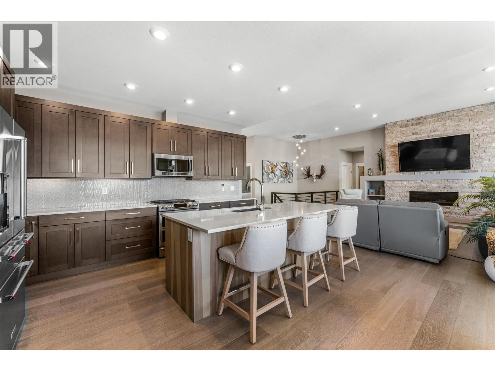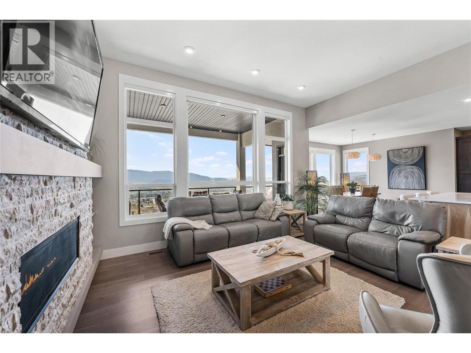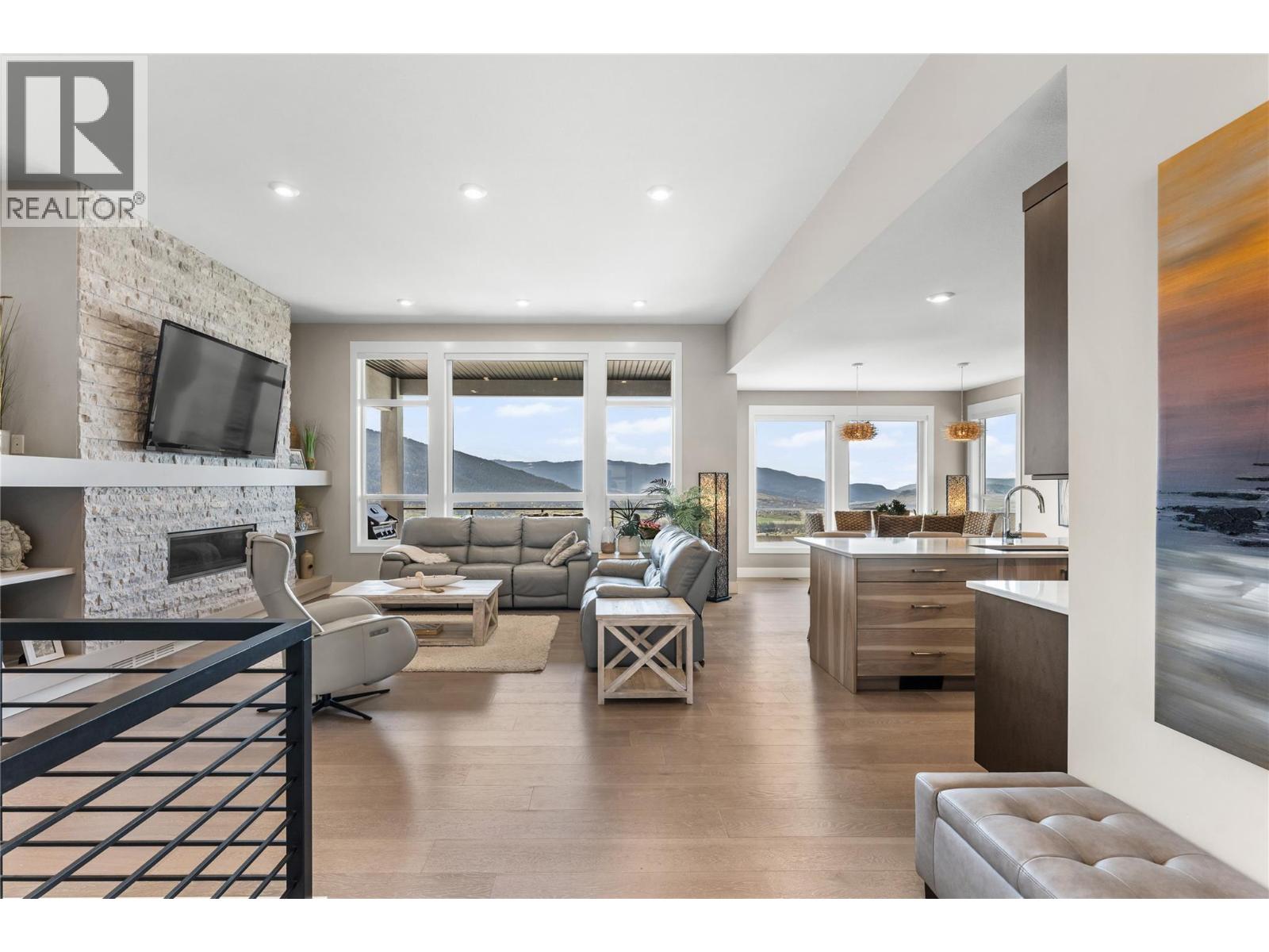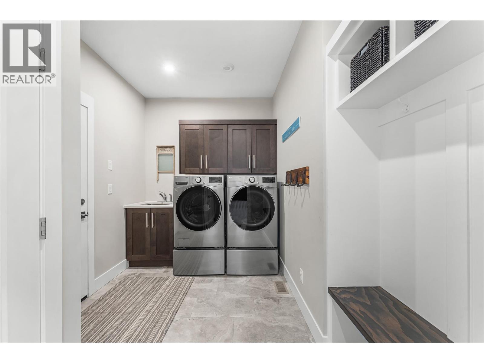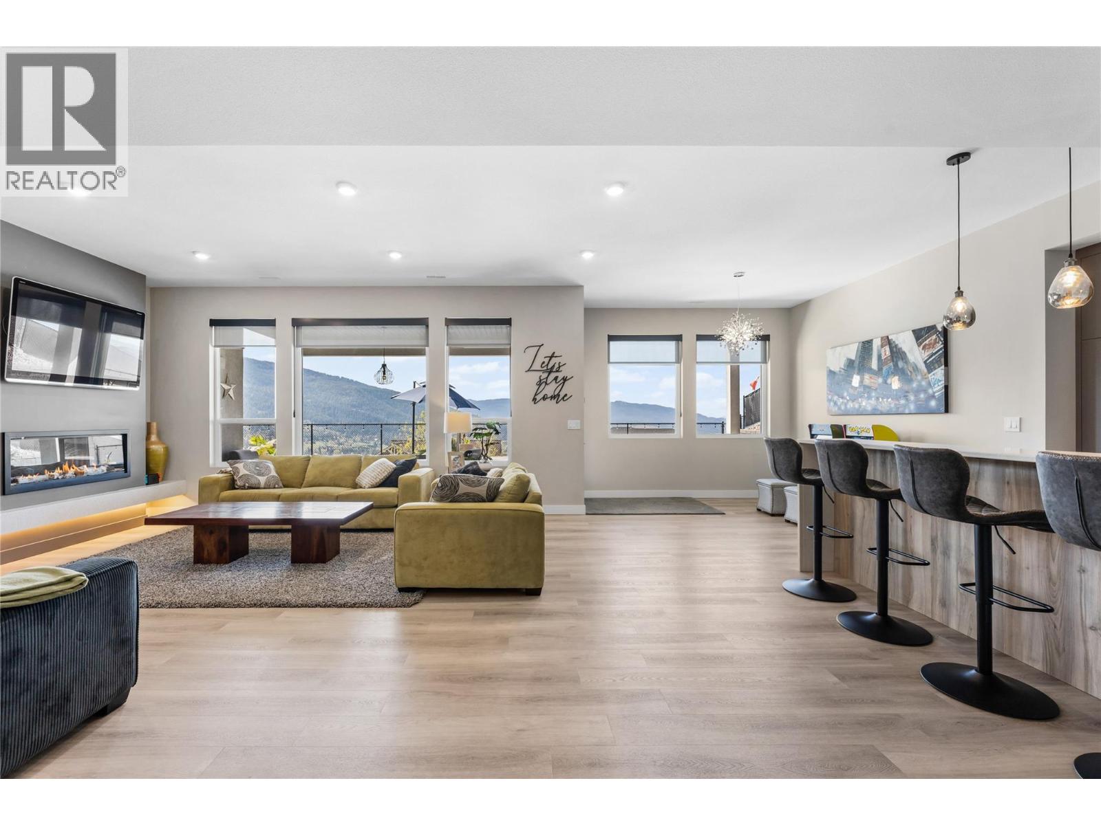 What most people envision for their dream Okanagan lifestyle; this contemporary home is designed to take full advantage of its elevated setting, with striking views of the surrounding mountains, lakes, and valley. The main floor features an open, airy layout with 11-foot ceilings, expansive windows, and direct access to a large covered deck ideal for morning coffee or maybe an evening glass of wine from a local Okanagan winery. The kitchen blends form and function with quartz countertops, stainless steel appliances, and clean-lined maple cabinetry. The primary bedroom offers a peaceful retreat with a walk-in closet and ensuite, complete with a freestanding soaker tub and custom tiled shower. An oversized second bedroom, a versatile den or third bedroom, and a well-appointed laundry room with built-in bench and storage round out the main level. Downstairs, the walk-out lower level with 10-foot ceilings provides exceptional flexibility, featuring a media room, games area, gym, wet bar, additional bedroom and spa inspired full bathroom. Outdoors, the fully automated saltwater pool with new liner and safety cover is paired with low-maintenance Synlawn turf and a custom storage shed. An oversized double garage and generous extra parking accommodate vehicles, trailers, boats, or RVs. You can be on the ski hill, hiking trails, golf course or lake all within a short drive from home. (id:21321)