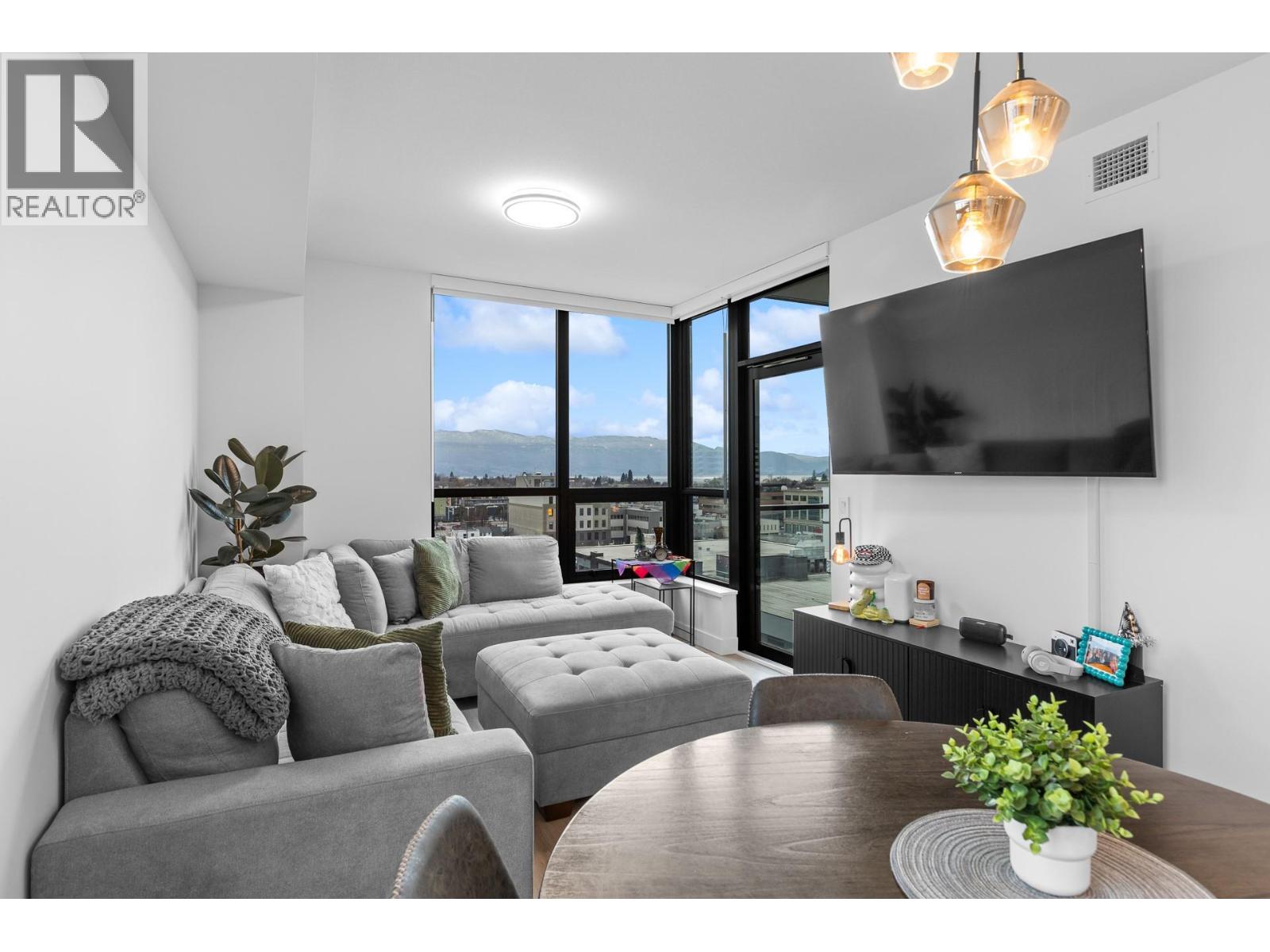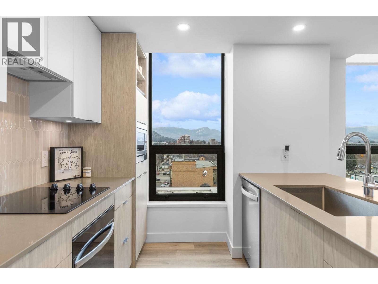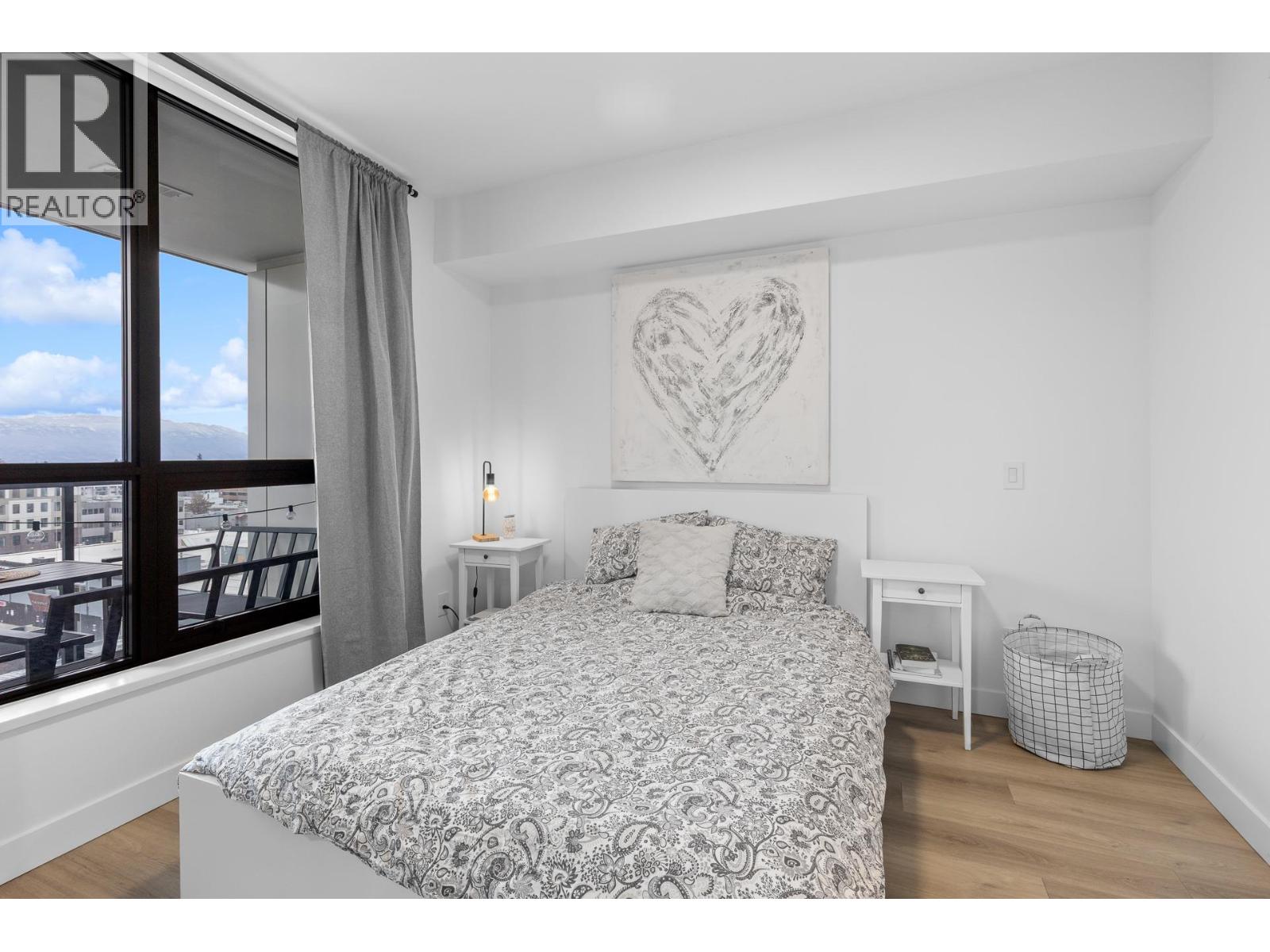 Welcome to Bertram, where elevated living meets an effortless lakeside lifestyle. This beautifully appointed corner unit offers two bedrooms and two bathrooms and is ideally positioned to capture sweeping lake views, abundant natural daylight, and stunning sunsets. Completed in 2024, this residence is wrapped in expansive windows that fill the home with sunshine throughout the day while showcasing views of Lake Okanagan, the city skyline, and surrounding valley. The thoughtfully designed split-bedroom layout provides excellent privacy, while the open-concept living and dining areas create a seamless flow for both everyday living and entertaining. The contemporary kitchen features quartz countertops, stainless steel appliances, and clean modern cabinetry, delivering a timeless and functional design. Step out onto the covered balcony to enjoy morning coffee or unwind in the evening as the sun sets over the lake. Residents of Bertram enjoy an impressive collection of resort-style amenities, including a rooftop heated pool and spacious hot tub with panoramic 360-degree views, outdoor BBQ and lounge areas, bocce ball court, community gardens, fully equipped fitness centre, dog run and dog wash station, secure bike room, and multiple indoor lounges and work-from-home spaces. This home includes one secure parking stall and a private bike locker. (id:21321)