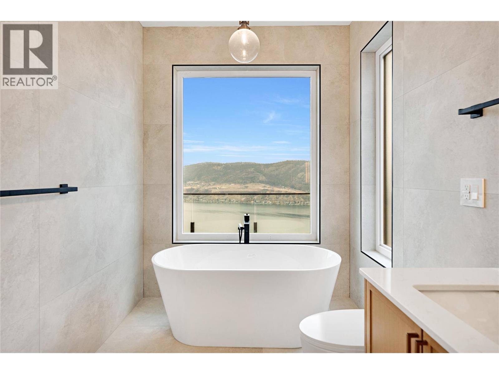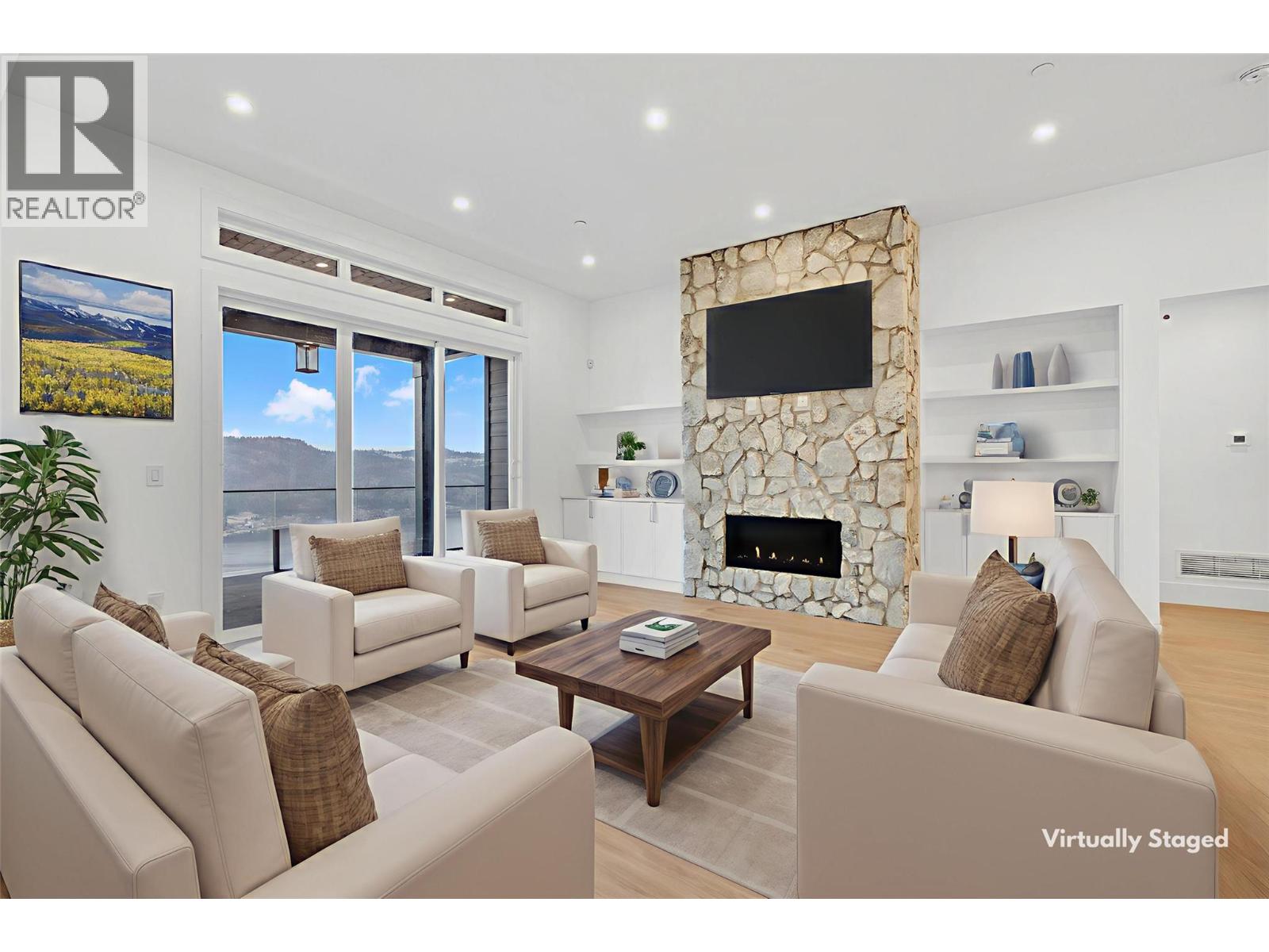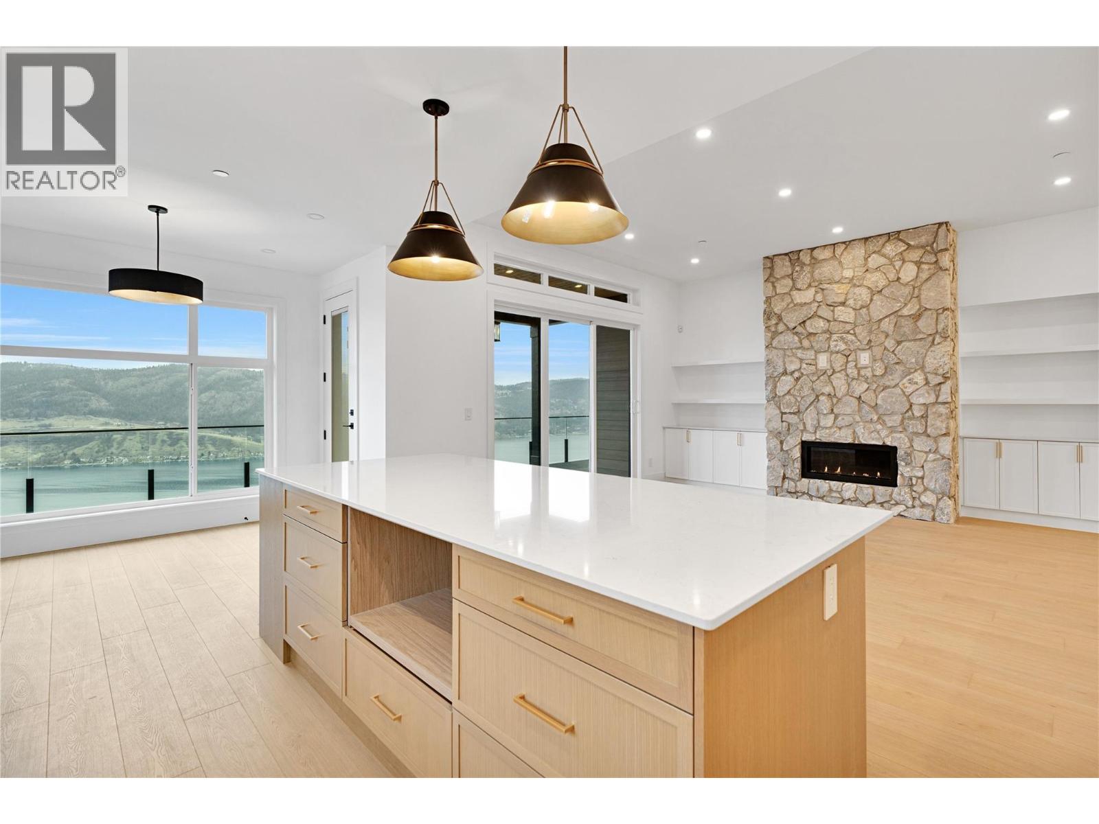 *Kitchen + laundry appliances, outdoor decking topper, and security + control 4 system will be installed, and are included in the purchase price.* Be the first to experience this exceptional new build in the prestigious Adventure Bay community, enhanced with premium upgrades. This stunning three-level home showcases panoramic Okanagan Lake views from every floor. The top level features an open-concept kitchen, dining, and living area with expansive windows and a contemporary gas fireplace with stone surround and framed built-ins. The gourmet kitchen offers rich wood and white shaker cabinetry, stone countertops, a large centre island, and a convenient pot filler. The main-level primary suite boasts a walk-in closet, luxurious ensuite, and access to a covered patio perfect for lakeside dining. The mid-level includes three bedrooms, two full bathrooms, first wet bar, a second balcony, and a striking stone-clad wine room. The lower level features a generous bonus rec room living area, plus full bath, with seamless yard access, as well as a custom second wet bar, ideal for entertaining. Adventure Bay residents enjoy exclusive access to a private beach, tennis courts, and scenic trails. Refined style, premium finishes, and breathtaking lake views define this extraordinary Vernon home. (id:21321)