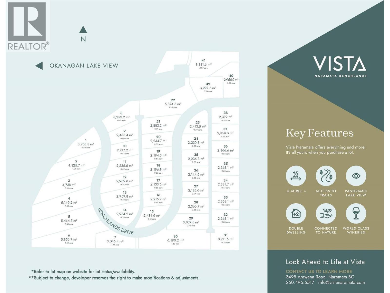 Discover a rare opportunity to own a 1.52-acre lot nestled in the forested landscape of the Naramata Bench - one of the South Okanagan’s most sought-after destinations, celebrated for its sweeping lake views, sprawling vineyards, and world-class wineries. Lot 30 offers privacy and is ideally situated at the top of the Vista Naramata Benchlands development. VISTA Naramata Benchlands is not a strata development. 15 of 41 lots are remaining. This vacant lot provides the flexibility to design and build your custom home, with no time constraints to begin building, making it a perfect chance to secure one of the most beautiful lots in the community. Each lot in the development is zoned for a secondary dwelling, offering the potential for a carriage home, guest suite, or short-term rental. Enjoy panoramic views of Okanagan Lake and easy access to scenic trails and outdoor recreation right from your doorstep. Just minutes from schools, local shops, and the charming village of Naramata, this neighbourhood offers the perfect balance of tranquility and convenience. Whether you’re imagining a modern Okanagan estate or a cozy lake house retreat, this property is a stunning canvas for your dream home. All measurements are approximate. (id:21321)